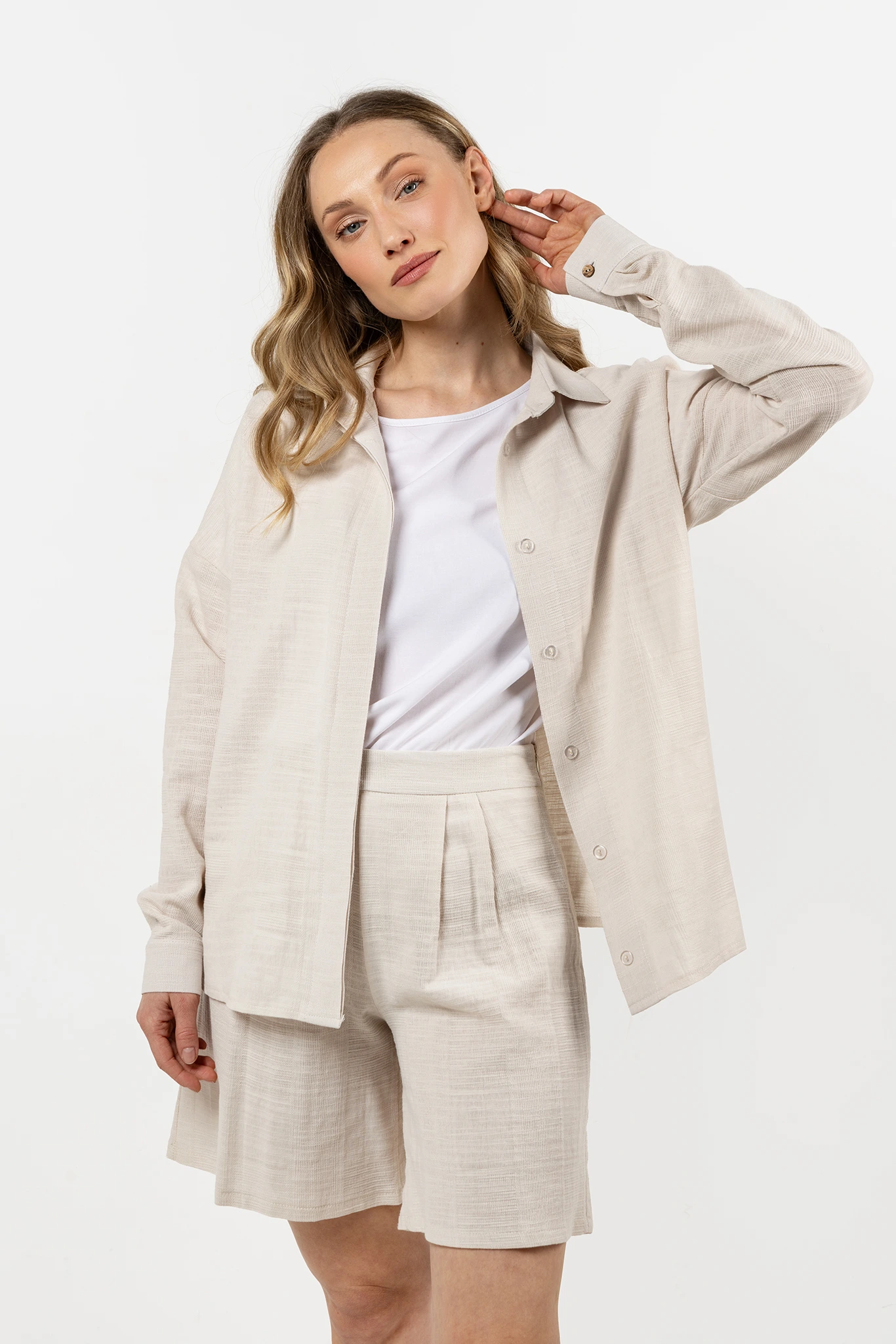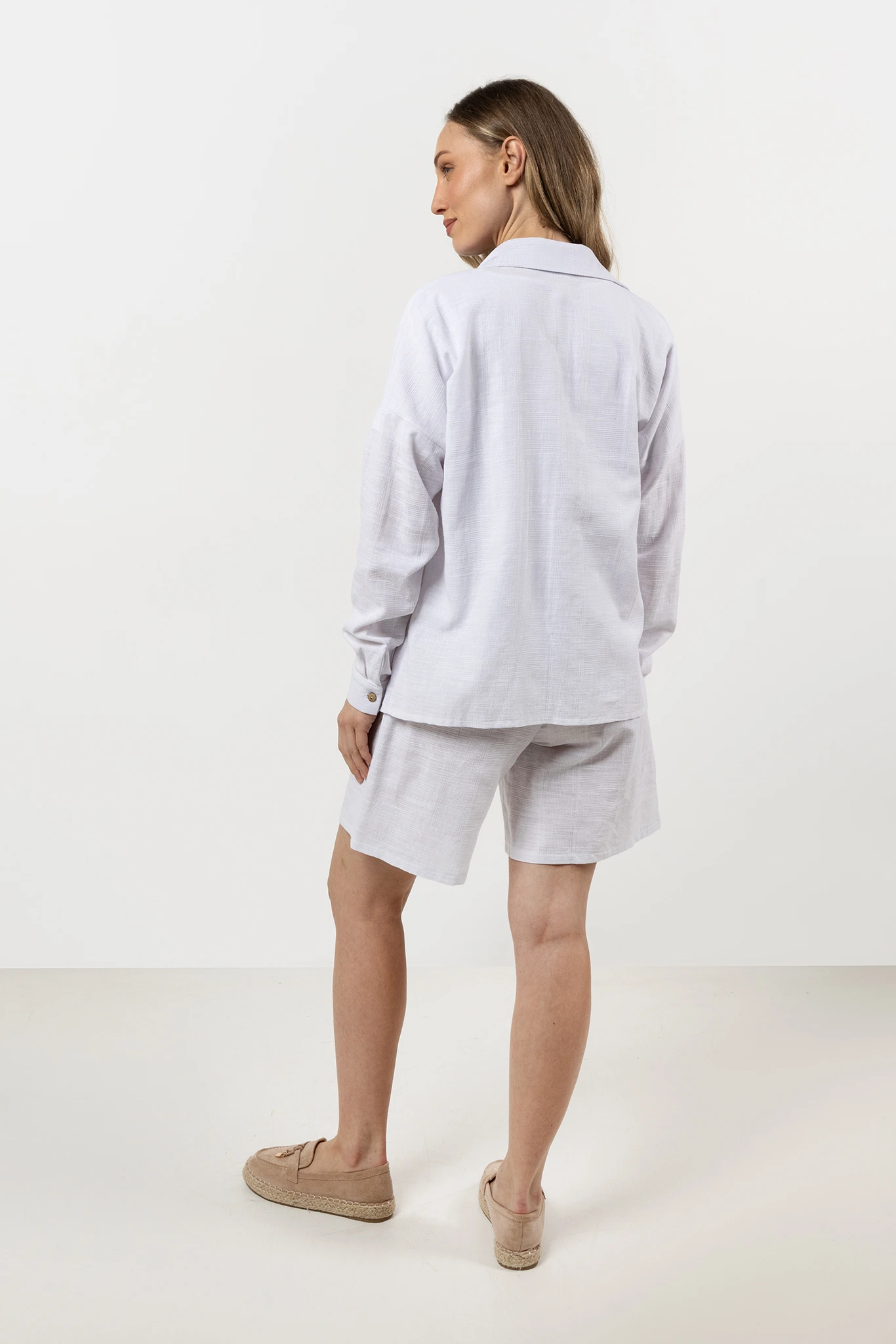 Zapinana na rząd guzików, pozwala na noszenie zarówno w wersji rozpiętej, jak i klasycznie zapiętej pod szyję. Lekko obniżona linia ramion dodaje całości swobodnego charakteru, a przedłużony fason umożliwia wszechstronne stylizacje – świetnie wygląda zarówno wpuszczona w spodnie czy spódnicę, jak i noszona luźno.