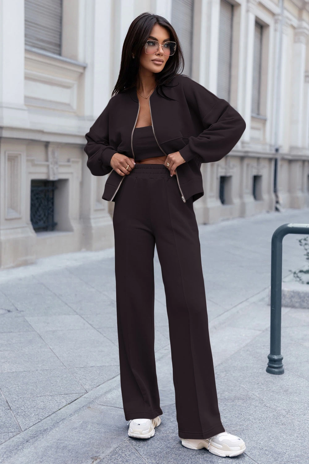 Damski komplet dresowy z bomberką to stylowe połączenie wygody i modnego designu, które świetnie sprawdzi się zarówno na co dzień, jak i podczas bardziej wyjątkowych okazji. Wykonany z materiałów najwyższej jakości, zapewnia komfort noszenia przez cały dzień, nie rezygnując przy tym z modnego wyglądu. Górna część kompletu doskonale podkreśla sylwetkę, a spodnie o luźnym kroju gwarantują swobodę ruchów i lekkość. To zestawienie tworzy harmonijną całość, idealną na spacer po mieście lub spotkanie z bliskimi. Komplet łatwo połączyć z innymi elementami garderoby, co czyni go niezbędnym dodatkiem w szafie każdej kobiety.