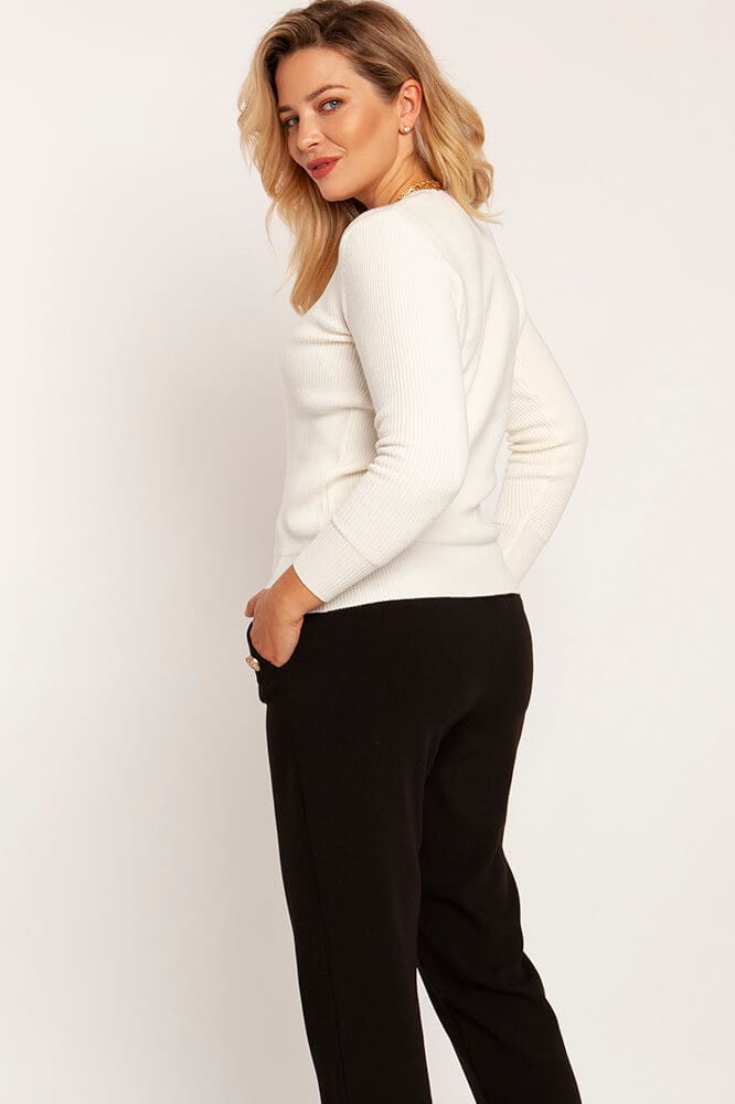 Dopasowany sweter z dekoltem w serek to jedna z klasycznych oraz niezwykle uniwersalnych propozycji, które z powodzeniem wplatać będziesz w stylizacje na wiele okazji. Delikatnie podkreślający sylwetkę krój doskonale prezentować będzie się w formalnych zestawieniach z marynarką, a niewielki dekolt w serek pozostawi przestrzeń do ozdobienia obojczyków eleganckim naszyjnikiem z wisiorkiem. Oprócz doskonałej prezentacji sweterek spełniać będzie również praktyczny aspekt, gdyż prążkowana dzianina nie zapomni o Twoim komforcie i poczuciu ciepła!