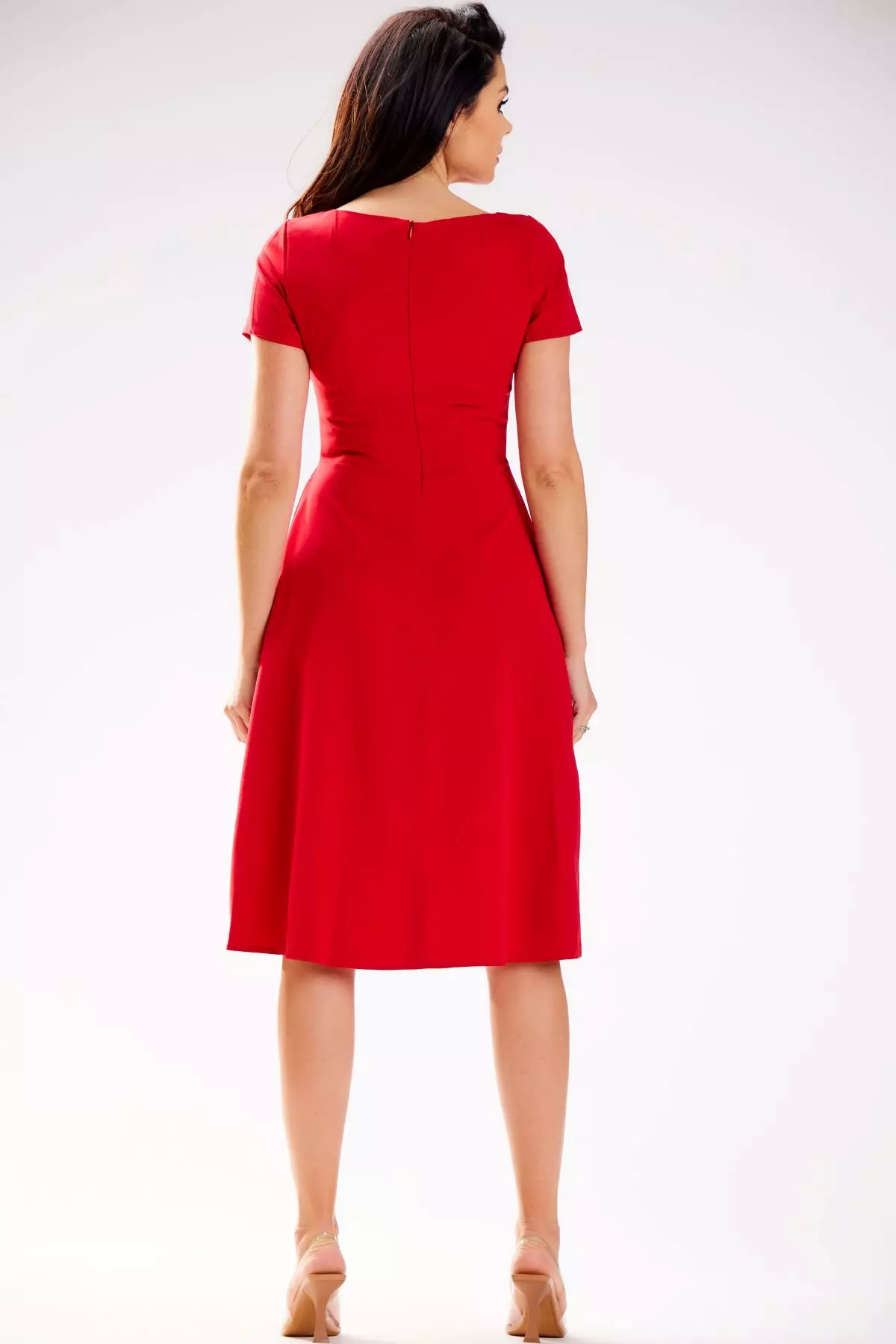 Elegancka sukienka midi z krótkim rękawem to klasyczna i stylowa propozycja, która doskonale podkreśli Twoją sylwetkę. Z dopasowaną górą i delikatnie rozszerzającym się dołem, sukienka prezentuje się wyjątkowo elegancko. Średnia długość zapewnia odpowiednią proporcję, a zabudowany dekolt w kształcie łódki dodaje subtelności. Zapinana z tyłu na kryty zamek, sukienka ma dodatkowe zakładki na talii, które nadają jej lekkości i oryginalności. To ponadczasowy model, który świetnie sprawdzi się na różnego rodzaju okazje, pozwalając Ci stworzyć wiele stylizacji z nutą klasy i wyrafinowania.