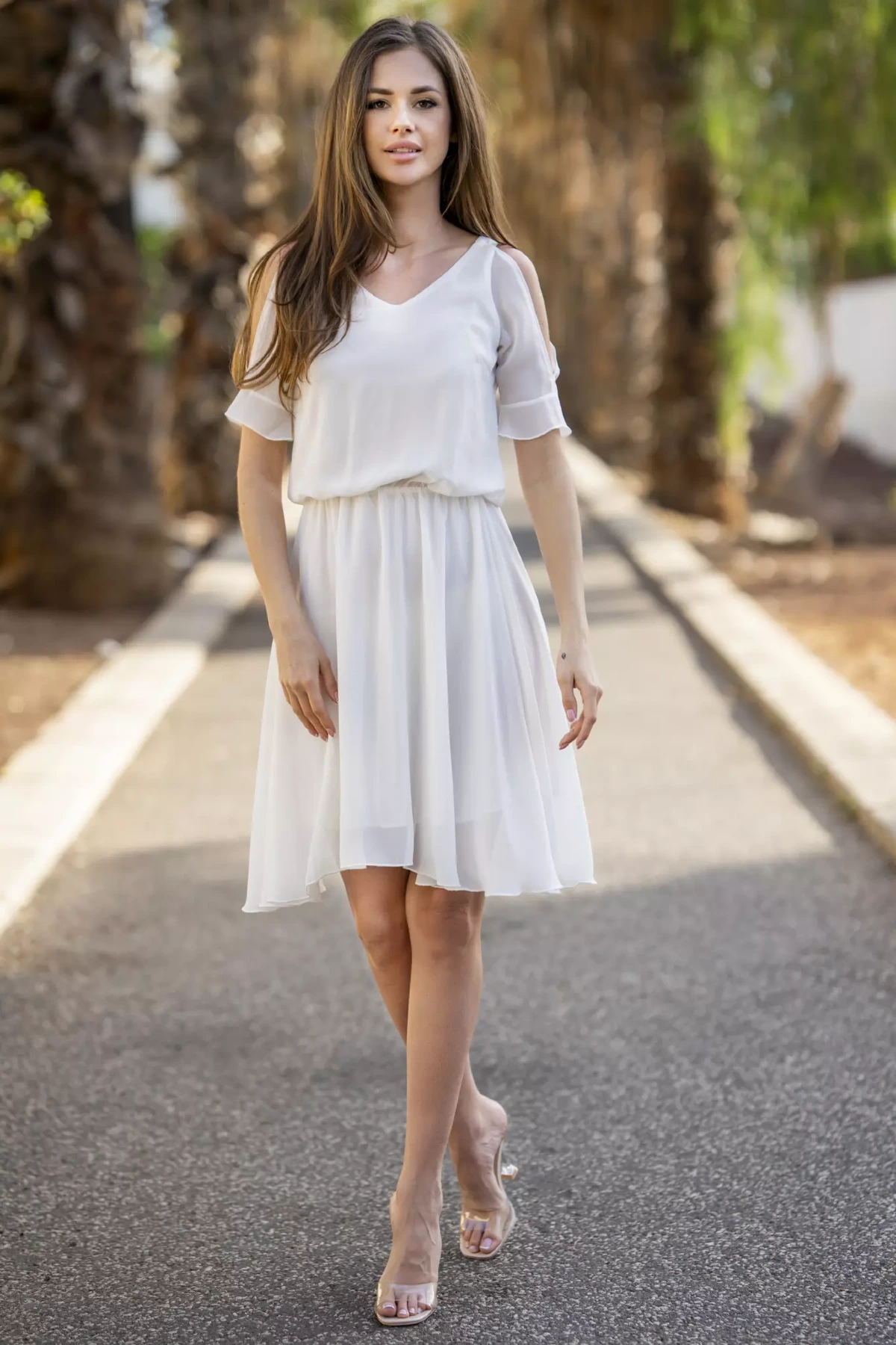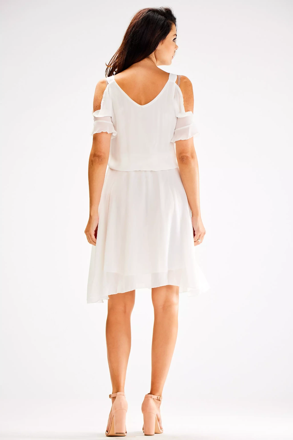 Elegancka sukienka z wycięciami i dekoltem V to kobieca opcja na wiosnę i lato. Jej luźny fason z subtelnym podkreśleniem talii idealnie modeluje sylwetkę. Spódnica midi z delikatnym marszczeniem swobodnie opada, zapewniając komfort i swobodę ruchów. Górna część sukienki z krótkimi rękawami i wycięciami na ramionach dodaje całości lekkości oraz nowoczesnego charakteru. Dekolt w kształcie litery V elegancko eksponuje szyję i dekolt. Wykonana z lekkiego szyfonu, sukienka jest idealna na ciepłe dni, a jej uniwersalny charakter sprawia, że sprawdzi się na różnorodne okazje, od codziennych spotkań po eleganckie wydarzenia.