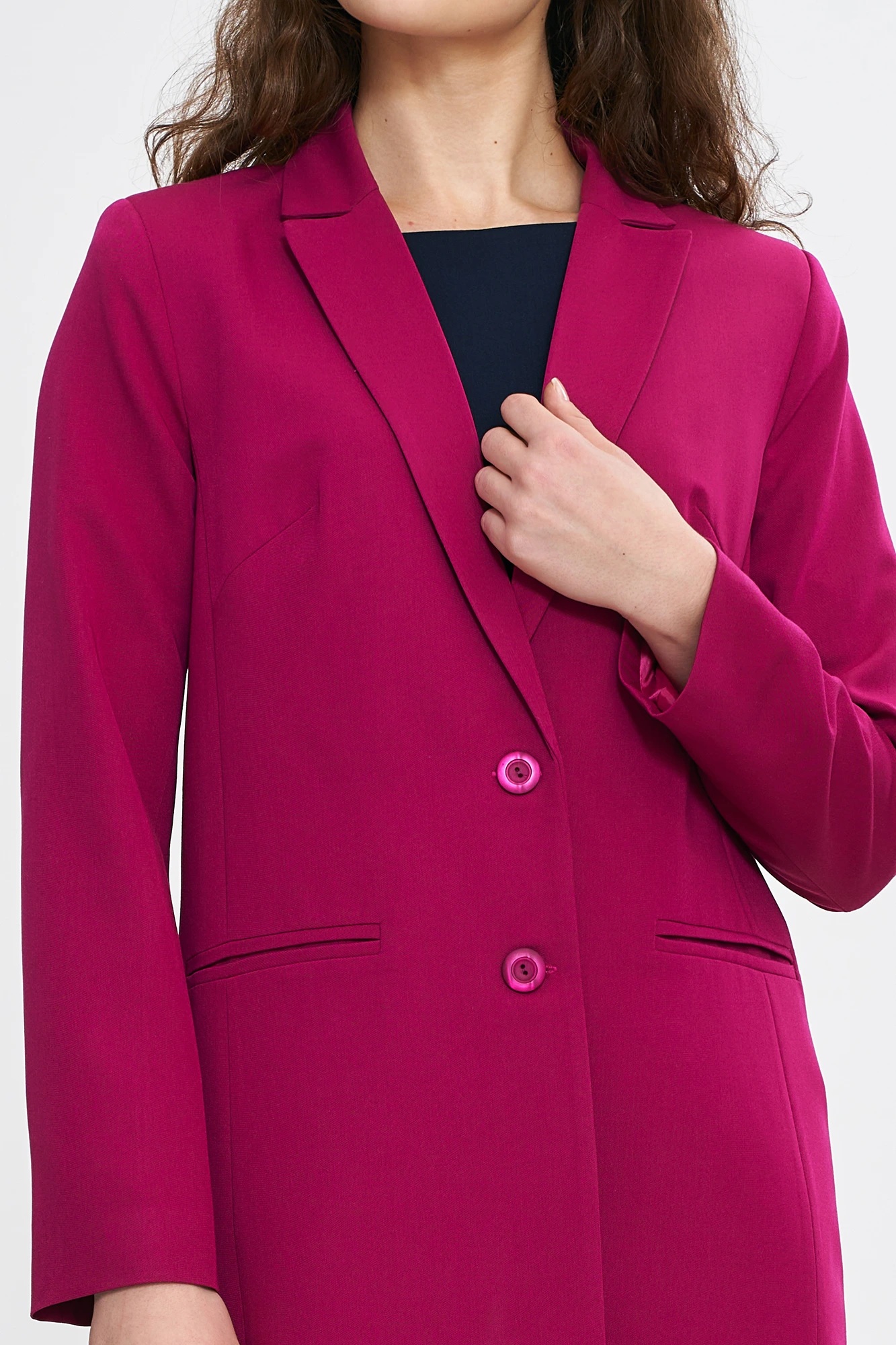 Fason z przedłużoną linią i delikatnie taliowanym krojem optycznie wysmukla sylwetkę. Klasyczne klapy i dwurzędowe zapięcie podkreślają elegancki charakter, a subtelne kieszenie z listwami dodają funkcjonalności bez zakłócania minimalistycznej estetyki.