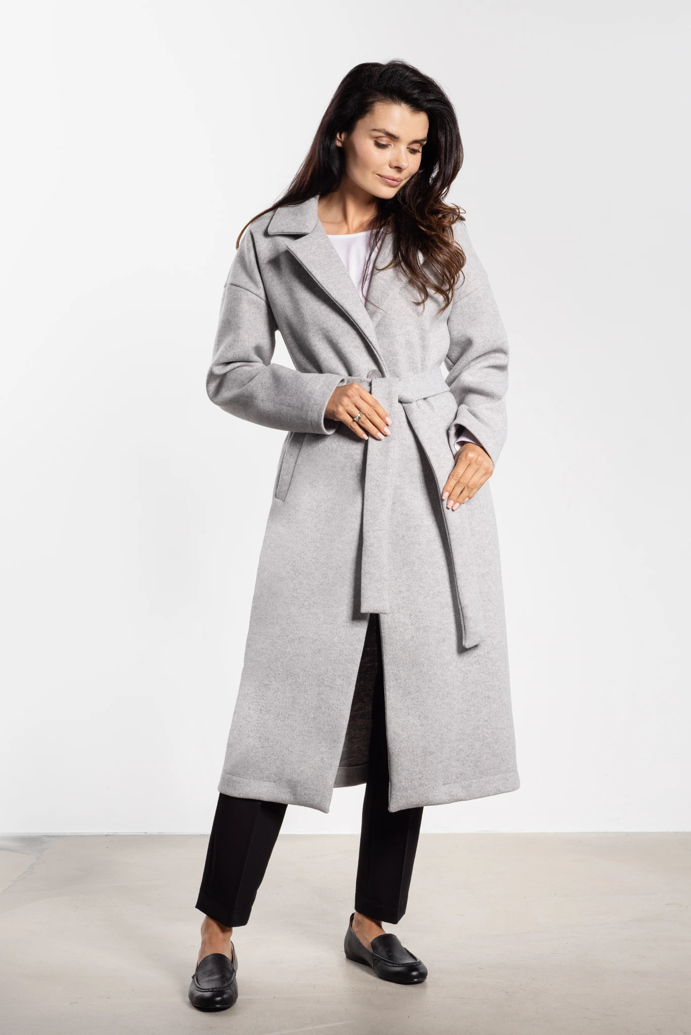 Elegancki długi płaszcz damski o prostym kroju z paskiem