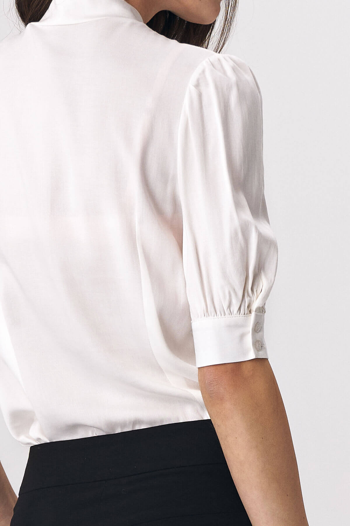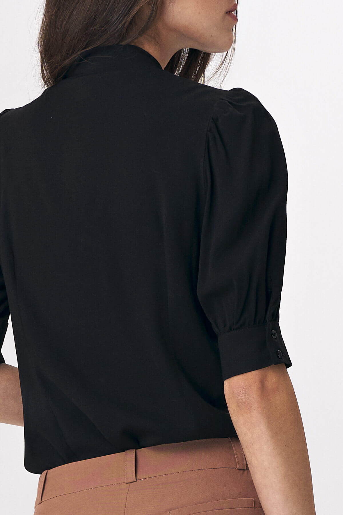 Formalna bluzka z modnym wiązaniem przy dekolcie, to model, który idealnie sprawdzi się na wszelkiego rodzaju spotkania biznesowe, bądź jako dopełnienie stylizacji do pracy. Posiada lekko bufiaste rękawy wykończone mankietami, zapinanymi na guziki. Uszyta z przyjemnego dla ciała materiału - wiskozy, która zapewni Ci wysoki komfort i wygodę podczas noszenia.