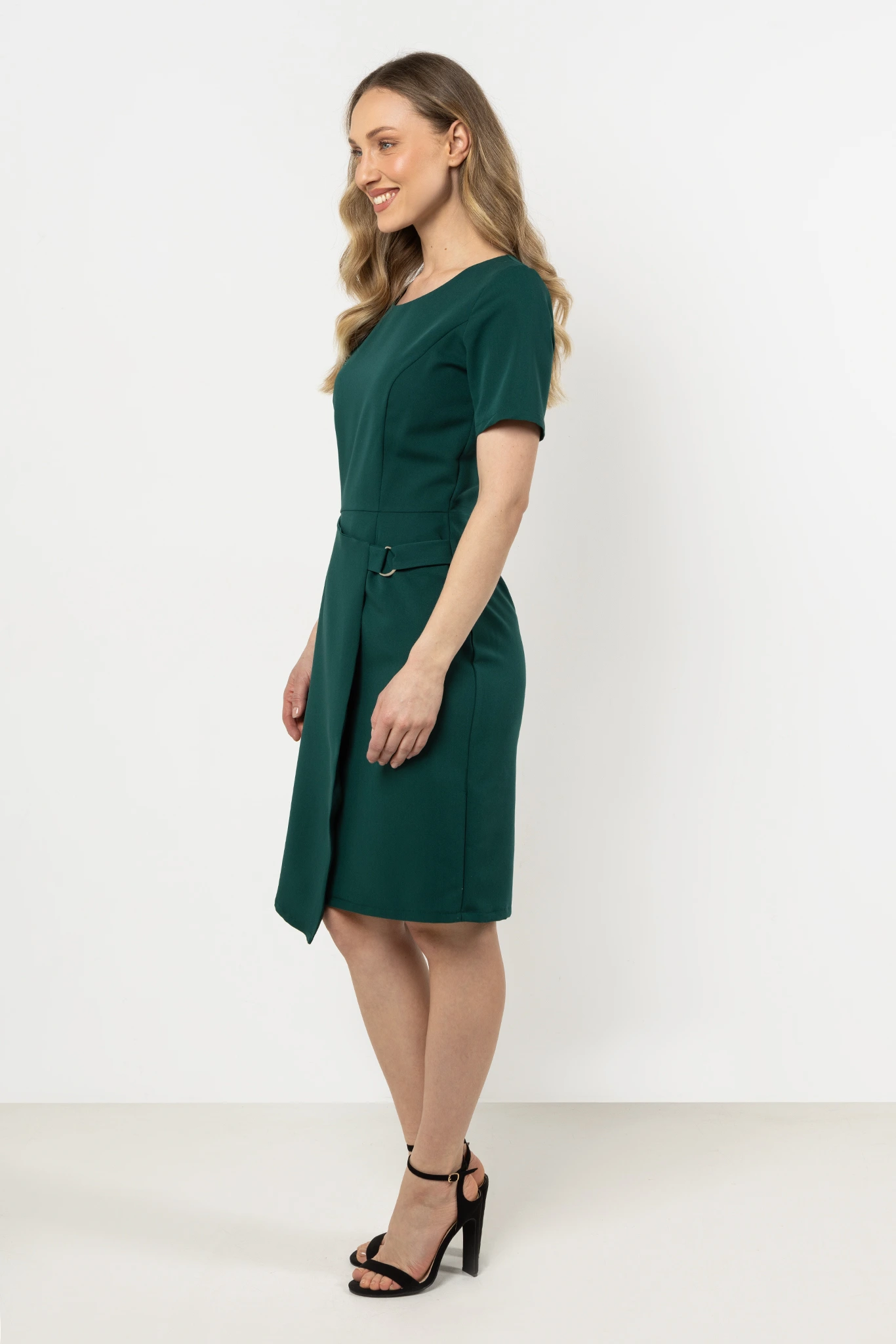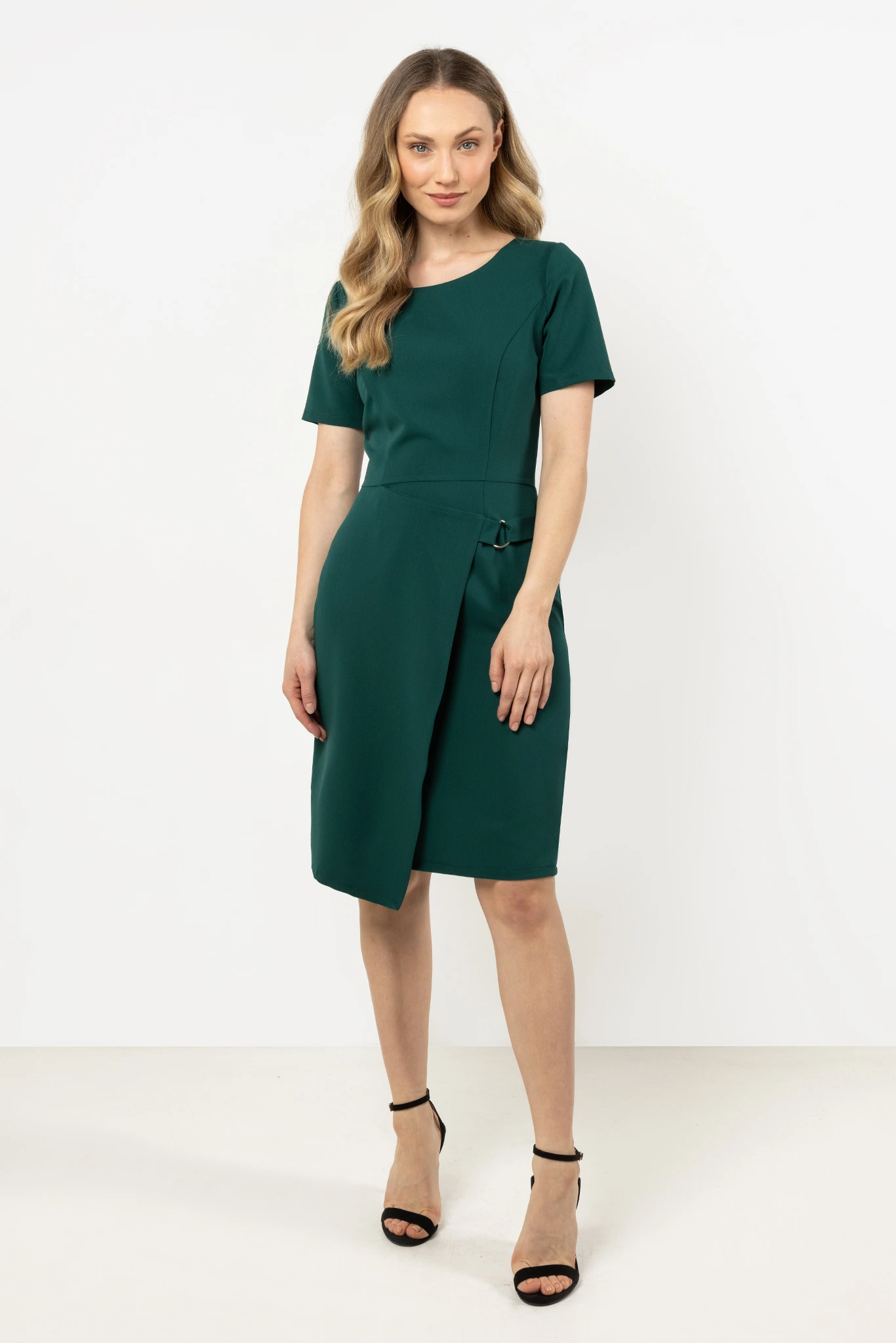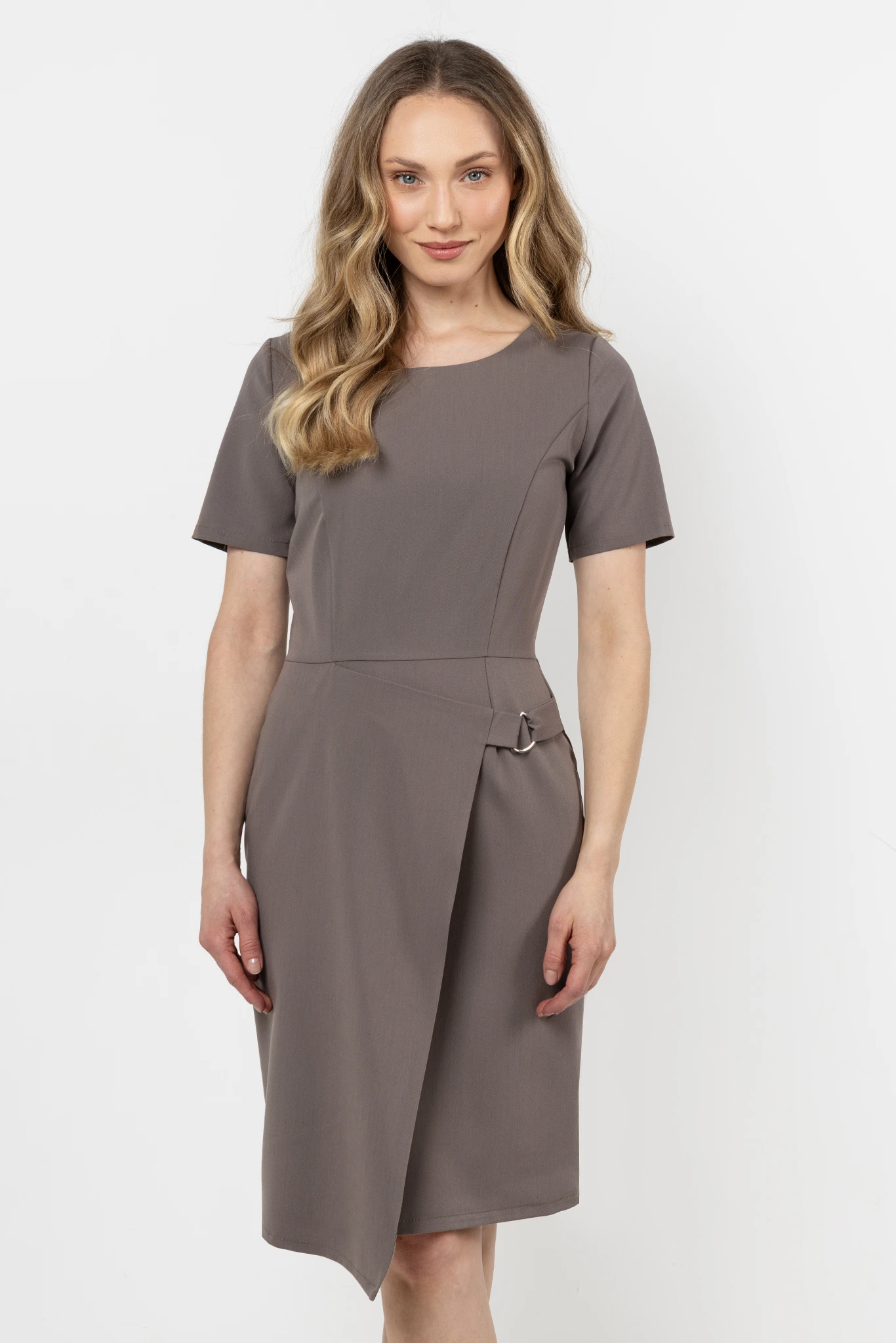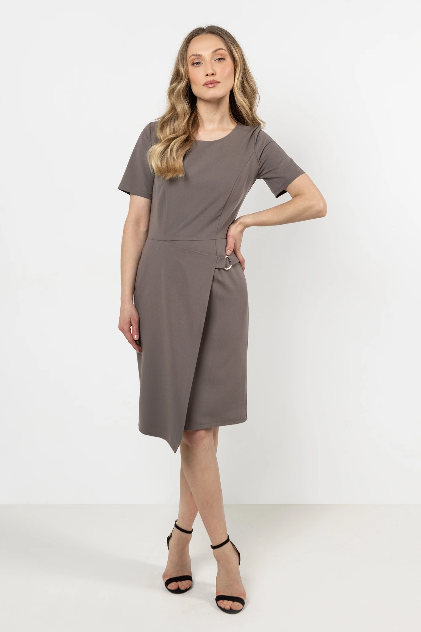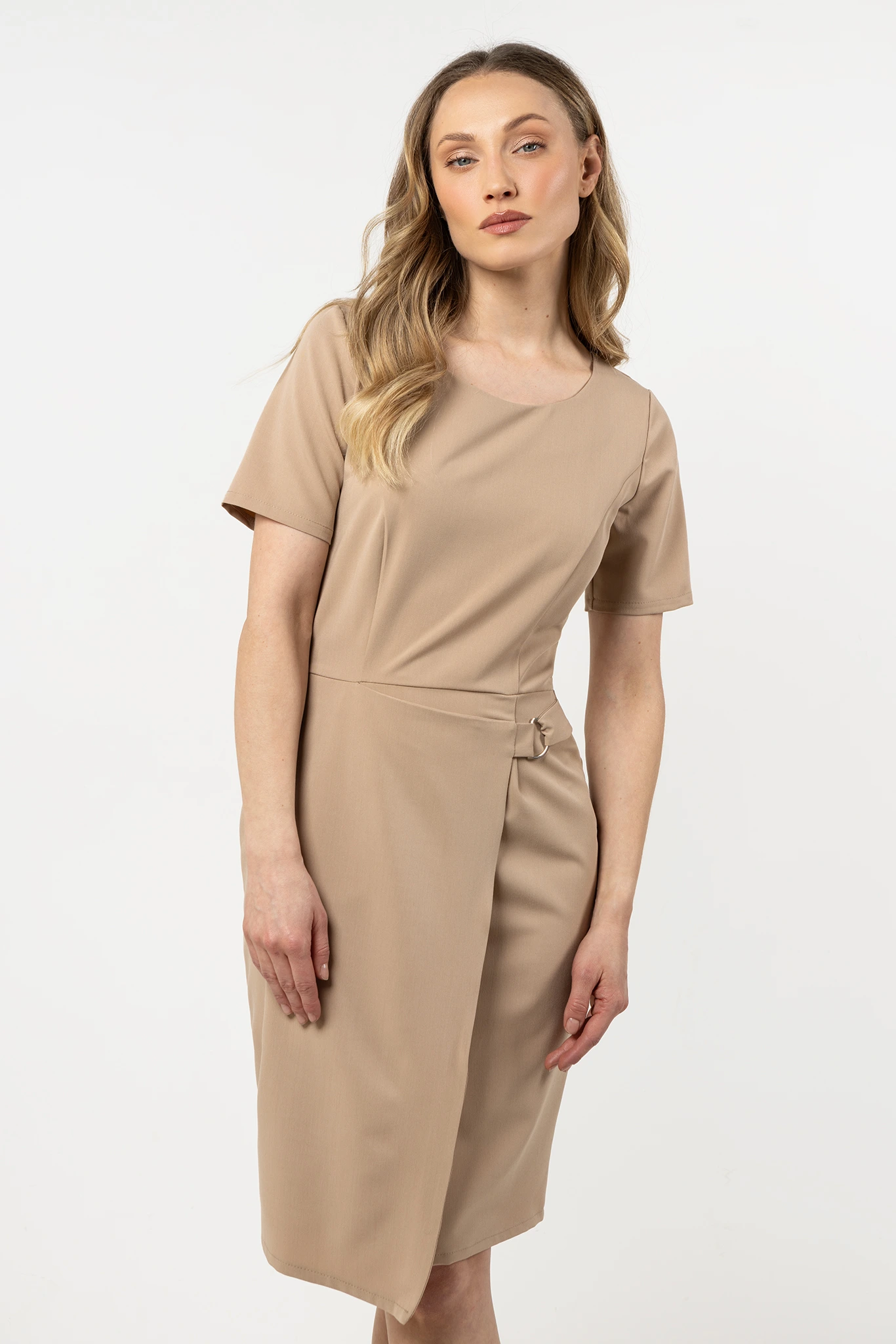 Nowoczesna i elegancka sukienka o dopasowanym fasonie, który podkreśla kobiecą sylwetkę. Góra o klasycznym, lekko zaokrąglonym dekolcie subtelnie eksponuje szyję, a krótkie rękawy zapewniają wygodę i swobodę ruchów. Ołówkowy dół został urozmaicony asymetrycznym elementem z dekoracyjną klamrą, co nadaje stylizacji oryginalnego, modnego charakteru.
