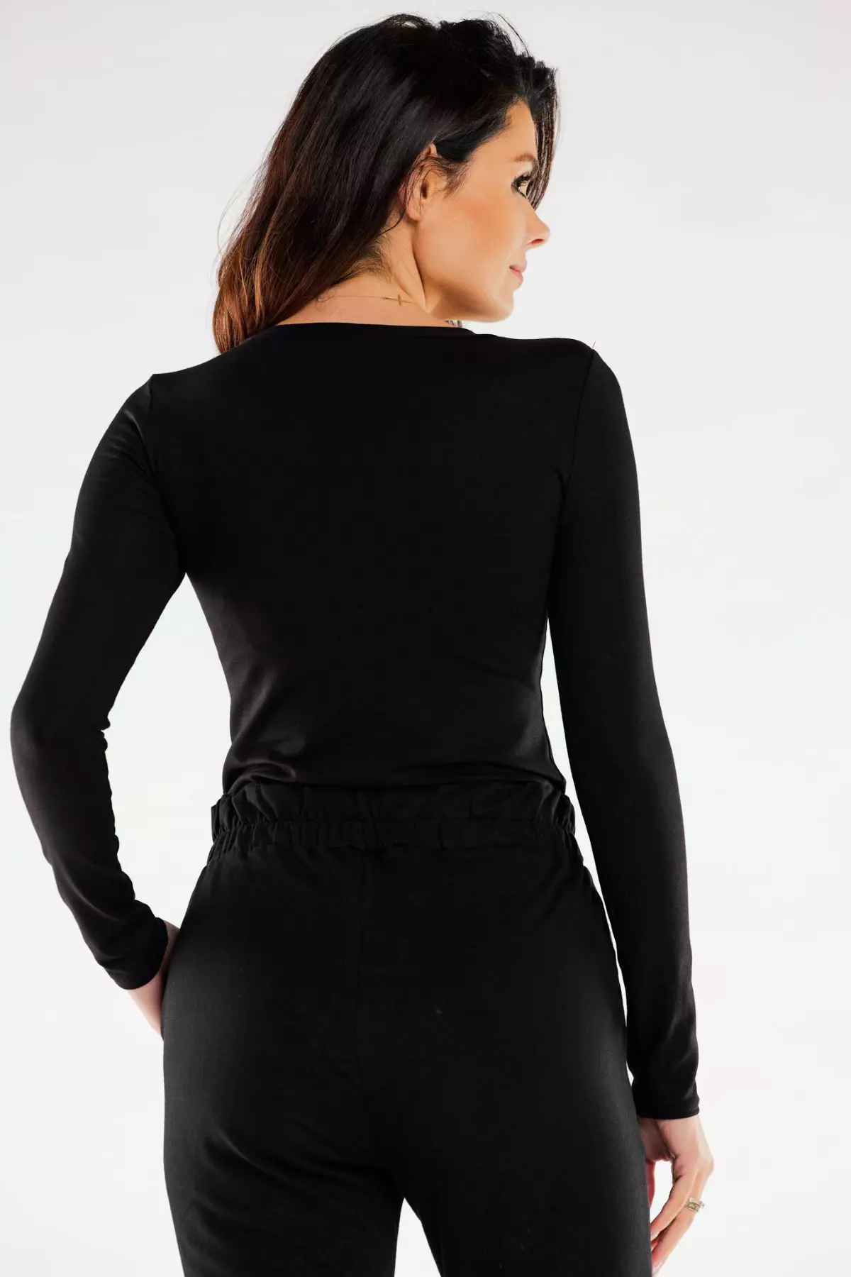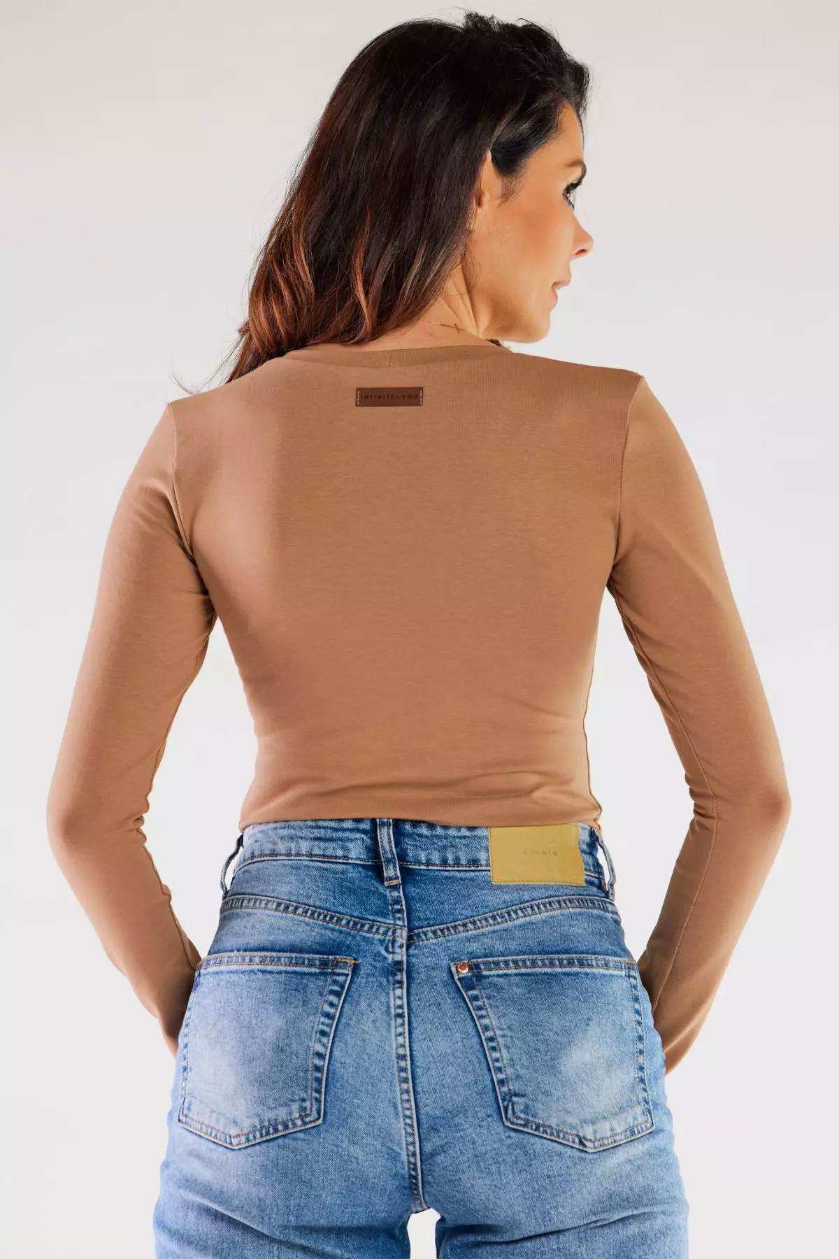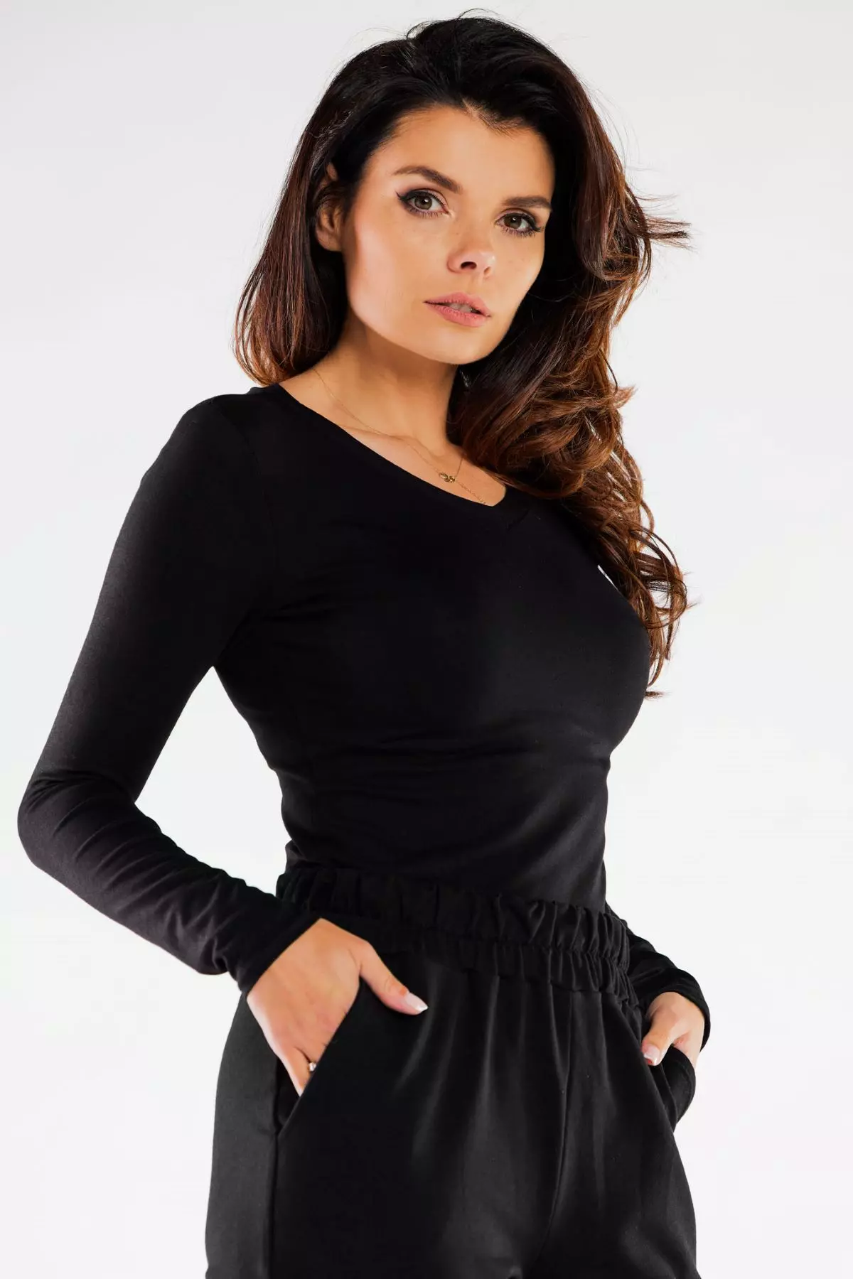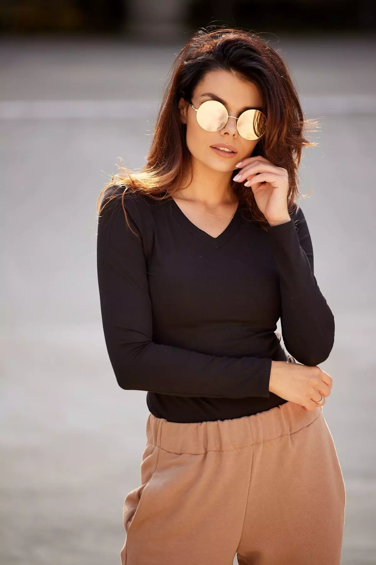 Gładka bluzka z długim rękawem to ponadczasowy element garderoby, doskonały do jeansów lub spodni z ekoskóry. Model z trójkątnym dekoltem subtelnie wysmukla szyję, dodając całości elegancji. Ta bluzka doskonale sprawdzi się zarówno w minimalistycznych, jak i w eleganckich stylizacjac.