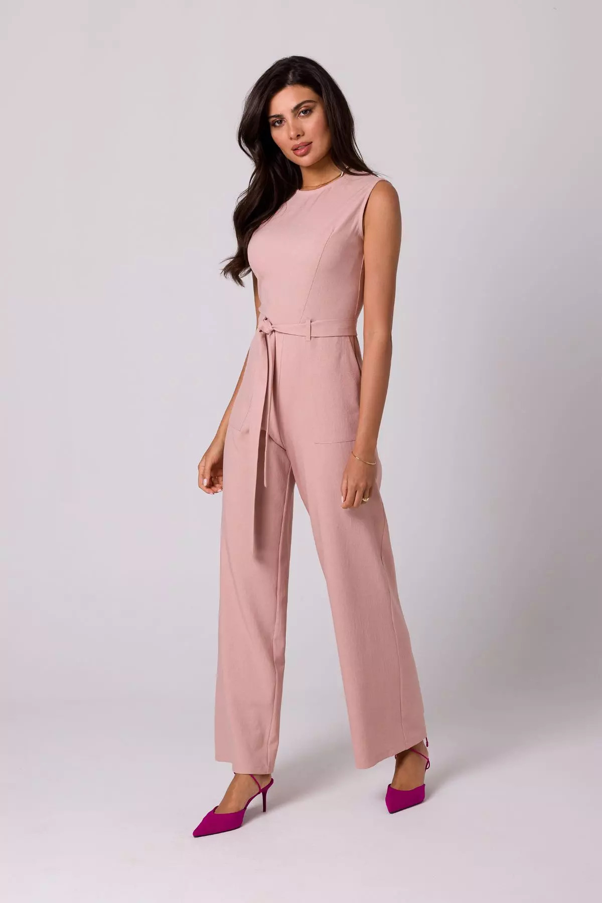 Klasyczny kombinezon bez rękawów na lato to modny i wygodny wybór na letnie dni. Prosty fason optycznie wydłuża sylwetkę, a szerokie nogawki dodają lekkości i swobody. Elastyczna taśma w talii pięknie podkreśla talię i zapewnia komfort noszenia. Dekolt w kształcie litery V dodaje subtelnej kobiecości. Kombinezon ten jest idealny zarówno na casualowe spotkania, jak i na bardziej formalne okazje. Możesz go zestawić z sandałkami na płaskim obcasie lub wysokimi szpilkami, w zależności od potrzeb i stylu.