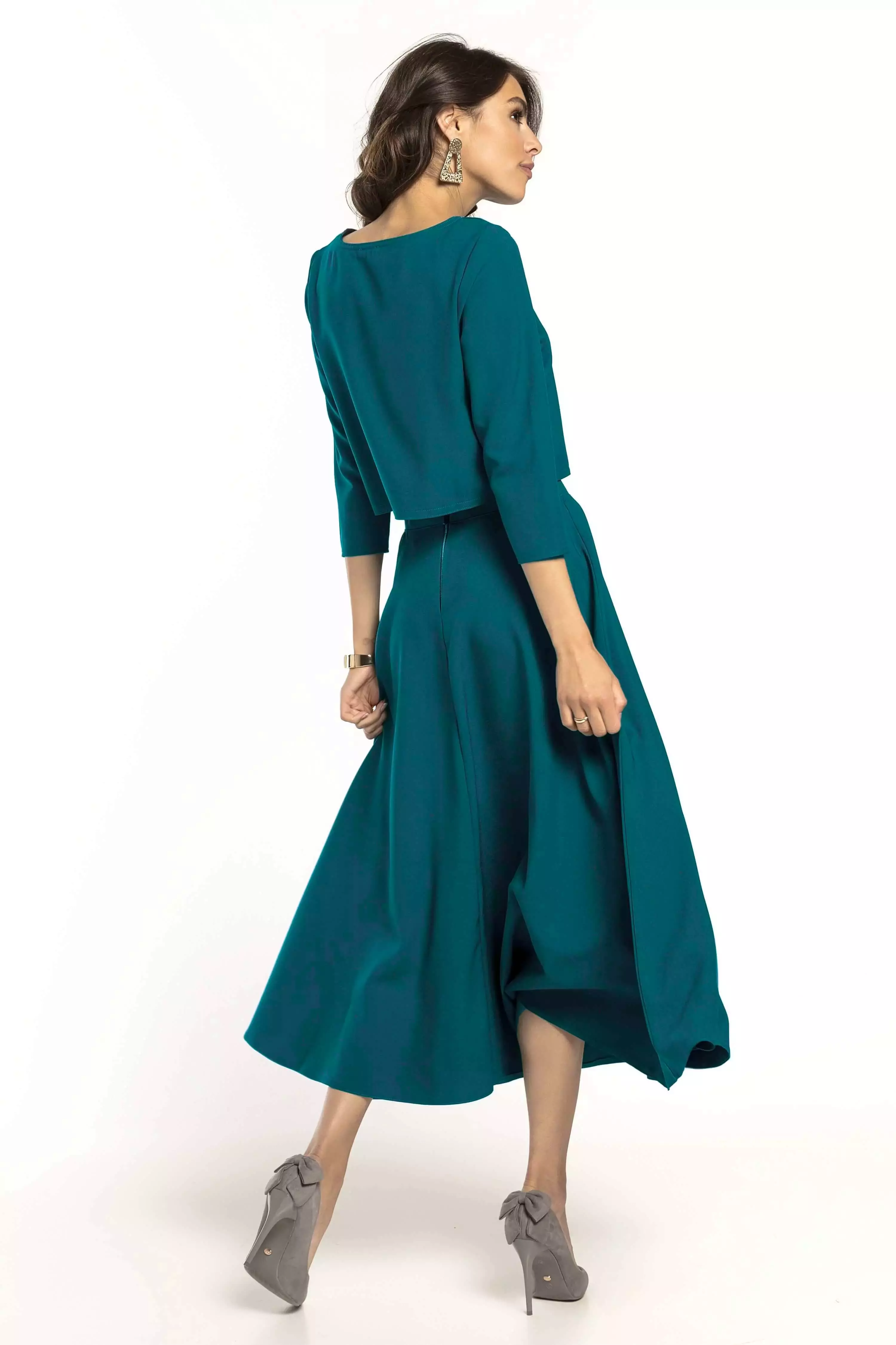 Komplet damski z elegancką spódnicą maxi to połączenie klasycznego stylu lat 90. z nowoczesnym wyrafinowaniem. Krótki top z półokrągłym dekoltem ozdobiony jest rękawami o długości ¾, które doskonale harmonizują z długą spódnicą. Spódnica maxi o rozkloszowanym kroju i wyższym stanie, z ozdobnym zamkiem, nie tylko wydłuża optycznie sylwetkę, ale także dba o jej proporcje. Dzięki lekkości tkaniny, spódnica pięknie porusza się wraz z każdym krokiem, nadając całości subtelnej gracji. Komplet w kolorze szmaragdowym doskonale komponuje się z klasycznymi szpilkami, wiązanymi sandałami lub tradycyjnymi mokasynami, tworząc wyrafinowany i stylowy look.