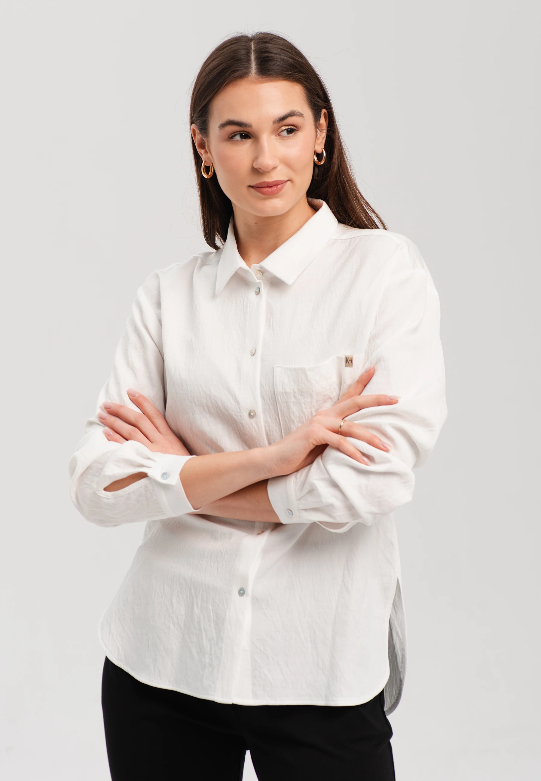Koszula damska z kieszenią i ozdobnym detalem – klasyka w nowoczesnym wydaniu. Ta koszula damska to ponadczasowa baza garderoby, która sprawdzi się zarówno w stylizacjach do biura, jak i na co dzień. Klasyczny kołnierzyk i zapięcie na guziki nadają jej elegancki charakter, a luźniejszy krój zapewnia swobodę ruchów i komfort noszenia. Model wyróżnia praktyczna kieszeń na piersi, uzupełniona subtelnym ozdobnym detalem, który dodaje całości unikatowego akcentu. Długie rękawy możesz nosić klasycznie lub podwinięte – w zależności od okazji i stylu. Koszula świetnie komponuje się ze spodniami materiałowymi, jeansami czy spódnicą, tworząc modne zestawy smart casual.