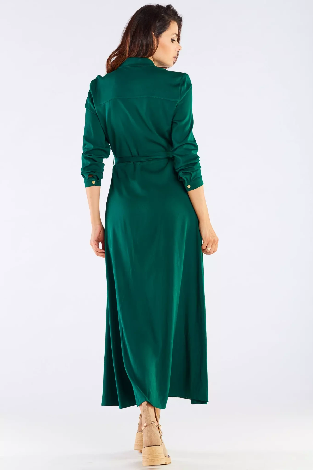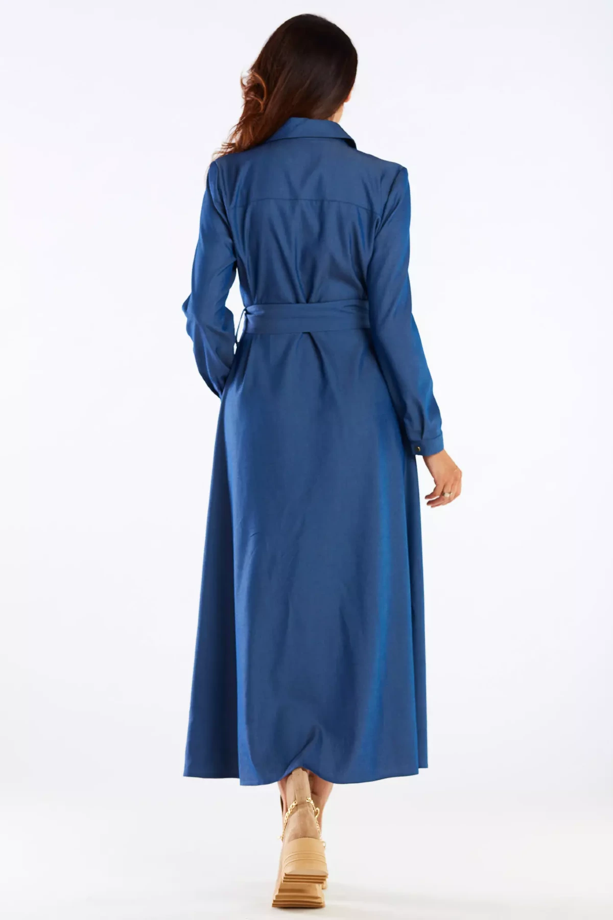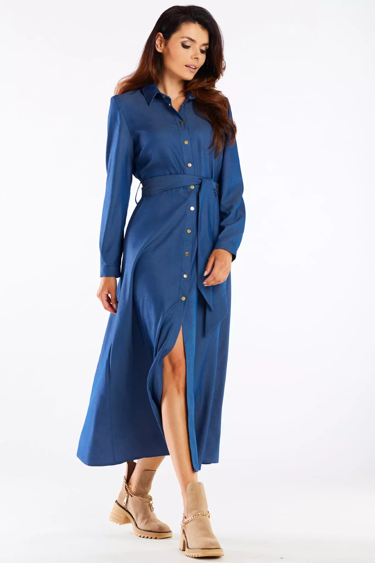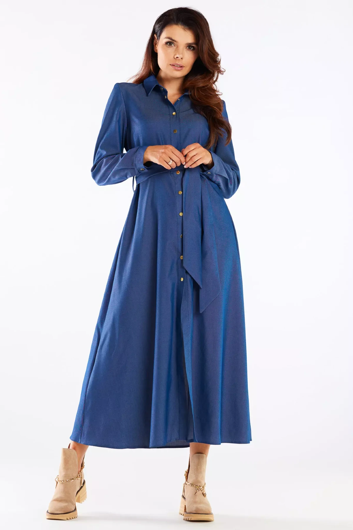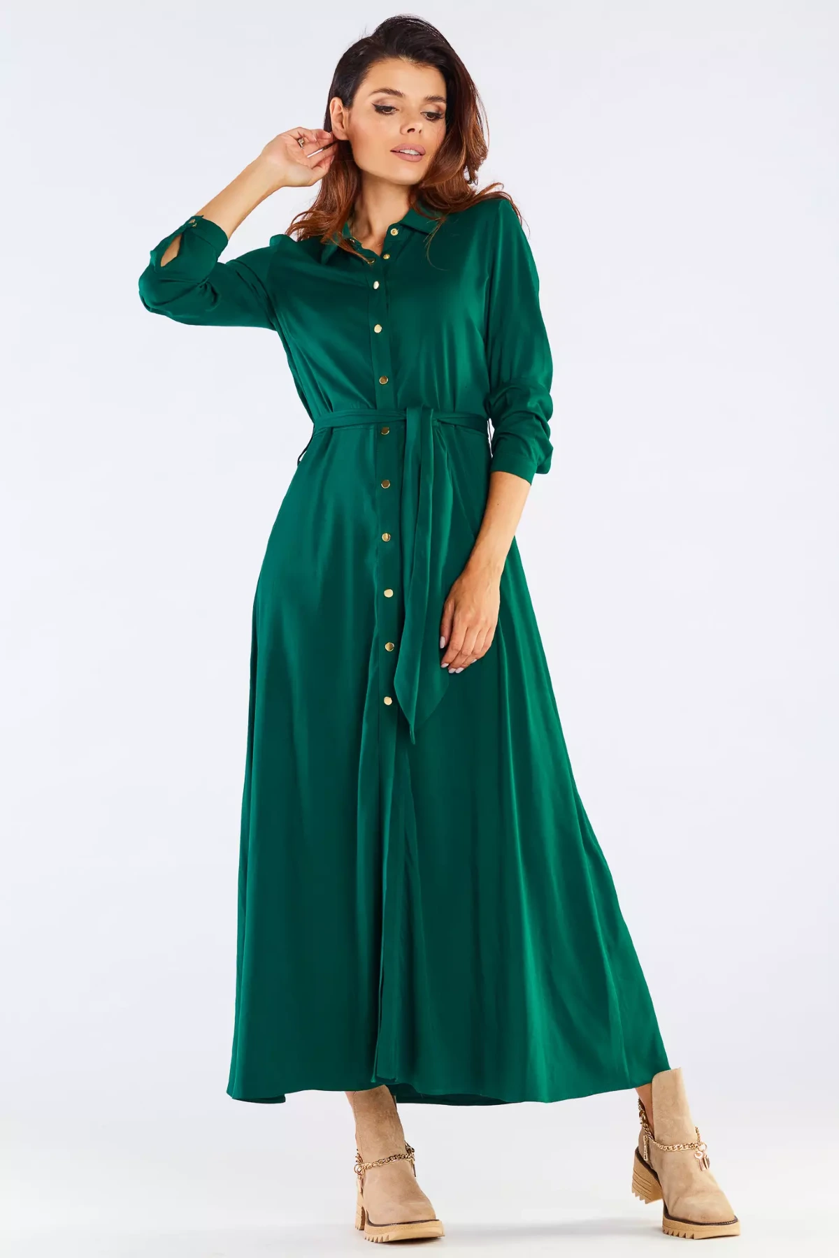 Koszulowa sukienka maxi z wiązaniem w talii to ponadczasowy model, który powinien znaleźć się w każdej garderobie. Jest to hit sezonu, który w połączeniu z botkami i ramoneską pozwoli stworzyć stylizację inspirowaną światowymi trendami. Na całej długości została wyposażona w guziki, które pełnią zarówno funkcję dekoracyjną, jak i praktyczną – umożliwiają regulację głębokości dekoltu oraz rozcięcia spódnicy. Długie rękawy zakończone są mankietami zapinanymi na guziki, dodając eleganckiego charakteru. Model nie posiada podszewki, a jego przewiewna tkanina wykonana z naturalnej wiskozy może ulegać delikatnym zagnieceniom, co świadczy o jej wyjątkowych właściwościach.