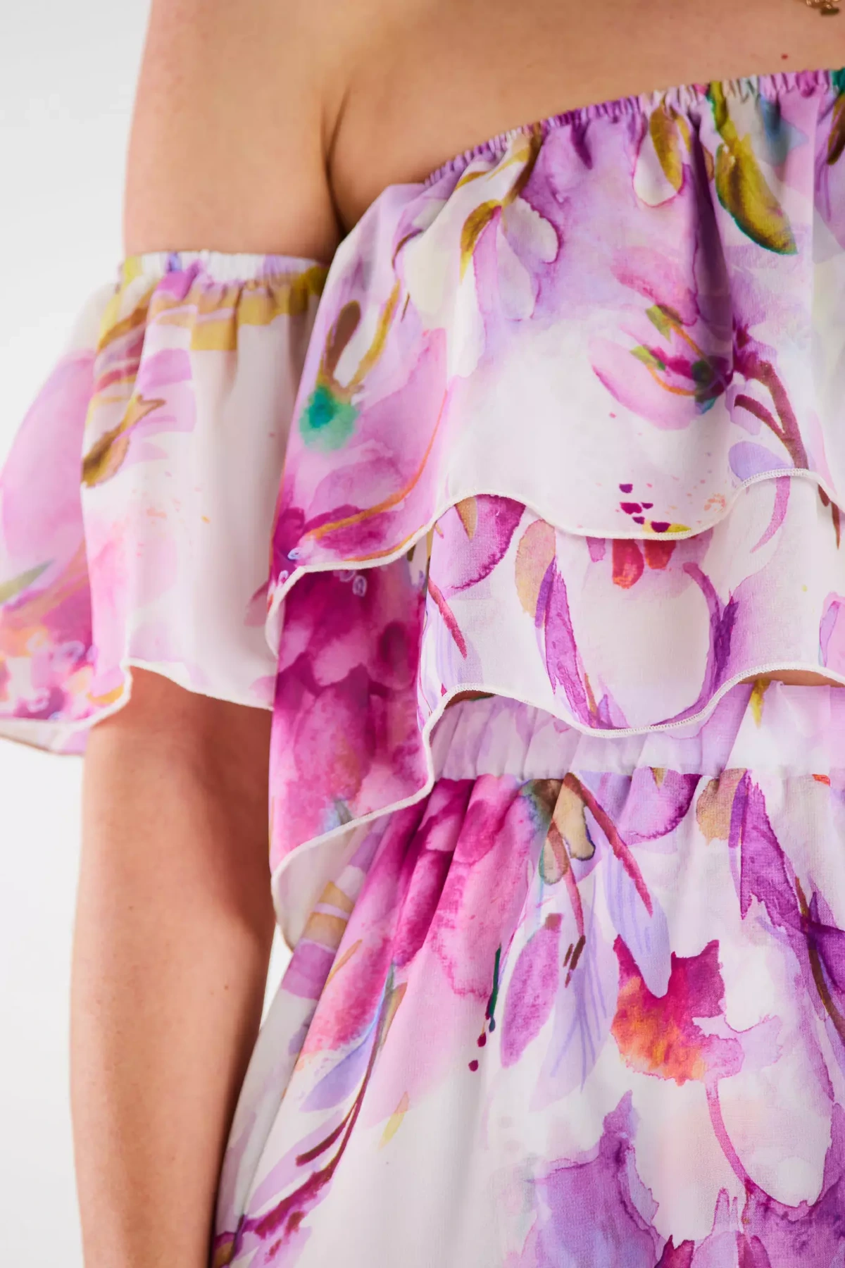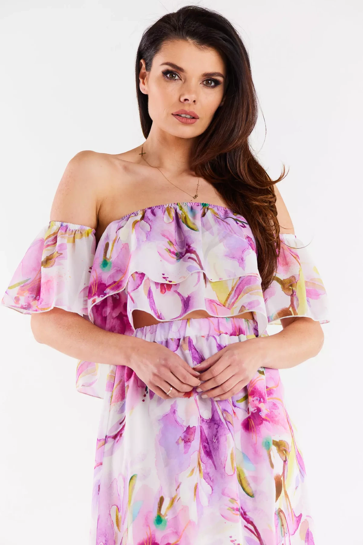 Krótka bluzka hiszpanka z dwoma falbankami to świetny wybór na letnie, imprezowe wieczory. Elastyczna gumka umiejscowiona nad biustem umożliwia noszenie jej bez biustonosza, zapewniając wygodę. Luźny fason z podwójnymi falbankami na przodzie podkreśla kobiecy urok i lekkość. Mini rękawy z gumkami gwarantują pełen komfort przez cały dzień. Ta bluzka doskonale komponuje się zarówno z szortami z wysokim stanem, jak i z lekką spódnicą, pozwalając Ci stworzyć stylizację na każdą okazję.
