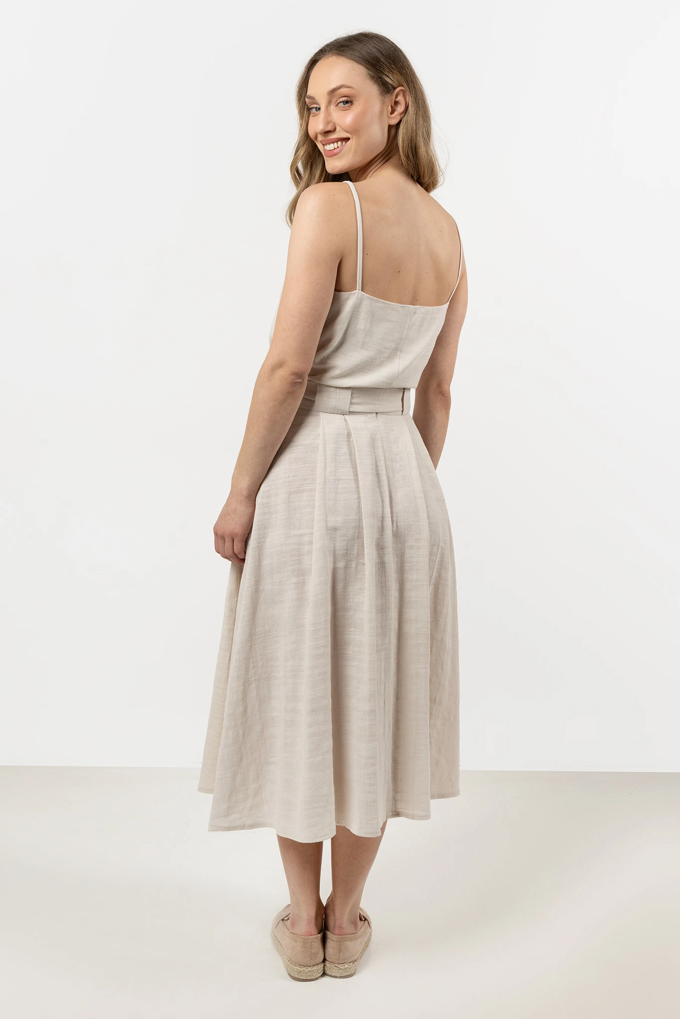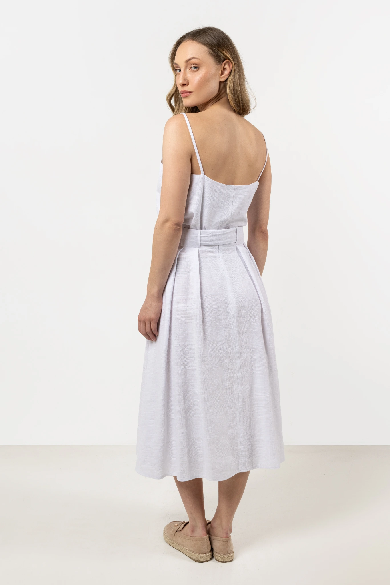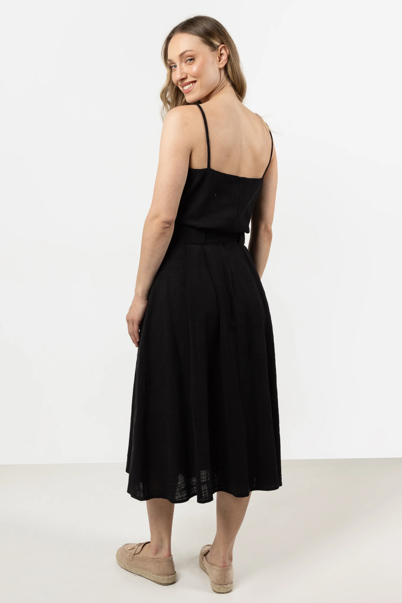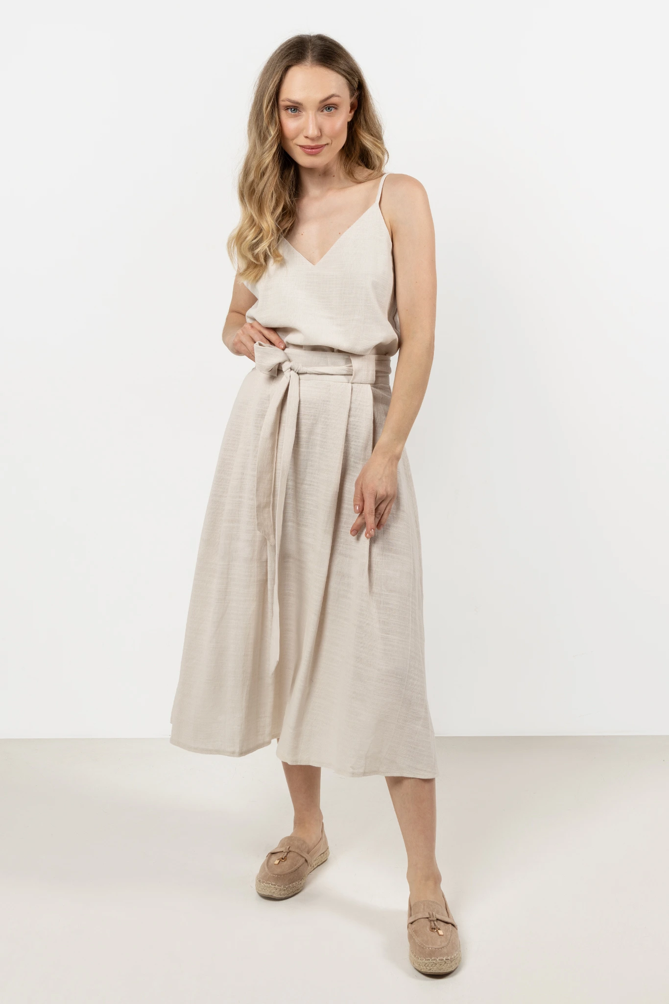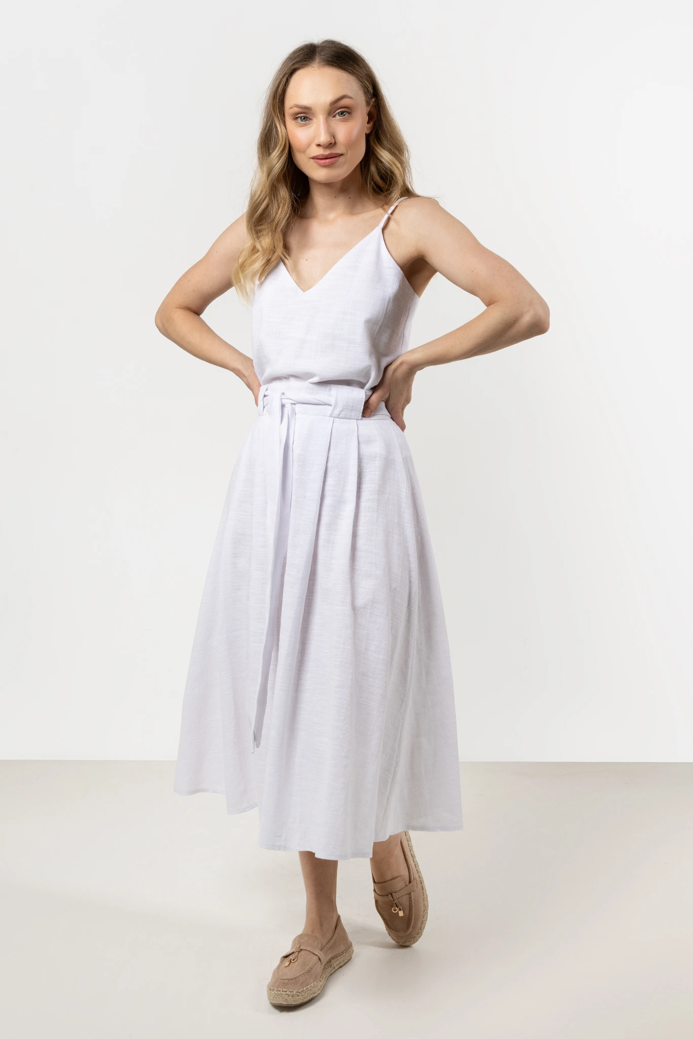 Lekka spódnica midi z wysokim stanem, łącząca klasyczną elegancję z codziennym komfortem. Wykonana w 100% z naturalnej bawełny, dzięki czemu jest lekka, przewiewna i przyjemna w noszeniu. Wysoki stan subtelnie podkreśla talię, a eleganckie zakładki dodają spódnicy lekkości i struktury.
