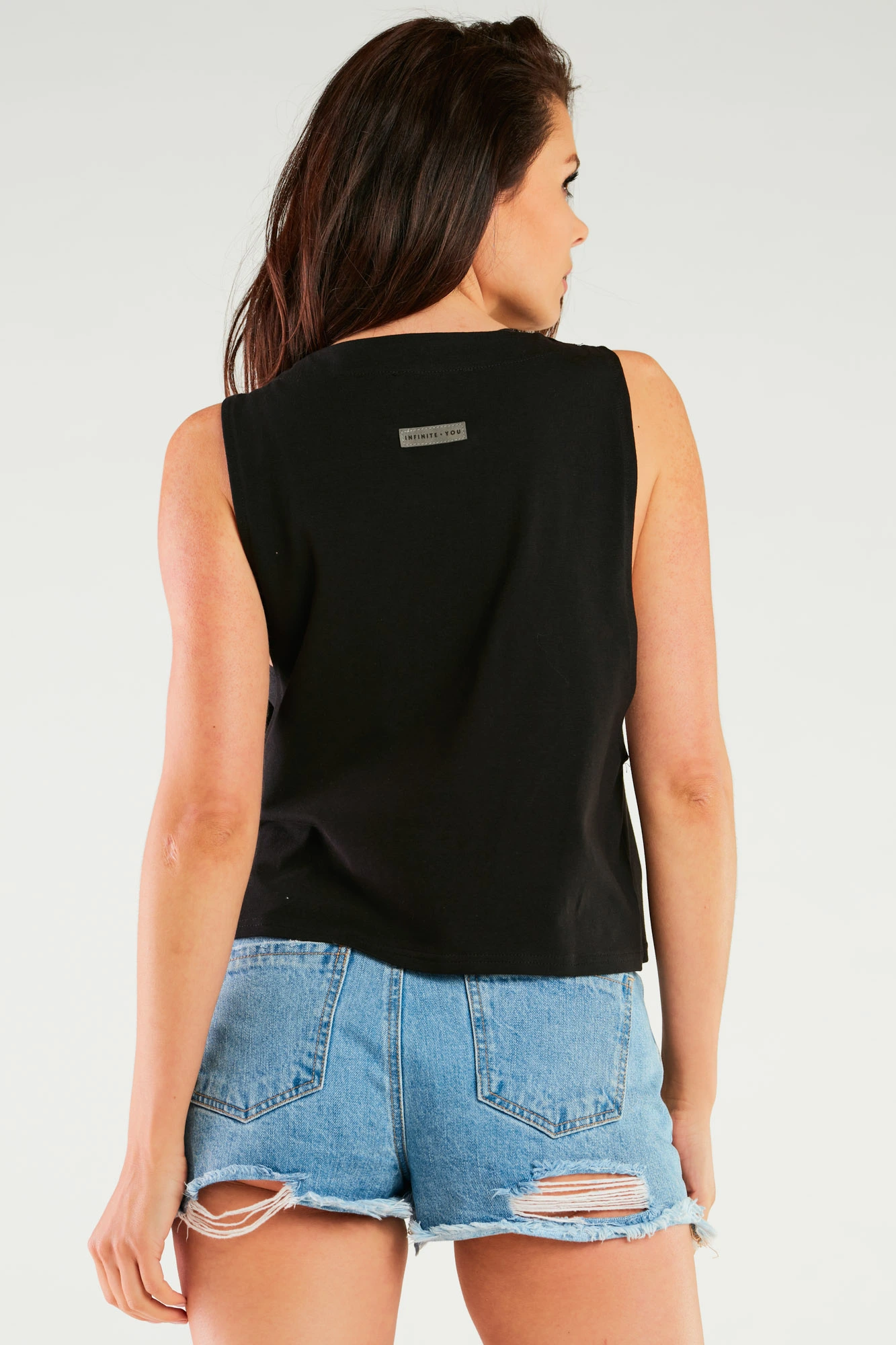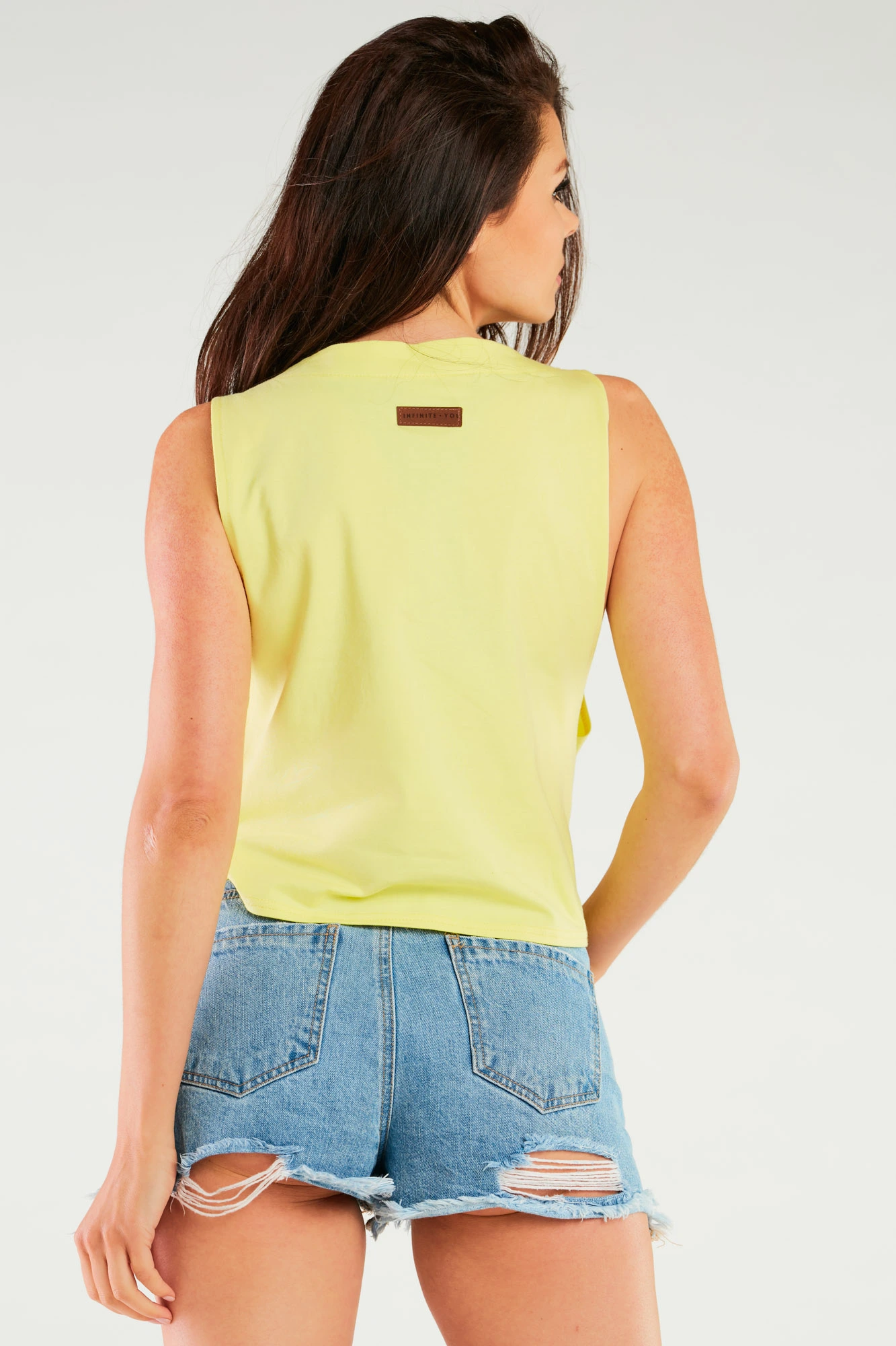 T-shirt damski bez rękawów to połączenie prostoty i nowoczesnego designu. Model wyróżnia się głębokimi wycięciami pod pachami, które nadają mu charakterystyczny, nieco sportowy look, a jednocześnie zapewniają pełną swobodę ruchów i przewiewność w ciepłe dni. Starannie uszyty z wysokiej jakości, miękkiej dzianiny bawełnianej, która delikatnie otula ciało i doskonale układa się na sylwetce.