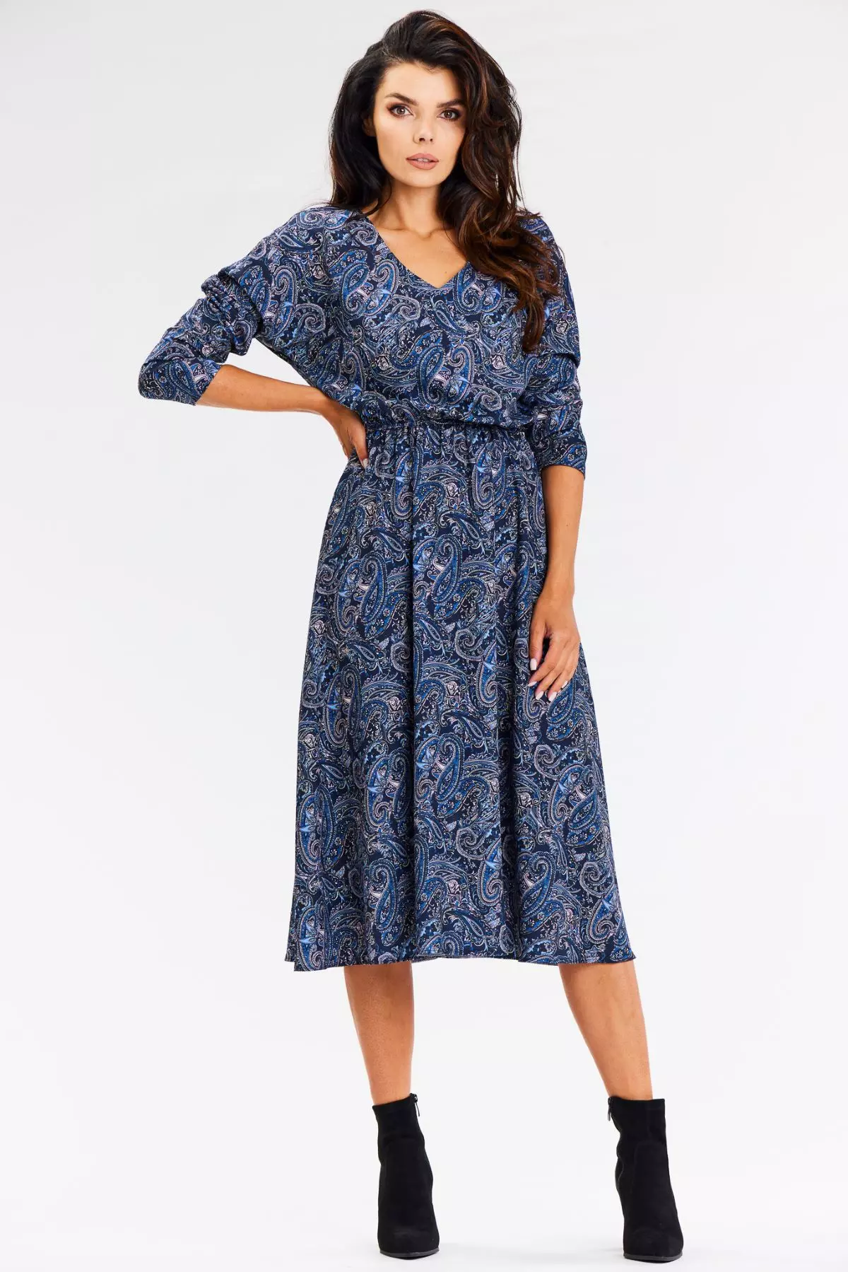 Niebieska sukienka w azteckie wzory doskonale sprawdzi się na różnorodne okazje, od eleganckich wydarzeń po codzienne wyjścia. Wykonana z lekkiego i przewiewnego materiału, gwarantuje komfort noszenia przez cały dzień. Luźny fason i stylowy dekolt nadają jej nowoczesnego charakteru, a długie rękawy dodają praktyczności. Idealna dla kobiet, które cenią połączenie wygody ze stylowym wyglądem. Ta sukienka to uniwersalny element garderoby, który z łatwością można zestawić z różnymi dodatkami, tworząc oryginalne stylizacje.