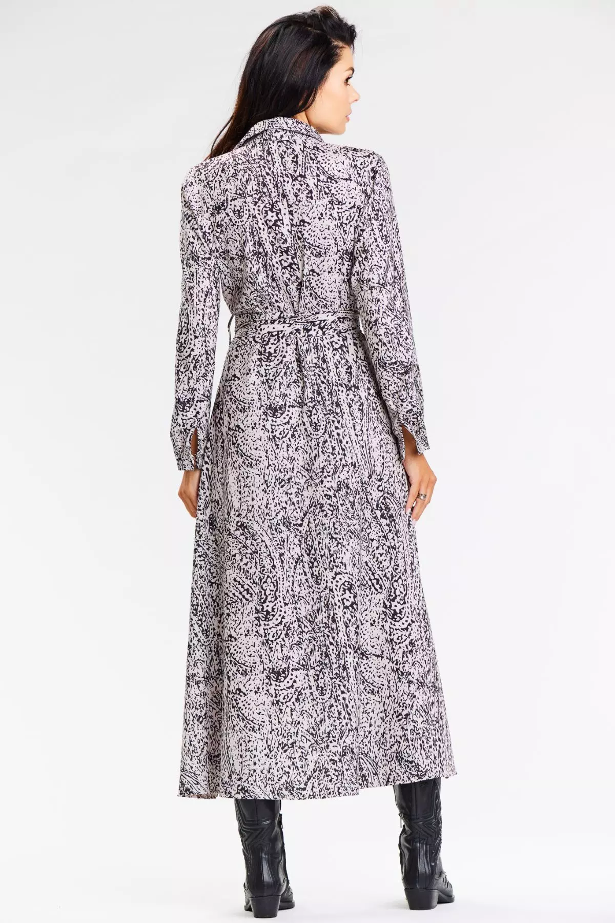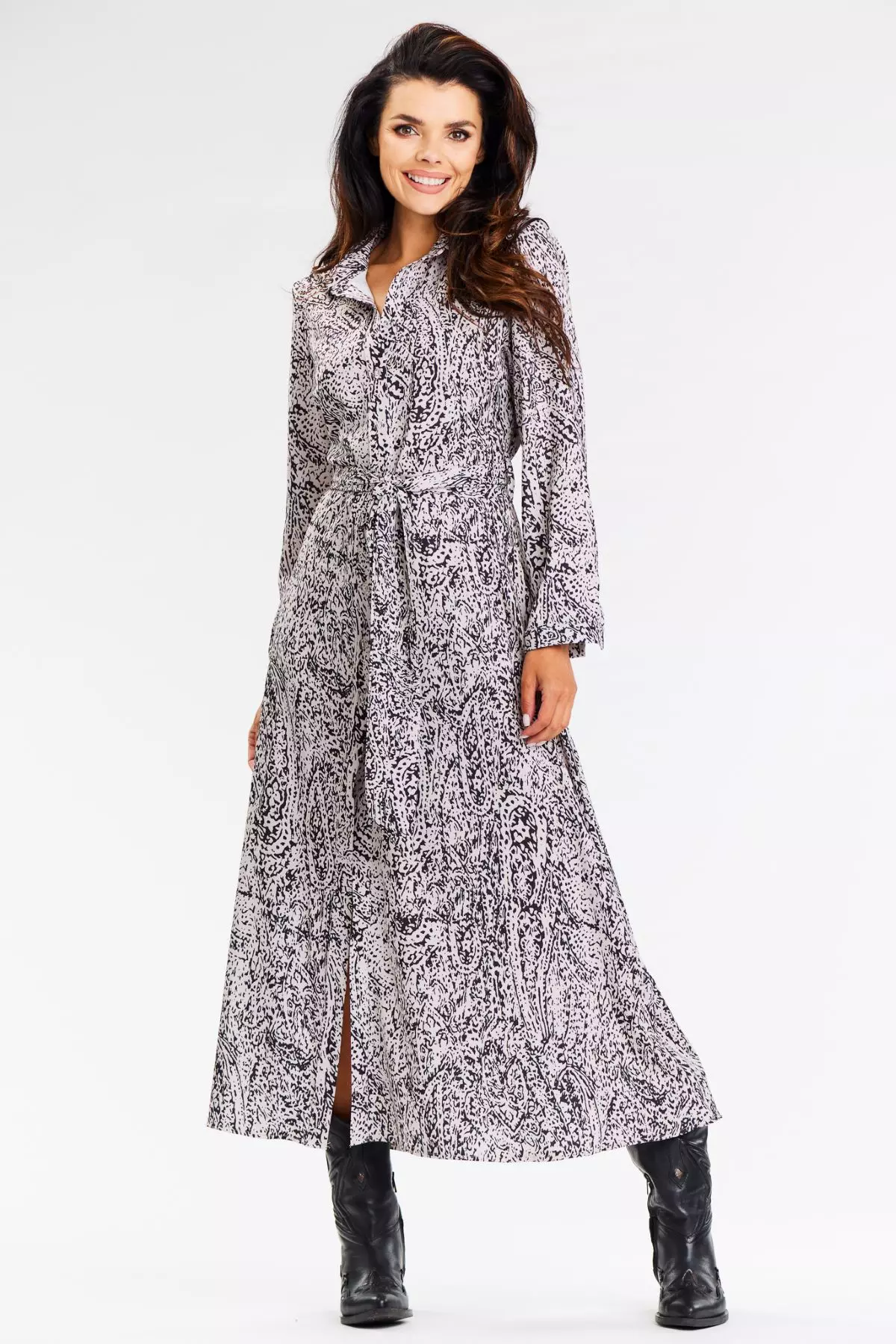 Nowoczesna sukienka maxi z rozcięciem i wiązaniem to harmonijne połączenie szyku i nowoczesności. Uszyta z materiału najwyższej jakości, gwarantuje wygodę przez cały dzień. Dopasowany fason delikatnie akcentuje sylwetkę, a pasek w talii podkreśla jej kształty, dodając całości subtelnego wdzięku. Długie rękawy oraz głębokie rozcięcie w dolnej części nadają sukience lekkości, co czyni ją idealnym wyborem zarówno na formalne uroczystości, jak i codzienne stylizacje. To perfekcyjny wybór dla kobiet, które poszukują połączenia komfortu z eleganckim wyglądem.