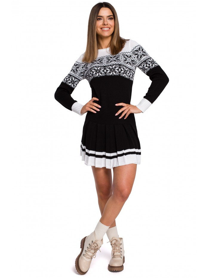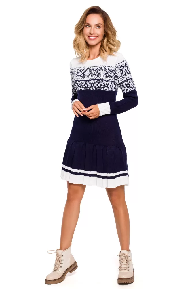 Plisowana sukienka ze świątecznym motywem to wyjątkowa propozycja na okres zimowy. Urocza sukienka świetnie sprawdzi się nie tylko podczas świątecznych uroczystości ale także na co dzień. Ten model przyciągnie spojrzenie i skradnie serce każdego przechodnia. Możesz mieć pewność, że w tej oryginalnej, mini  sukience będziesz wyglądać niezwykle uroczo a Twoja stylizacja nabierze wyjątkowego charakteru. Długość mini pięknie eksponuje nogi a lekko rozkloszowany dół maskuje drobne niedoskonałości figury, Długie rękawy i zabudowany dekolt to idealne rozwiązanie na chłodne dni. Ta sukienka to must have w zimowej garderobie.