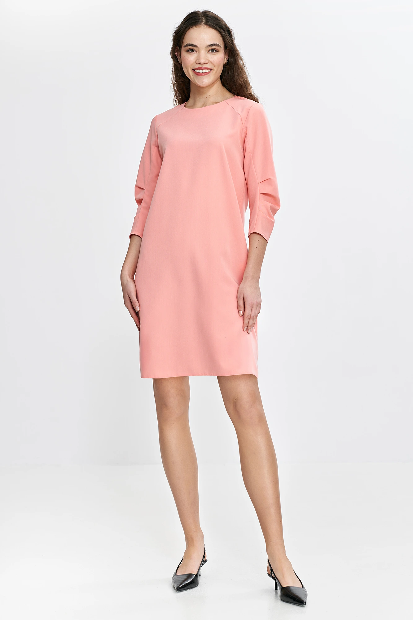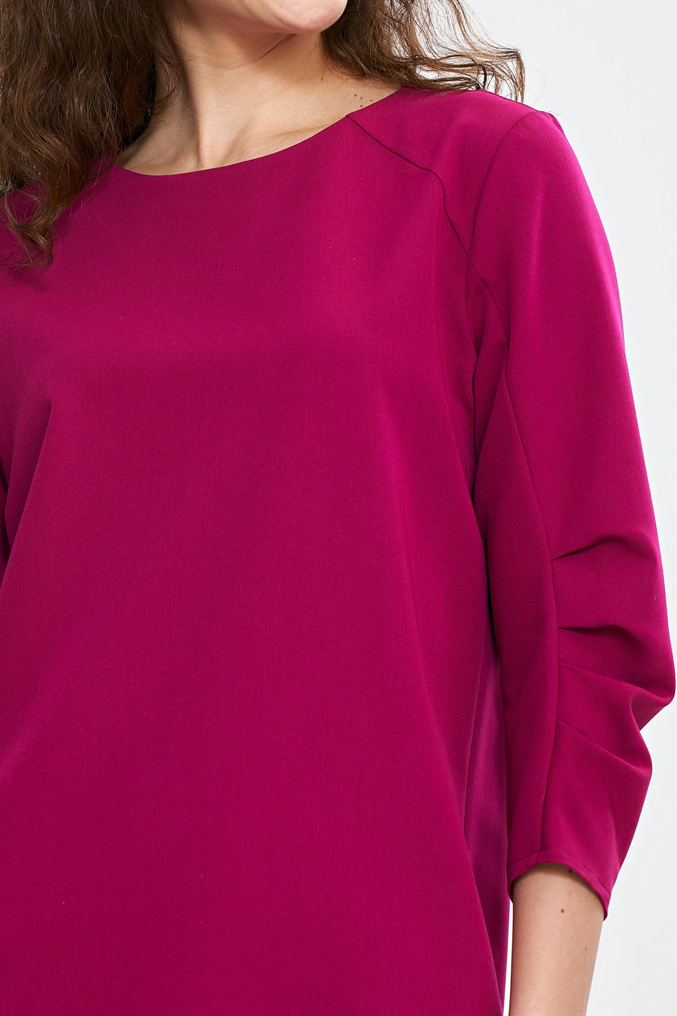 Model wyposażony jest w rękawy ¾ z delikatnymi zakładkami, które przyciągają wzrok i dodają całości charakteru. Gładka powierzchnia materiału i łagodnie zaokrąglony dekolt tworzą elegancką, ale uniwersalną bazę do wielu zestawów – zarówno ze szpilkami, jak i z balerinami. Kryty zamek z tyłu pozwala na łatwe zakładanie i idealne dopasowanie.