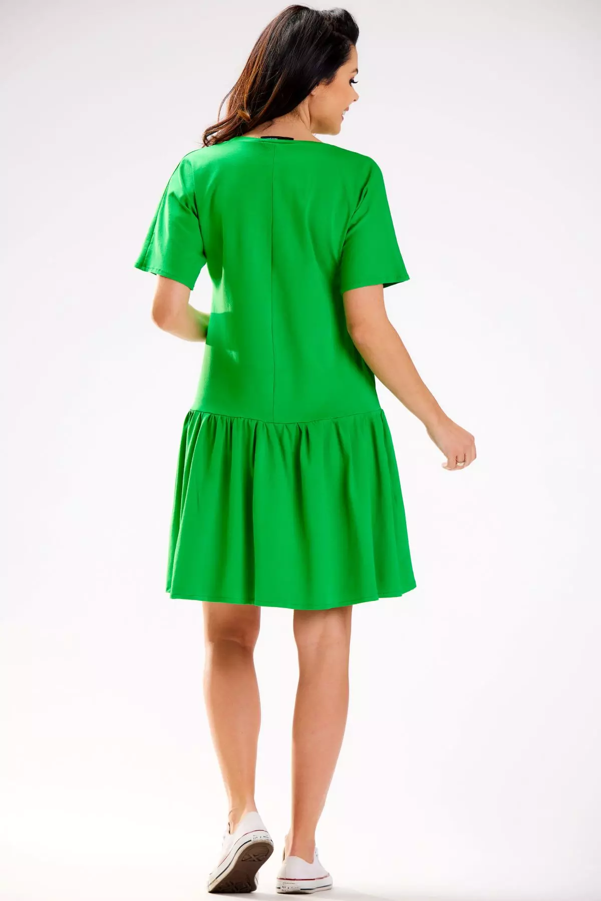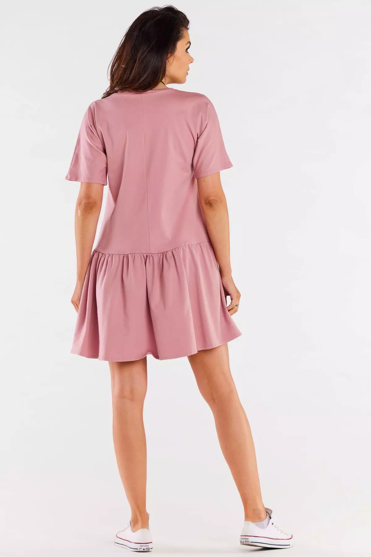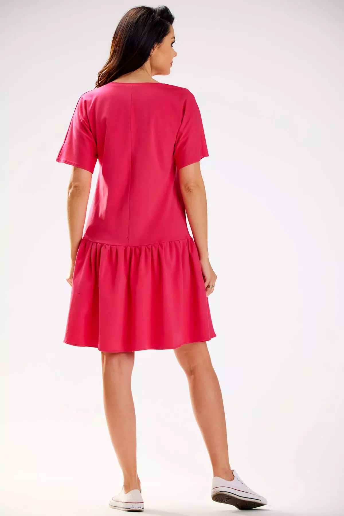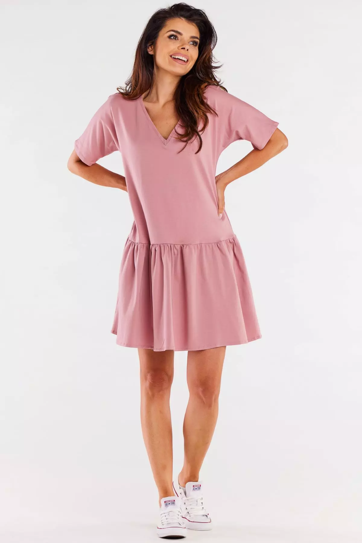 Przewiewna sukienka oversize z krótkim rękawem i falbaną to idealna opcja na codzienne wyjścia oraz letnie podróże. Głęboki dekolt w kształcie litery V delikatnie podkreśla szyję i linię biustu, a krótkie, lekko rozszerzane rękawki dodają lekkości. Luźny fason gwarantuje swobodę ruchów, dzięki czemu świetnie sprawdzi się podczas intensywnych dni, np. pełnych zwiedzania. Szeroka falbana na dole wprowadza subtelnie romantyczny akcent, a całość z łatwością zestawisz zarówno z wygodnymi trampkami, jak i eleganckimi sandałami.