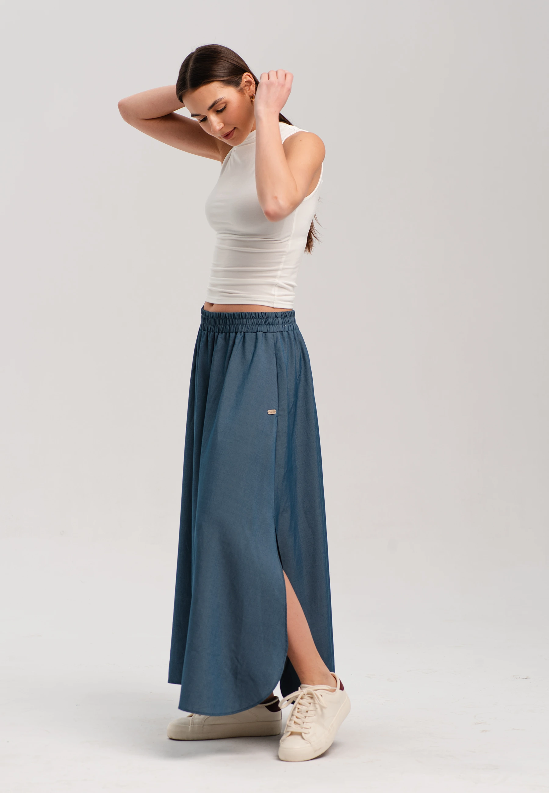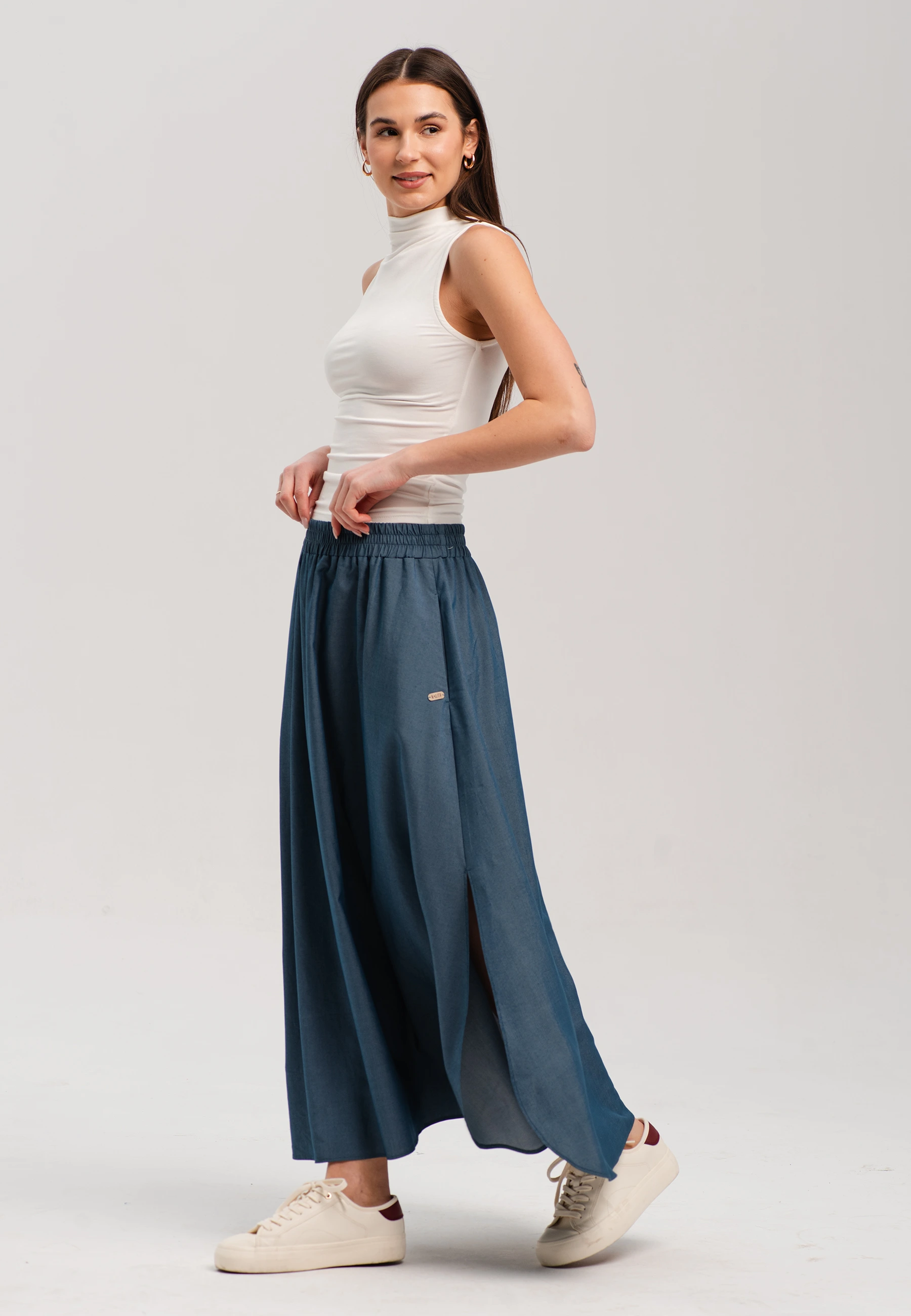 Spódnica maxi z wysokim rozcięciem i elastyczną talią to wygodna propozycja na co dzień, która łączy swobodę ruchu z kobiecym akcentem. Długość do kostek pięknie wydłuża sylwetkę i sprawdza się zarówno w miejskich stylizacjach, jak i podczas wyjazdów. Lekko układający się materiał w niebieskim, jeansowym odcieniu dodaje całości nowoczesnego charakteru i łatwo łączy się z bielą, beżem czy czernią. Elastyczny pas zapewnia komfort noszenia oraz dopasowanie bez ucisku, nawet przez cały dzień. Rozcięcie z boku subtelnie odsłania nogę i dodaje lekkości przy każdym kroku. To damska spódnica maxi, która wygląda świetnie zarówno ze sneakersami, jak i sandałami czy klapkami.