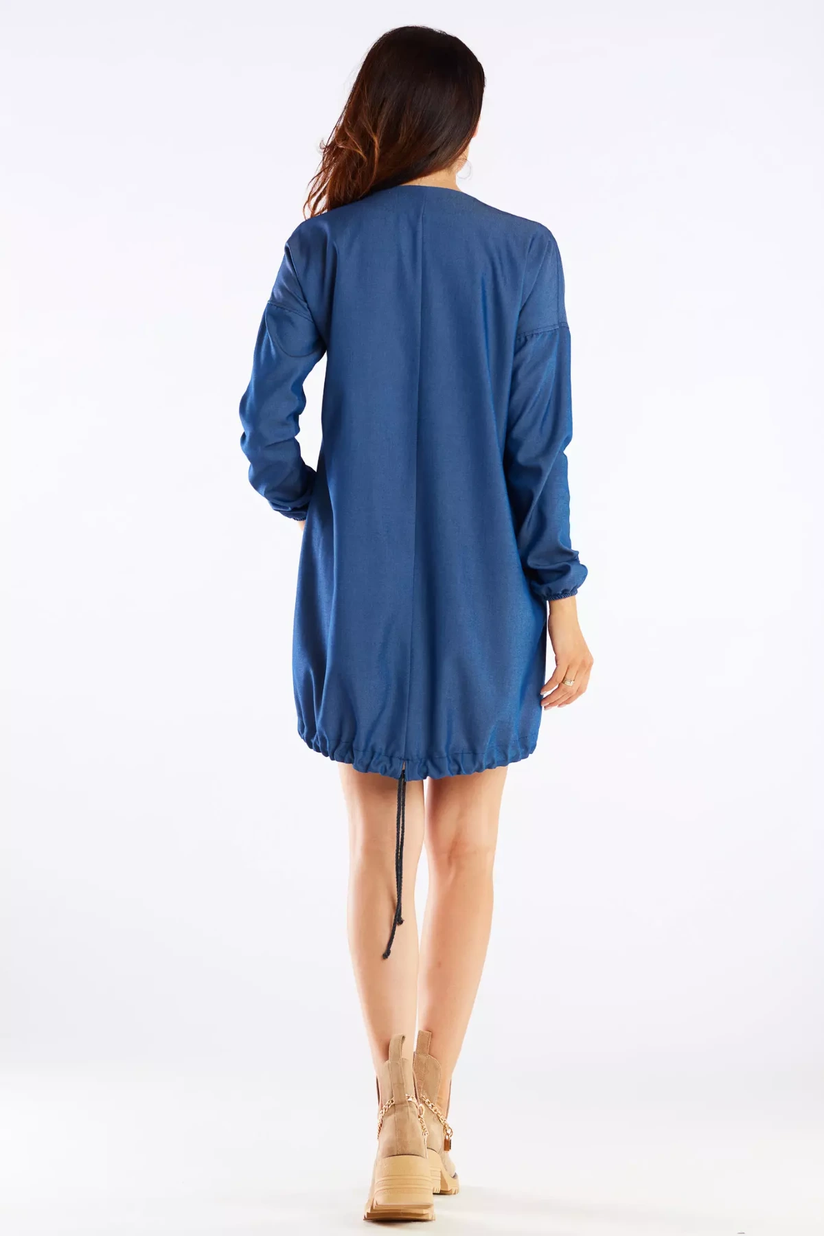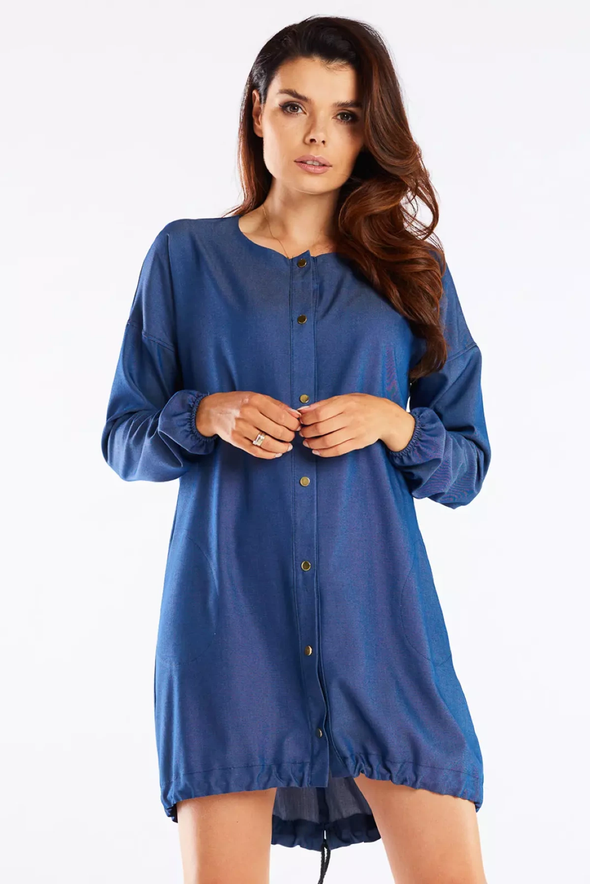 Stylowa sukienka casual z regulowanym dołem, zapinana na napy to doskonały wybór dla kobiet ceniących komfort i styl. Uszyta z lekkiej, wysokogatunkowej tkaniny, gwarantuje wygodę oraz nieograniczoną swobodę ruchów. Model wyposażony jest w długie rękawy zakończone elastyczną gumką które dodają funkcjonalności. Dół sukienki został wzbogacony o regulowany ściągacz, pozwalający na idealne dopasowanie do figury. Sprawdzi się zarówno na co dzień, jak i na wyjątkowe okazje, świetnie komponując się z botkami, eleganckimi butami czy klasycznymi dodatkami.