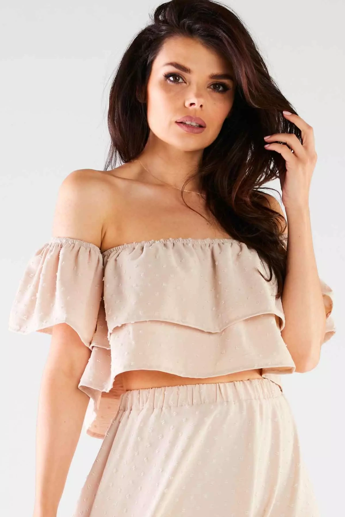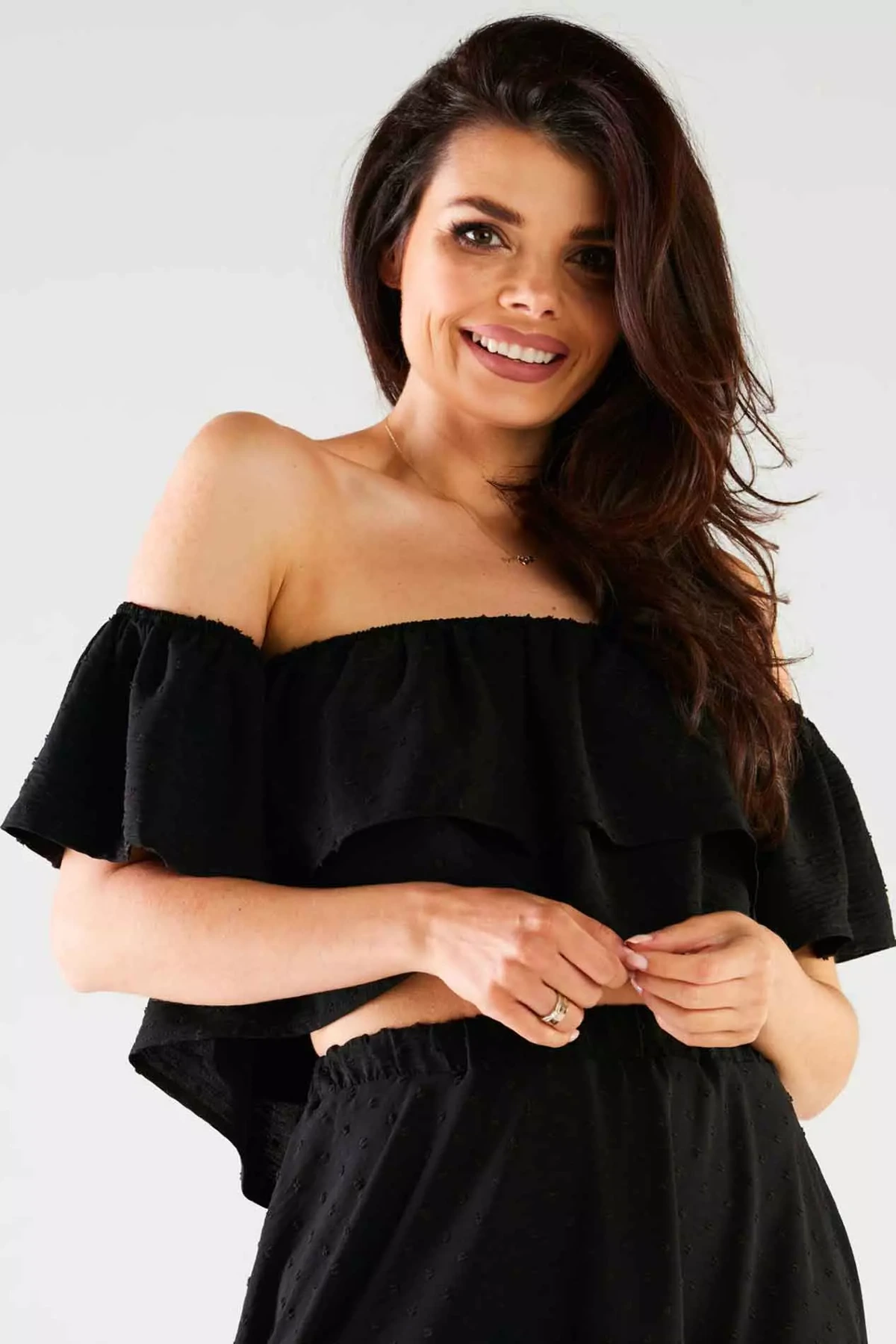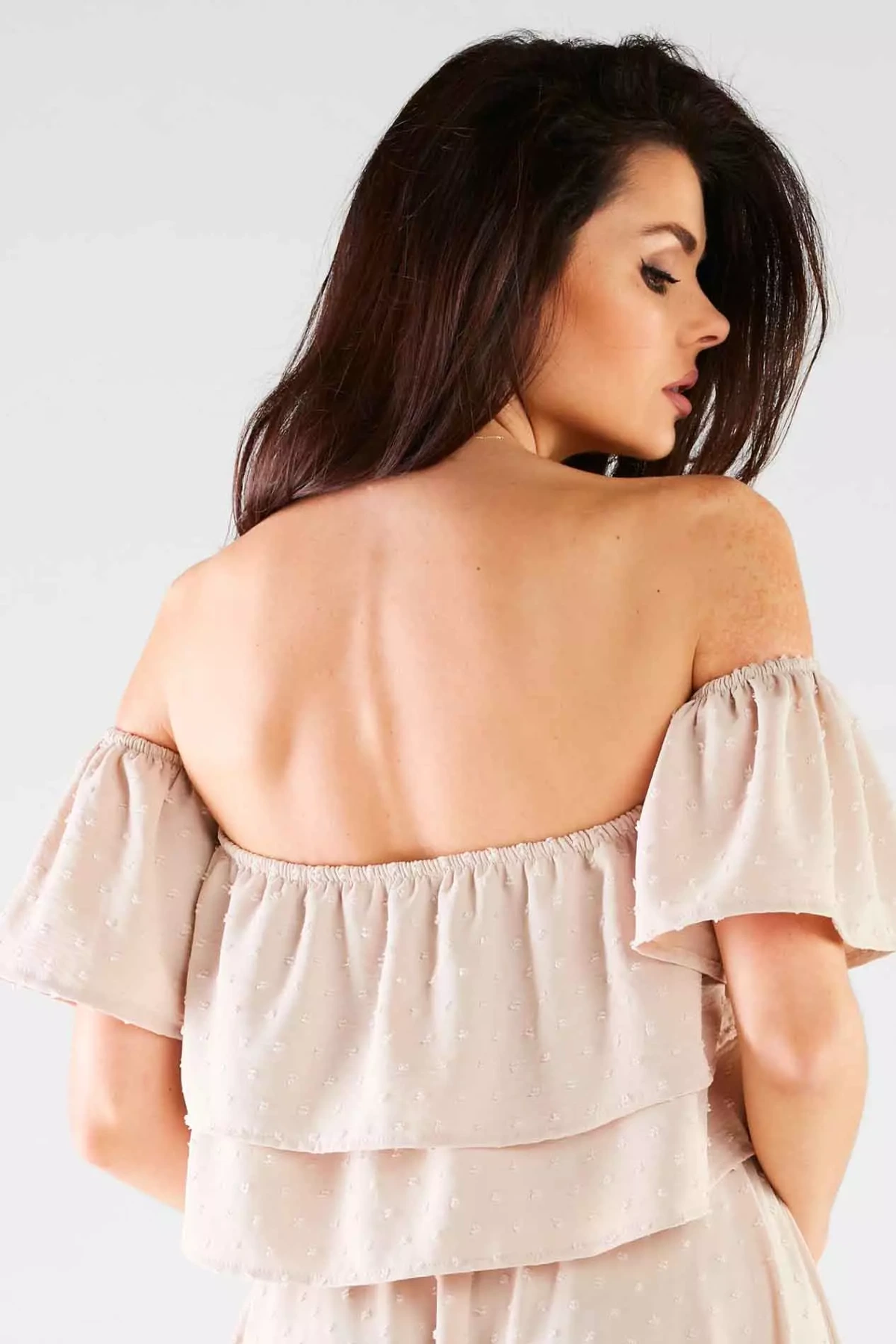 Stylowy damski top z odsłoniętymi ramionami, doskonały na ciepłe dni oraz wieczorne wyjścia. Wykonany z lekkiego i oddychającego materiału, zapewnia komfort przez cały dzień, pozwalając na pełną swobodę ruchów. Luźny fason oraz subtelne falbany nadają mu kobiecego i delikatnego charakteru, tworząc elegancki, ale jednocześnie casualowy look. Bluzka wyróżnia się oryginalnym krojem z odkrytymi ramionami i elastycznym wykończeniem, co łączy w sobie elegancję i wygodę. Idealna na różnorodne wydarzenia – od letnich imprez po spotkania z przyjaciółmi i romantyczne spacery. Jej przewiewny materiał gwarantuje komfort nawet w upalne dni, a luźna forma zapewnia pełną swobodę.