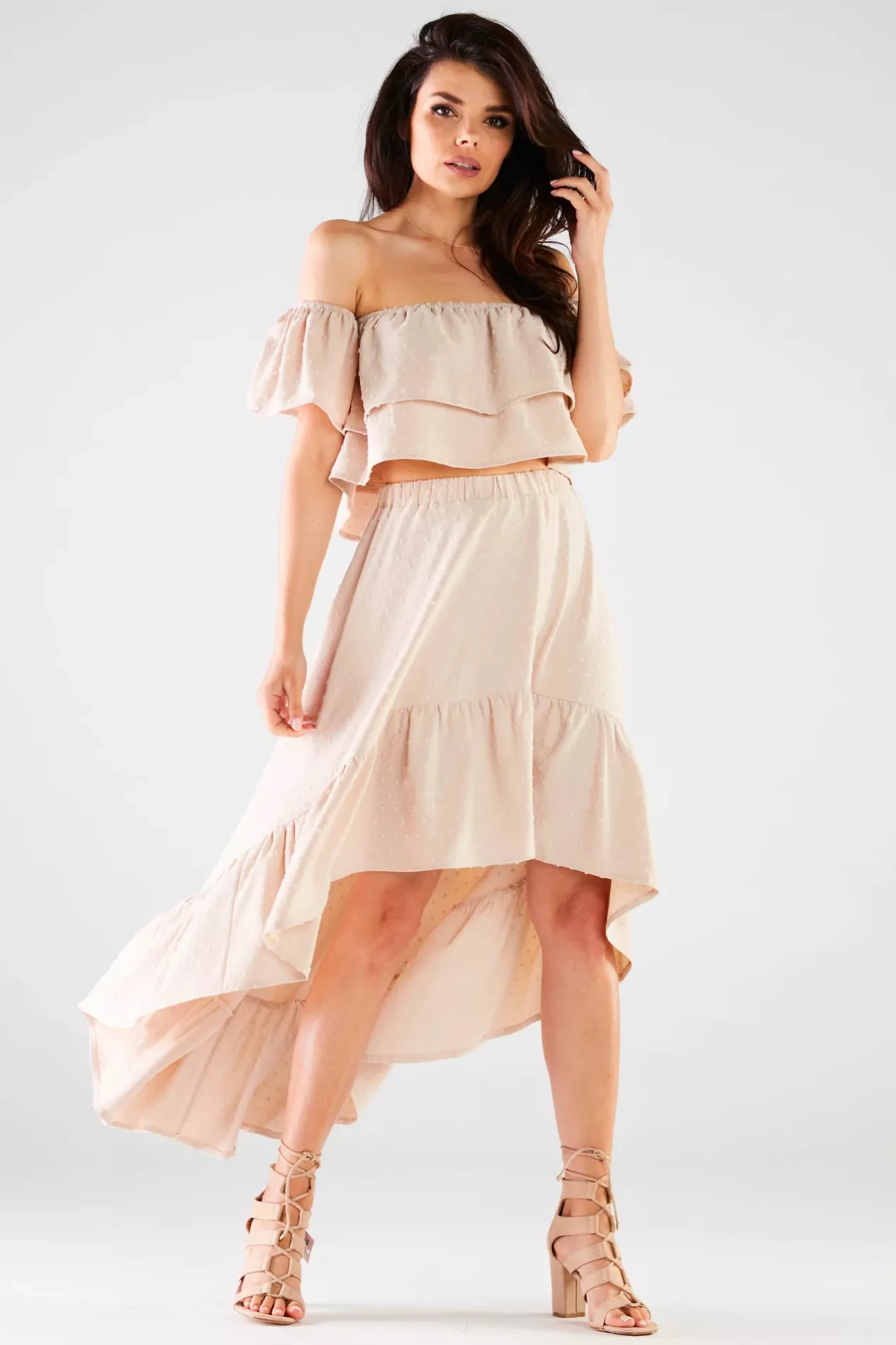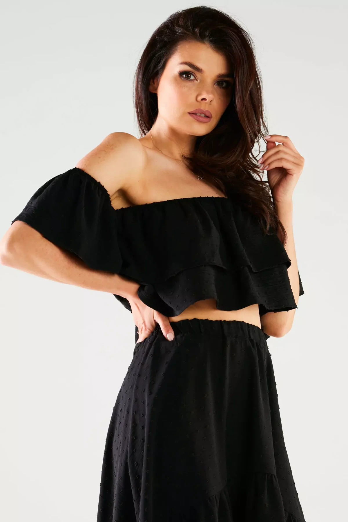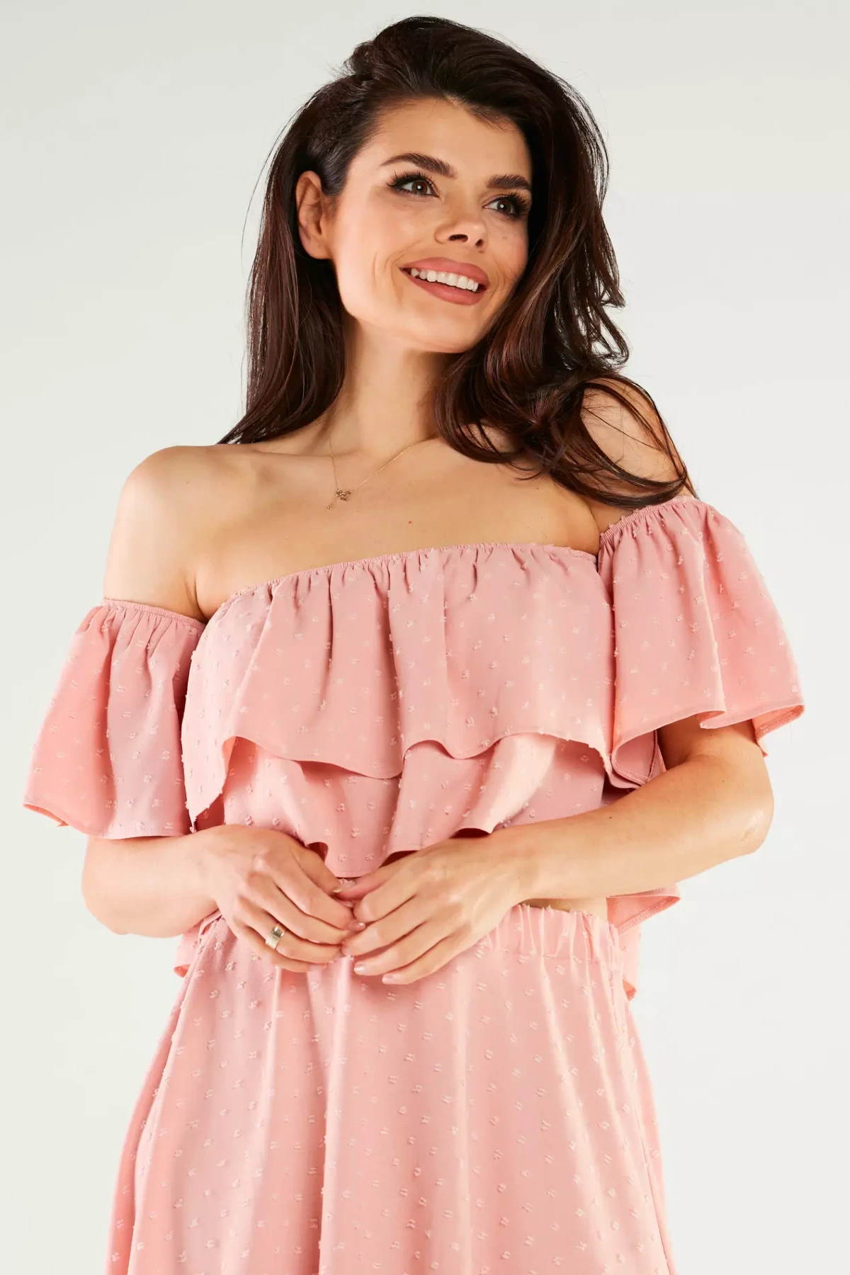 Stylowy damski top z odsłoniętymi ramionami, doskonały na ciepłe dni oraz wieczorne wyjścia. Wykonany z lekkiego i oddychającego materiału, zapewnia komfort przez cały dzień, pozwalając na pełną swobodę ruchów. Luźny fason oraz subtelne falbany nadają mu kobiecego i delikatnego charakteru, tworząc elegancki, ale jednocześnie casualowy look. Bluzka wyróżnia się oryginalnym krojem z odkrytymi ramionami i elastycznym wykończeniem, co łączy w sobie elegancję i wygodę. Idealna na różnorodne wydarzenia – od letnich imprez po spotkania z przyjaciółmi i romantyczne spacery. Jej przewiewny materiał gwarantuje komfort nawet w upalne dni, a luźna forma zapewnia pełną swobodę.