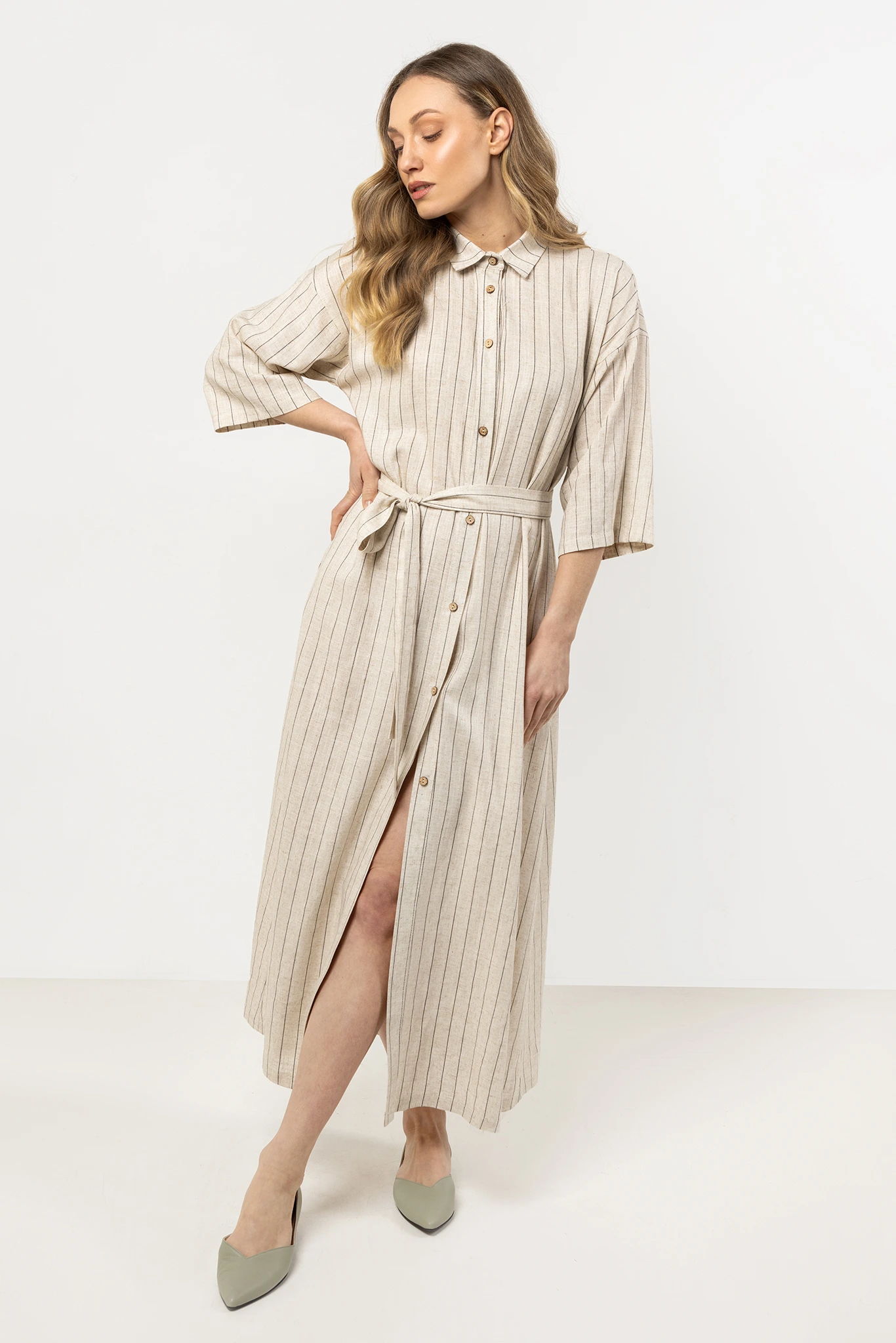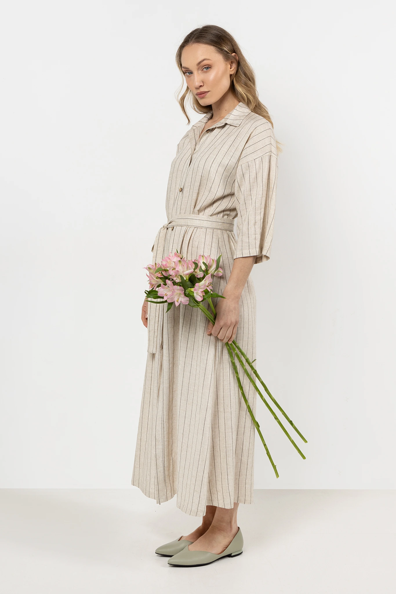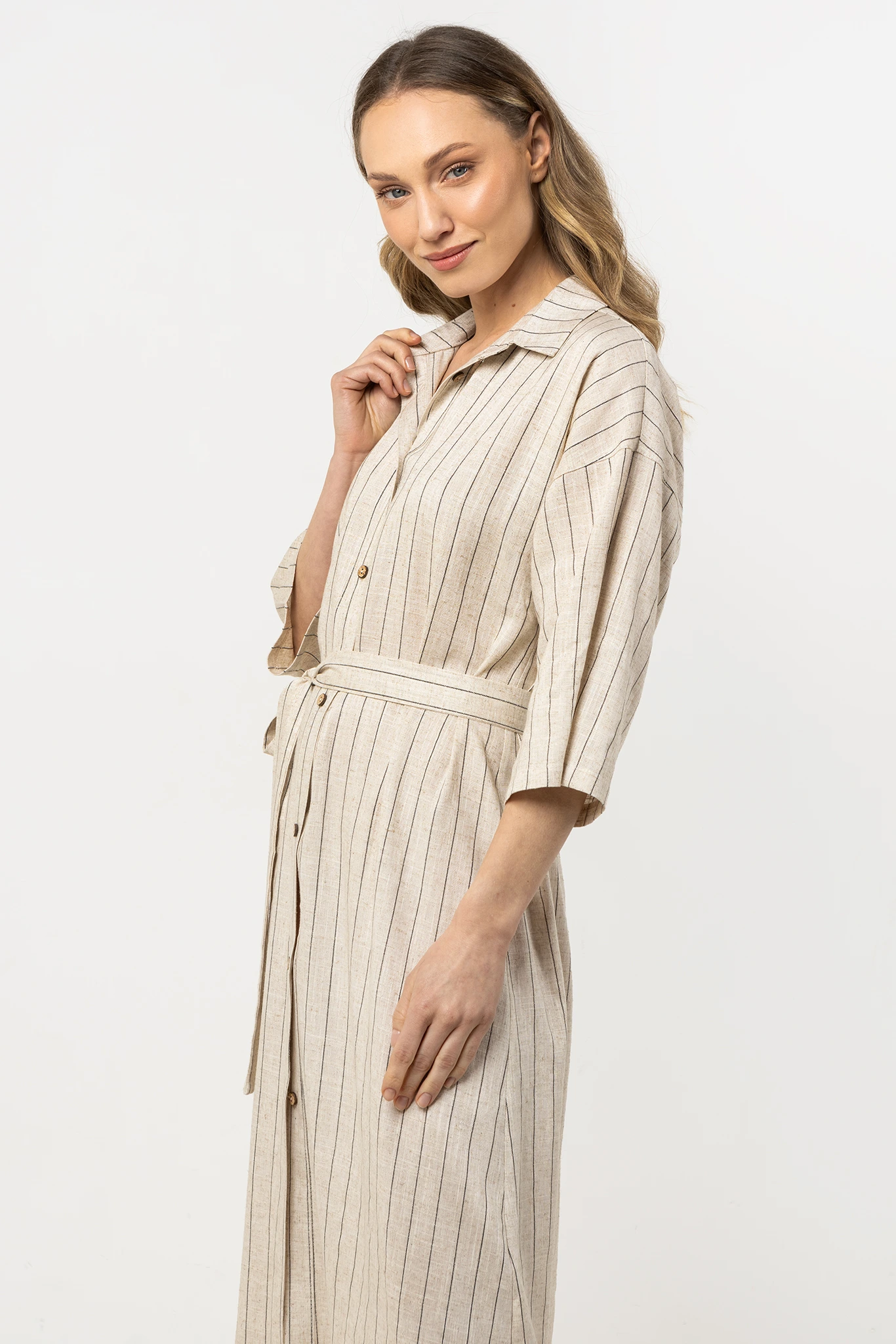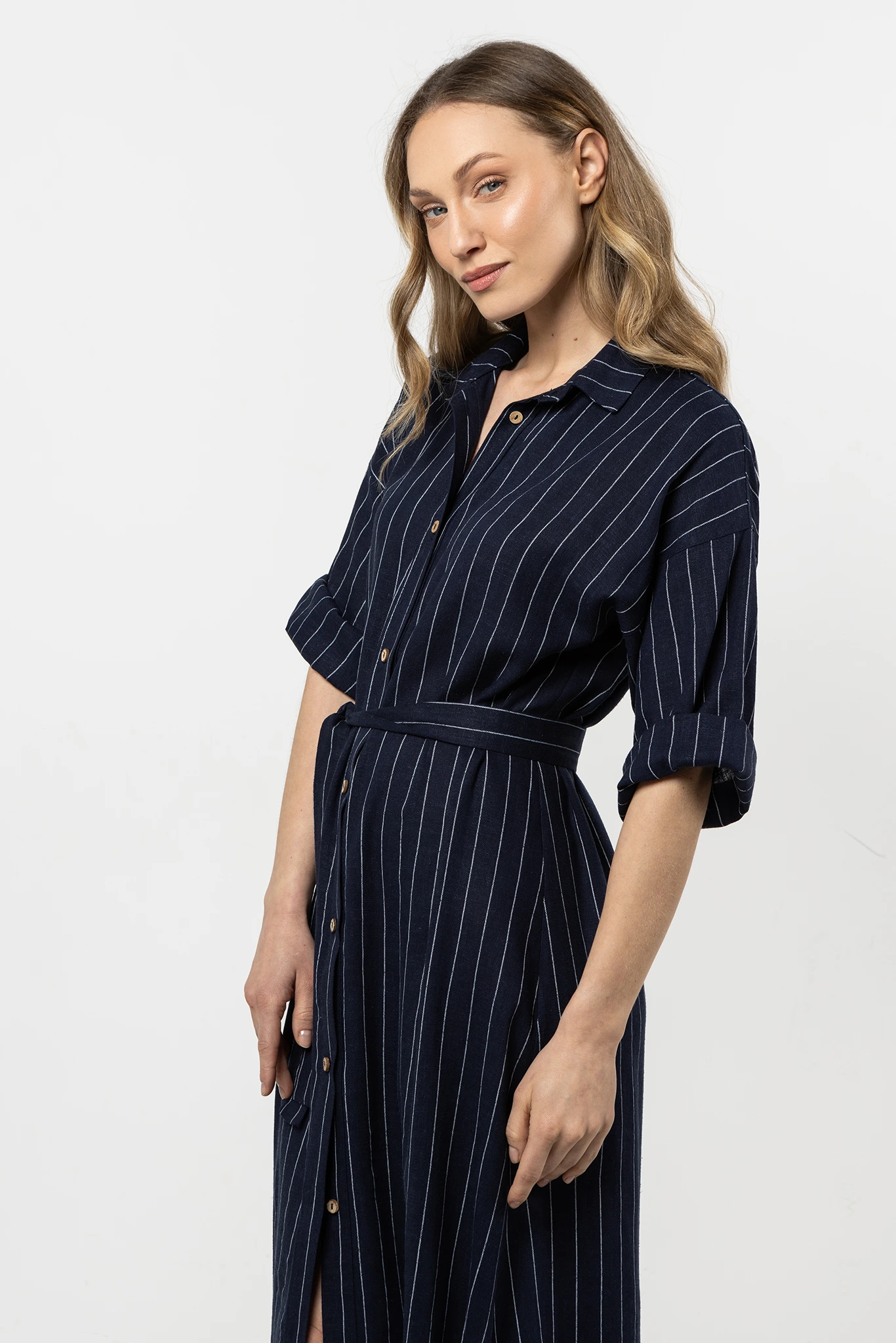 Sukienka koszulowa z lnu z guzikami i paskiem