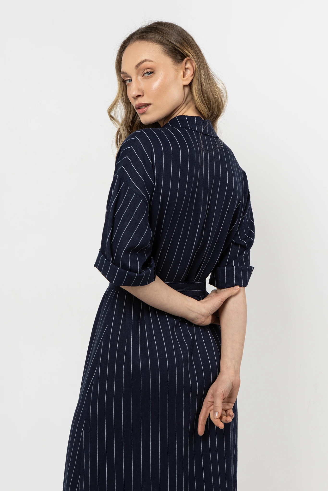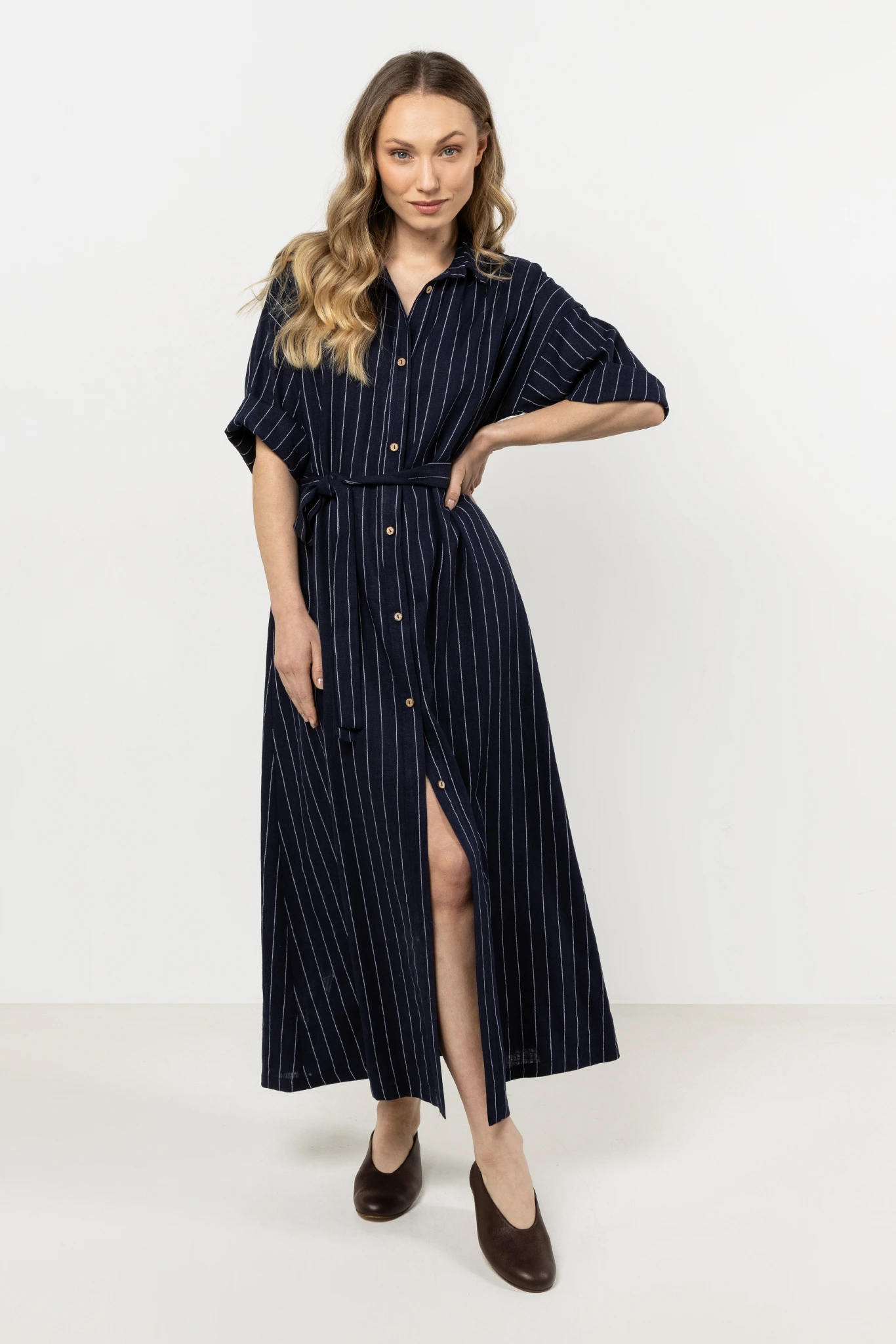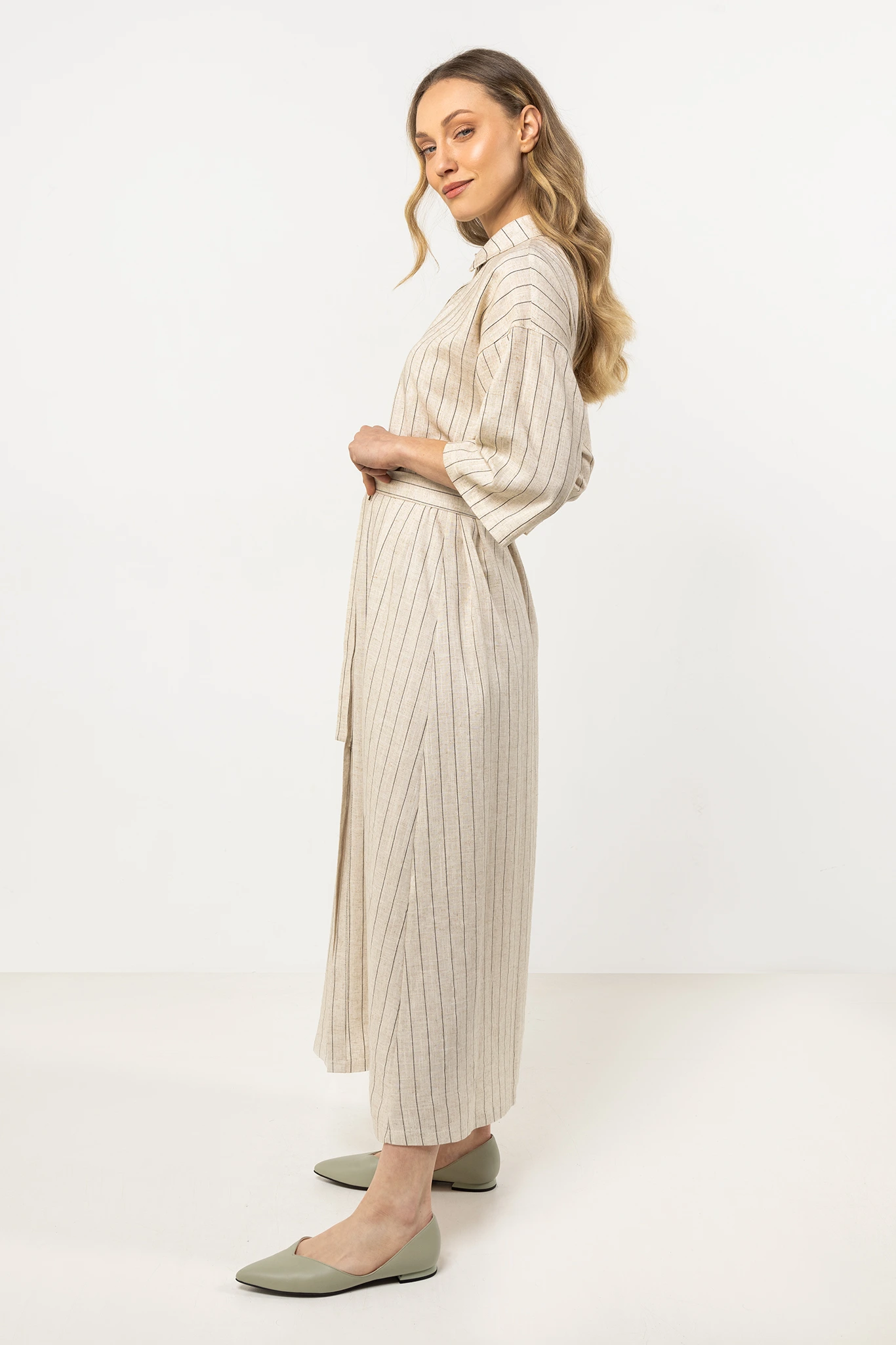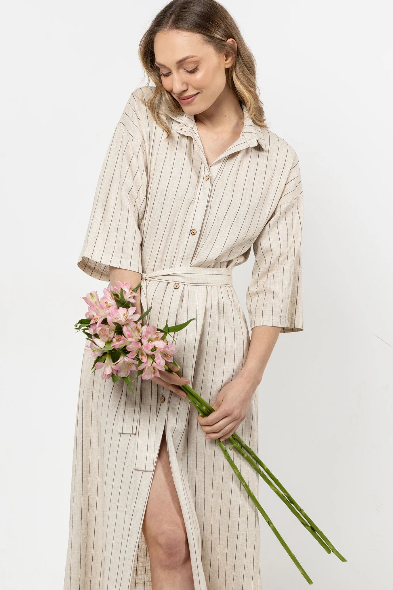 Sukienka koszulowa z lnu z guzikami i paskiem