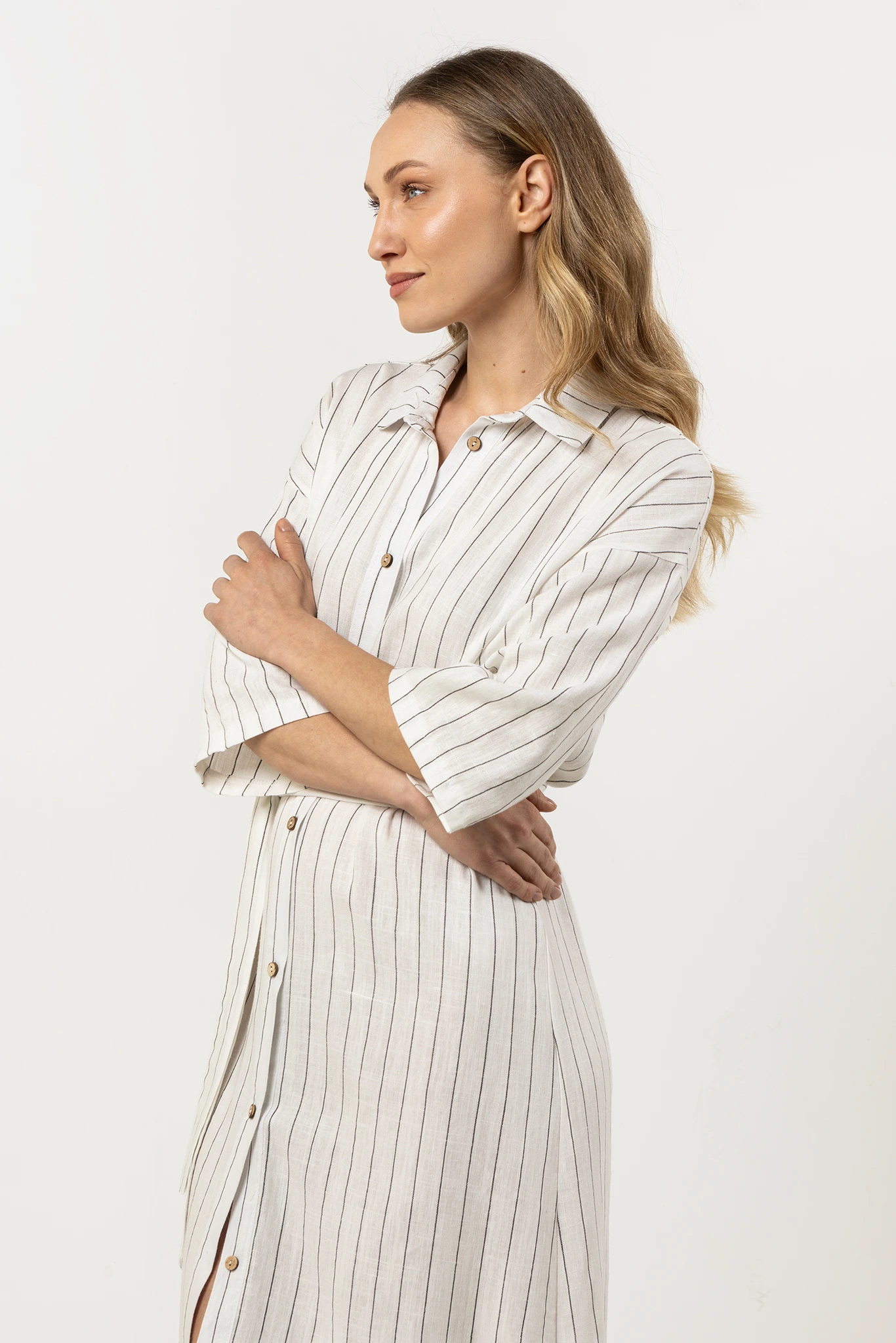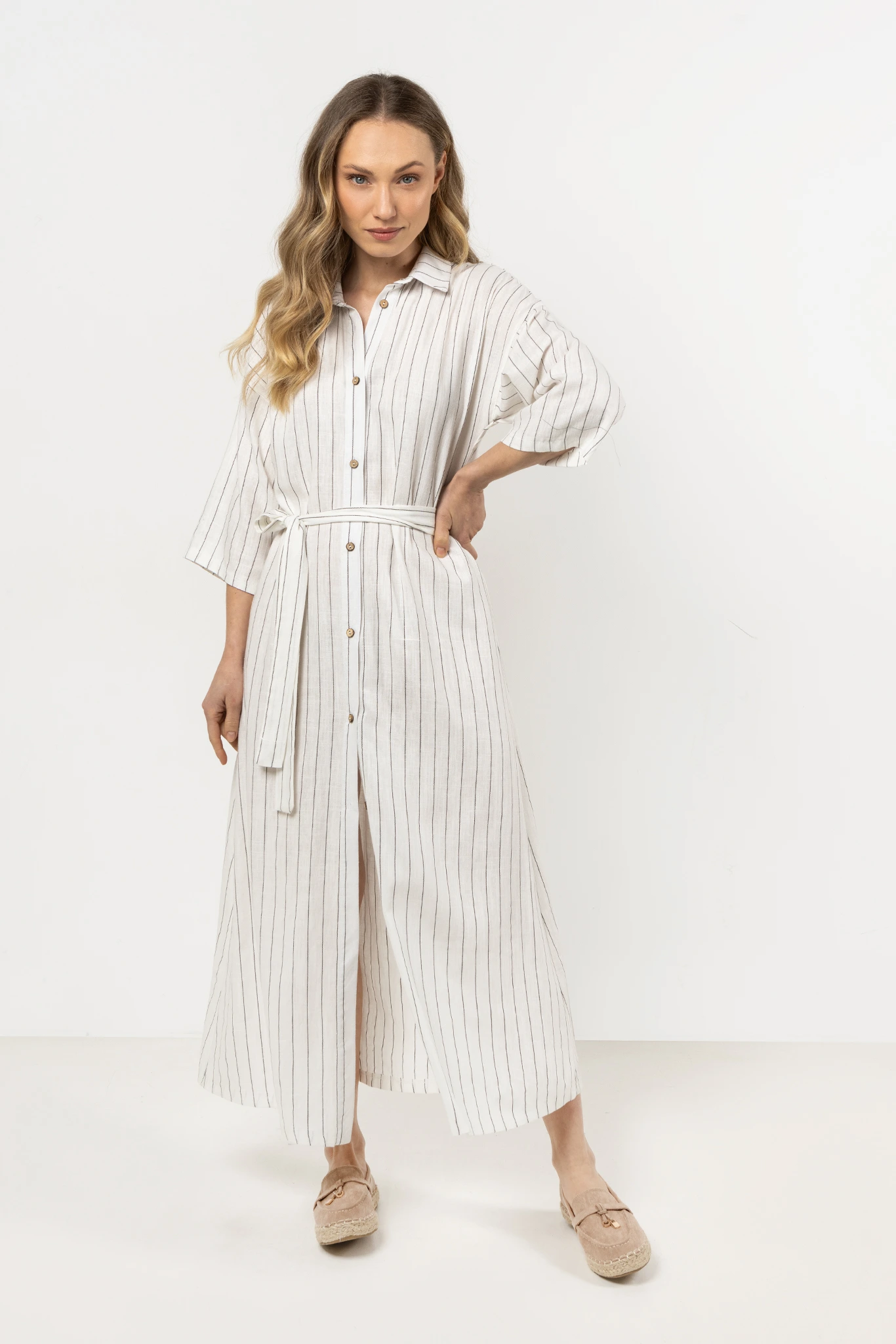 Zapięcie na guziki na całej długości umożliwia różne sposoby stylizacji – możesz nosić ją jako klasyczną sukienkę lub rozpiętą, jako długą koszulę narzutkę. Klasyczny kołnierzyk nadaje całości eleganckiego charakteru, a rękawy ¾ zapewniają wygodę i przewiewność, sprawdzając się w każdą pogodę. Idealna na co dzień, na wakacje lub na weekendowy spacer.