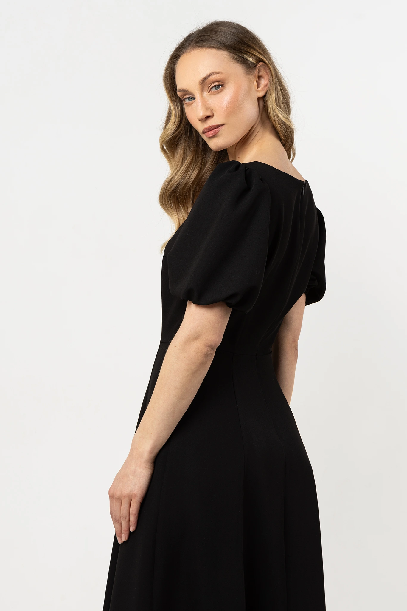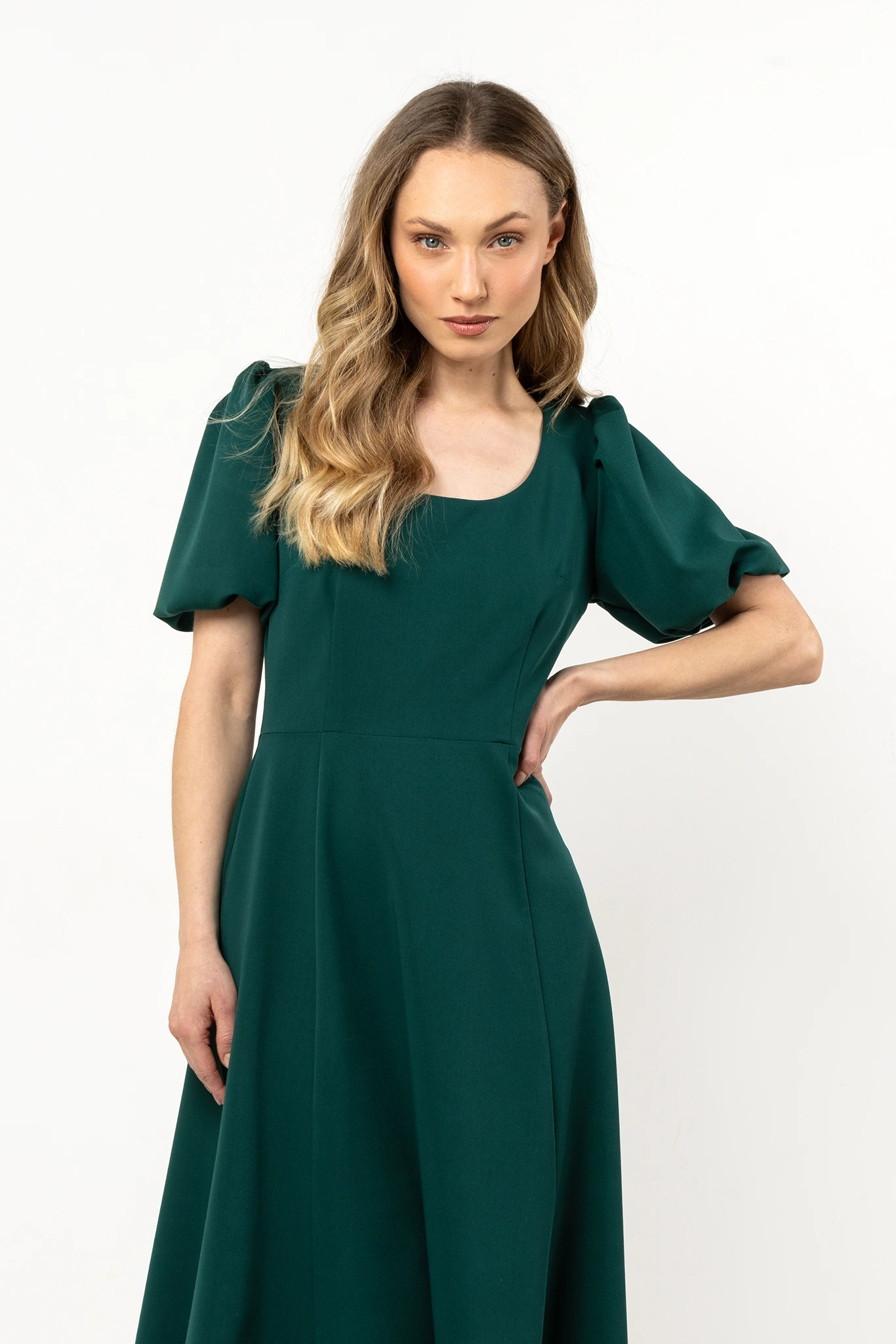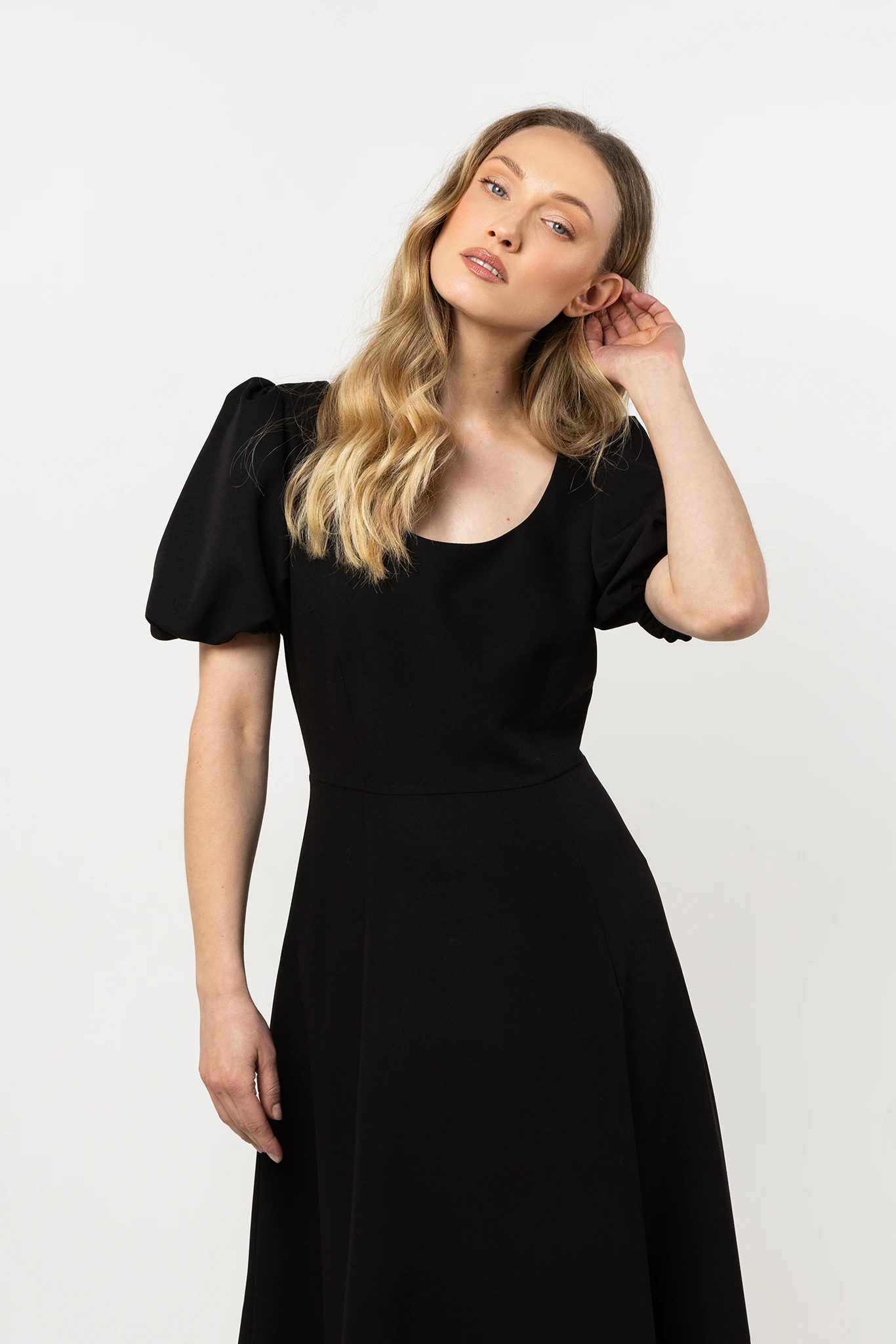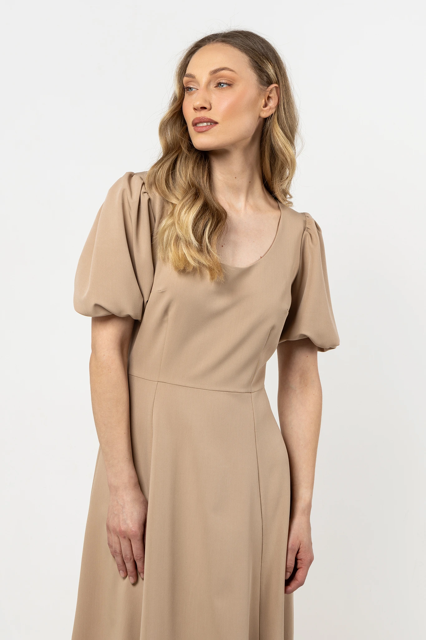 Sukienka midi z bufiastymi rękawami i krytym zamkiem, która łączy klasykę z subtelną nutą romantyzmu. Dopasowana góra pięknie podkreśla talię, a szeroki, rozkloszowany dół nadaje sylwetce lekkości i swobody. Dekolt w kształcie łagodnego półokręgu subtelnie eksponuje linię szyi i obojczyków, dodając całości kobiecego uroku.