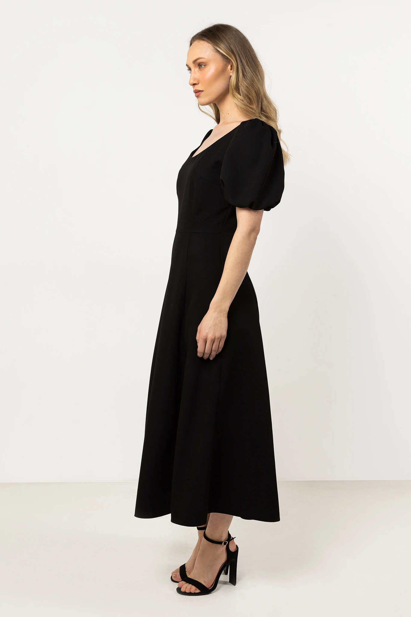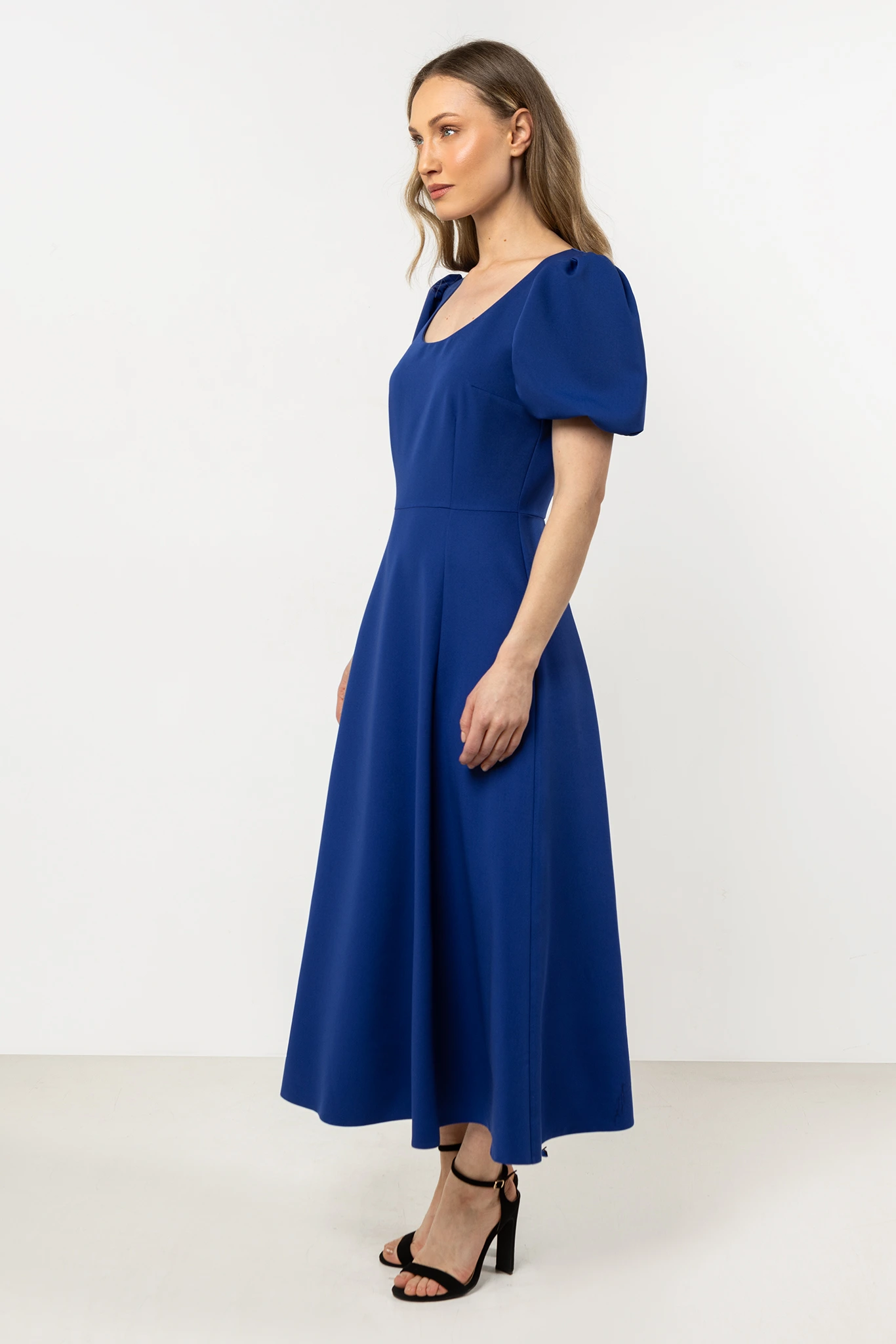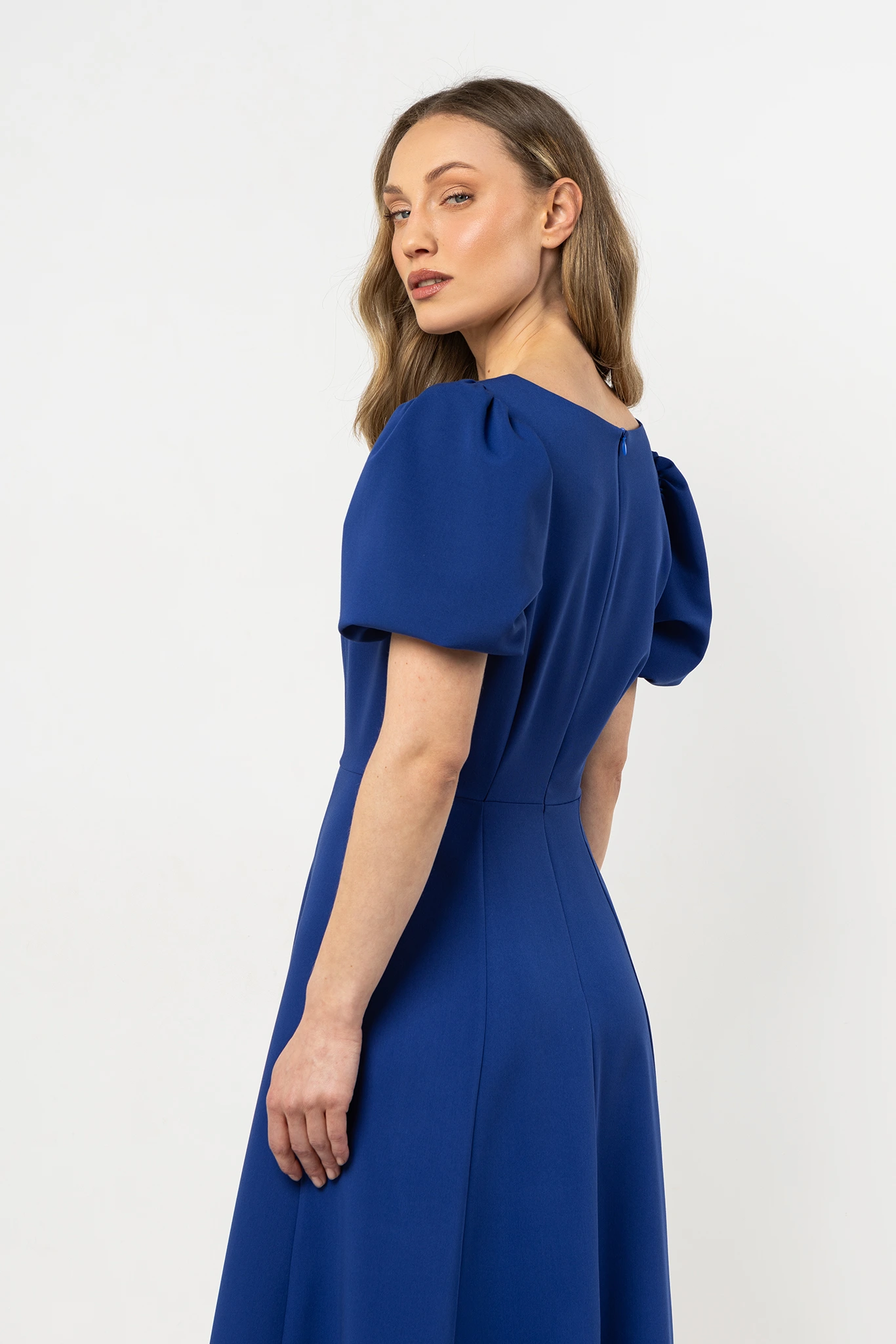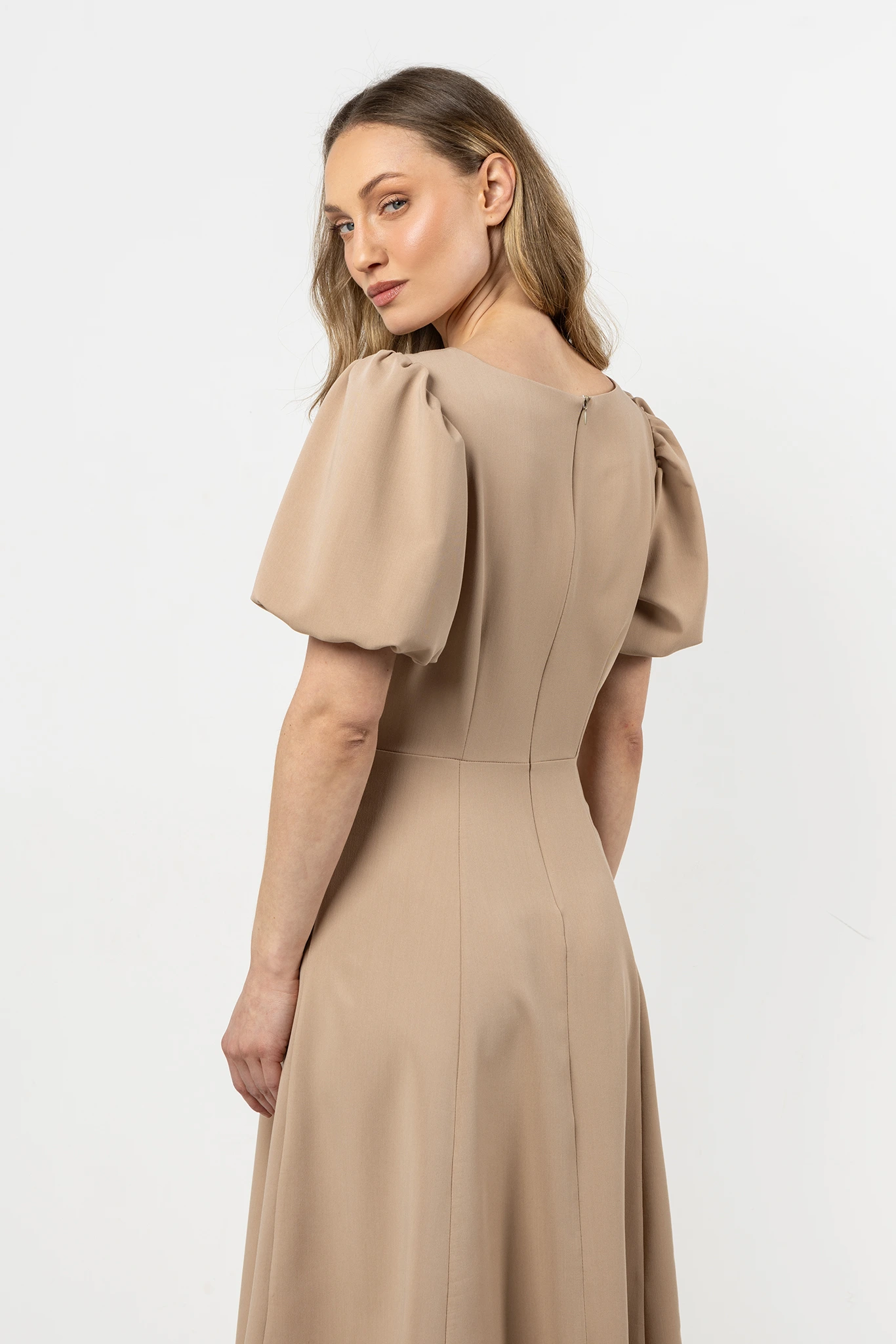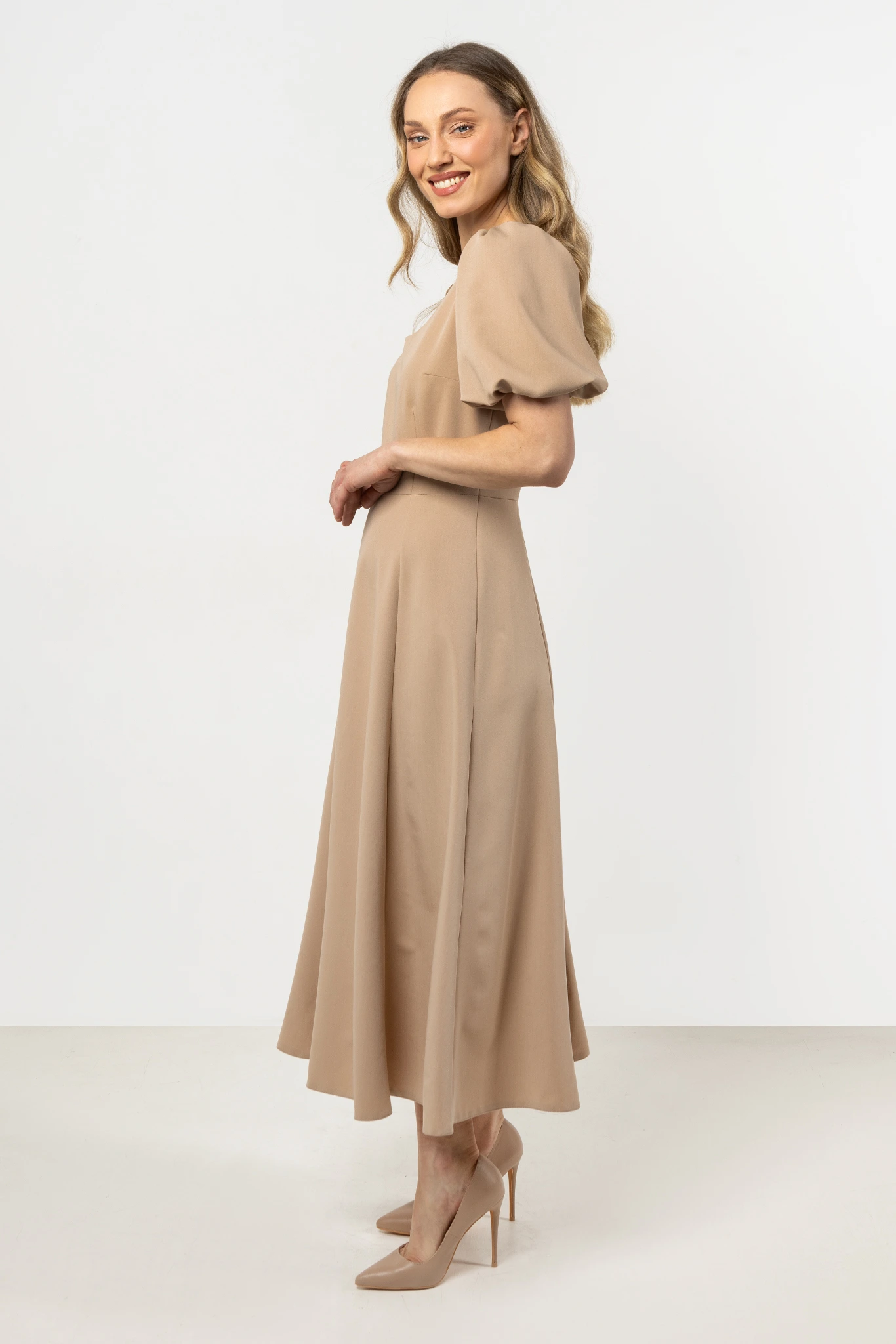 Sukienka midi z bufiastymi rękawami i krytym zamkiem, która łączy klasykę z subtelną nutą romantyzmu. Dopasowana góra pięknie podkreśla talię, a szeroki, rozkloszowany dół nadaje sylwetce lekkości i swobody. Dekolt w kształcie łagodnego półokręgu subtelnie eksponuje linię szyi i obojczyków, dodając całości kobiecego uroku.