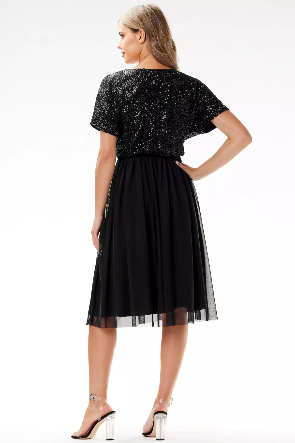 Sukienka midi z cekinową górą i dekoltem w łódkę