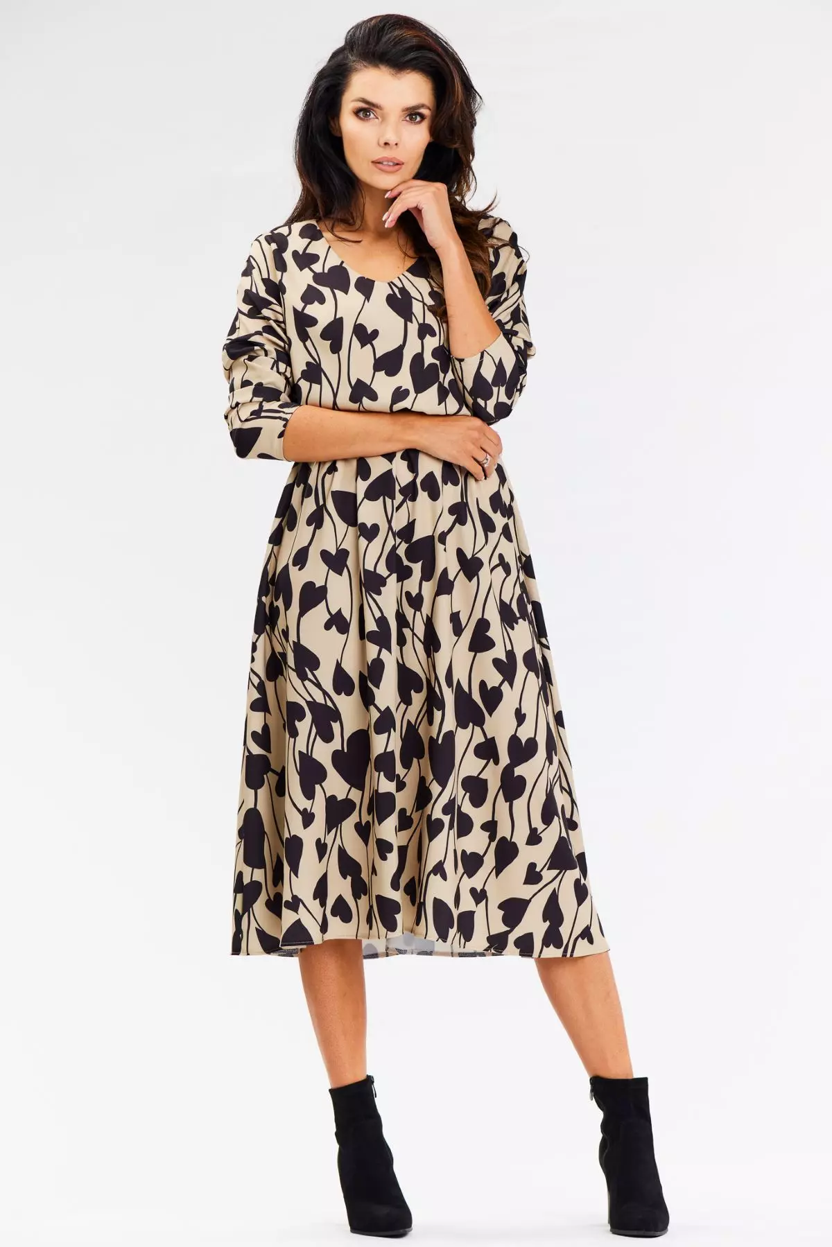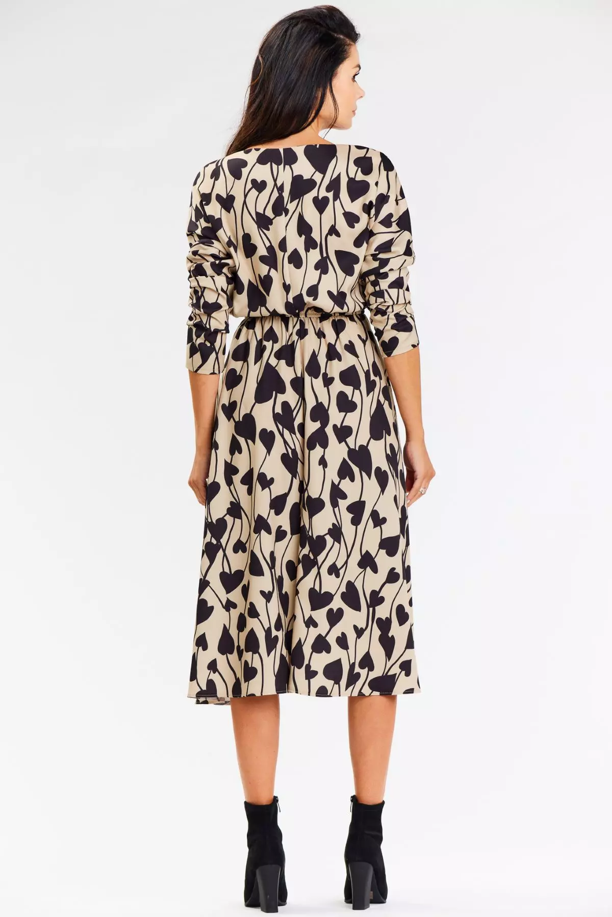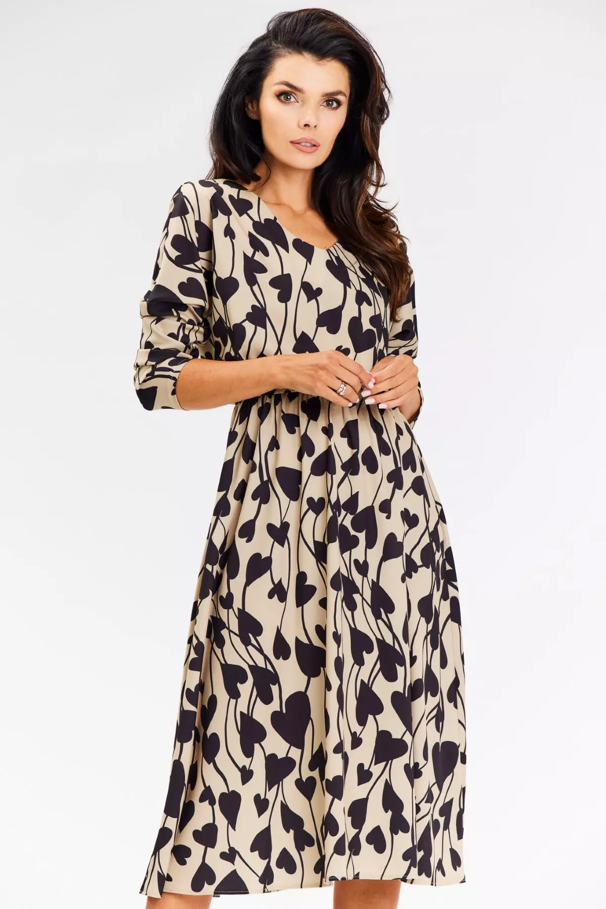 Sukienka midi z wzorem w serca to doskonały wybór na każdą okazję, od codziennych zestawień po bardziej eleganckie wyjścia. Uszyta z materiału najwyższej jakości, gwarantuje wygodę przez cały dzień. Luźny, zwiewny fason subtelnie podkreśla sylwetkę, dodając kobiecej lekkości i stylu. Długie rękawy oraz dekolt w kształcie litery V nadają sukience elegancki, a jednocześnie modny wygląd. To idealna propozycja dla kobiet, które chcą połączyć styl, wygodę i ponadczasową elegancję.