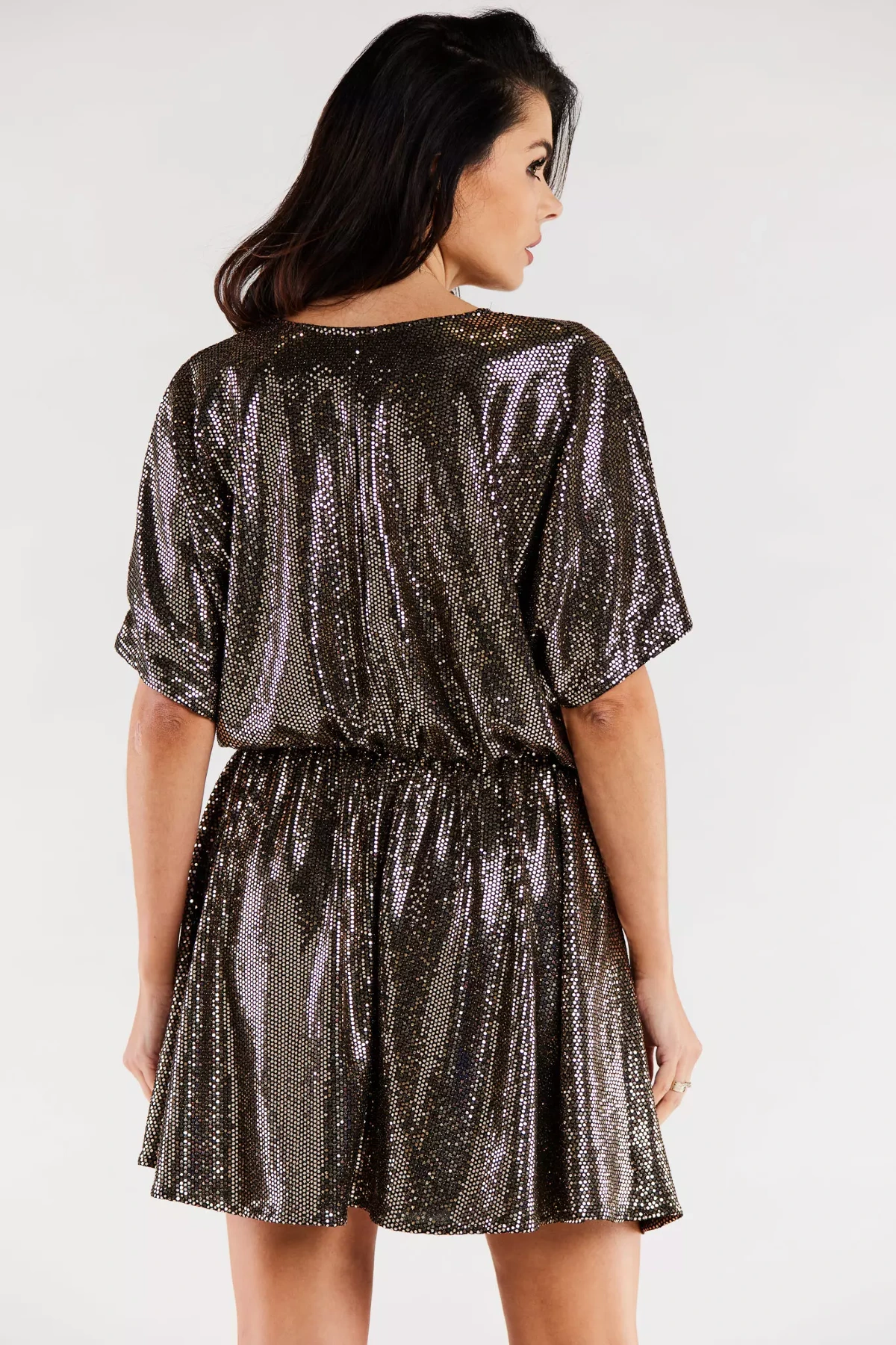 Sukienka mini rozkloszowana z dekoltem w serek to model, który przyciąga uwagę dzięki swojej błyszczącej, wieczorowej tkaninie, mieniającej się w świetle. Zbluzowana góra z krótkimi, luźnymi rękawami została subtelnie przełamana zmysłowym dekoltem V, który pięknie eksponuje biust i obojczyki. Elastyczna gumka w talii doskonale podkreśla figurę, oddzielając dopasowaną górę od rozkloszowanego dołu. Ta sukienka jest idealnym wyborem na imprezy i wyjątkowe okazje, zwłaszcza w połączeniu z obuwiem na szpilce i elegancką kopertówką.