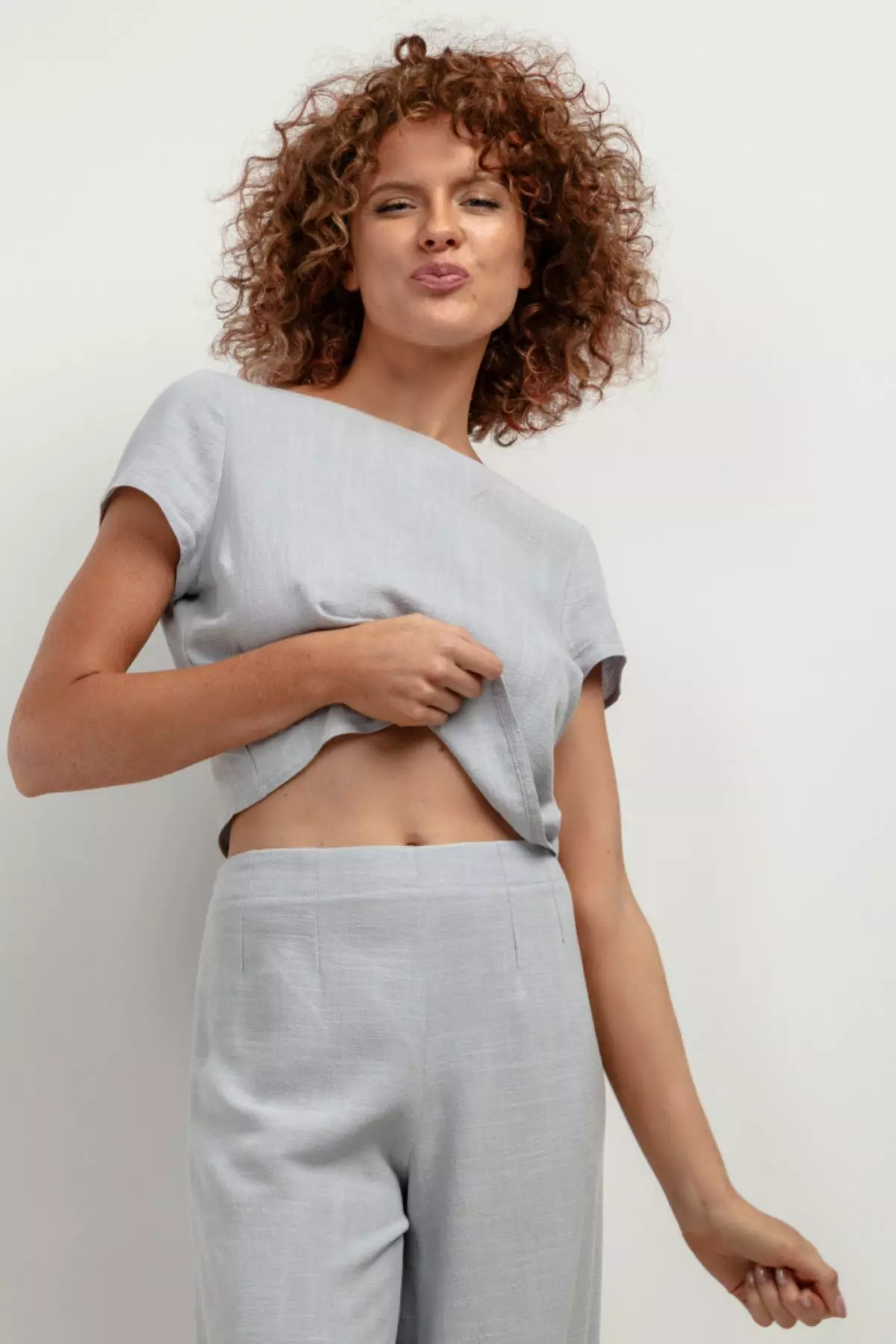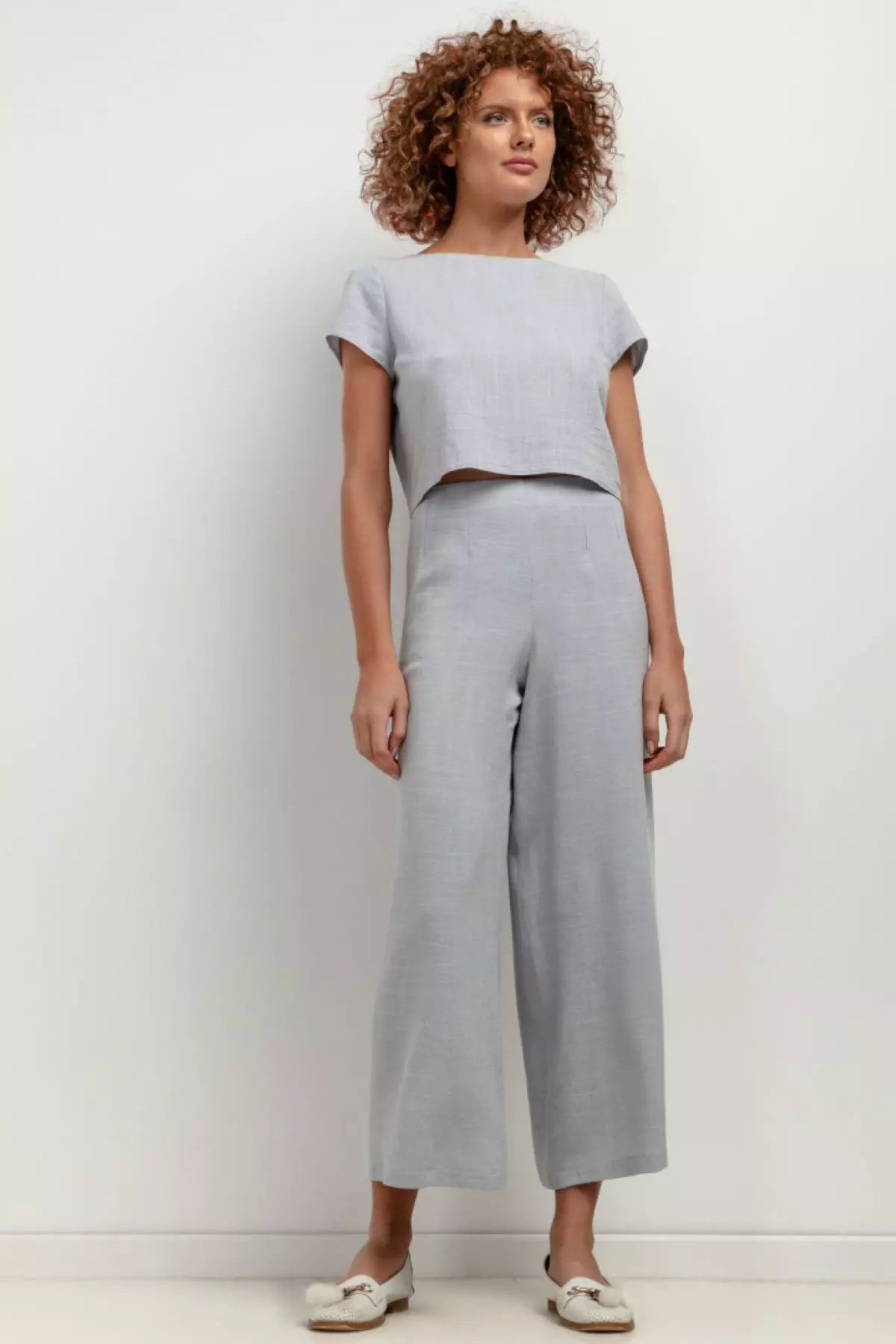 Szary zestaw damski z szerokimi nogawkami z domieszką lnu