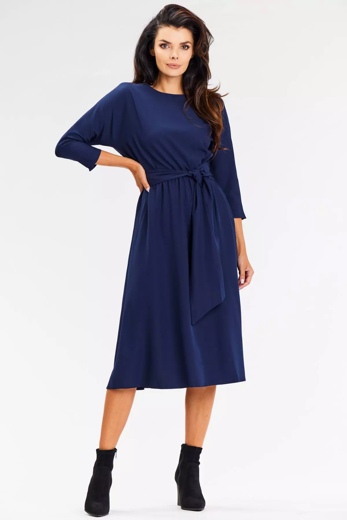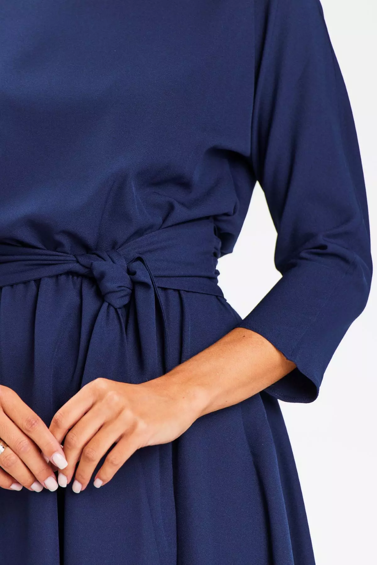 Szykowna sukienka o minimalistycznym kroju z wiązaniem, doskonała zarówno na oficjalne, jak i codzienne wyjścia. Uszyta z materiału najwyższej jakości, gwarantuje wygodę noszenia przez cały dzień. Pasek w talii umożliwia regulację dopasowania, subtelnie podkreślając sylwetkę i dodając elegancji. Długie rękawy oraz delikatnie rozkloszowany dół nadają sukience unikalny styl, łącząc komfort z modnym wyglądem. Idealna do biura, na spotkania lub specjalne okazje, świetnie komponuje się z eleganckimi dodatkami, tworząc wyrafinowany i stylowy zestaw.