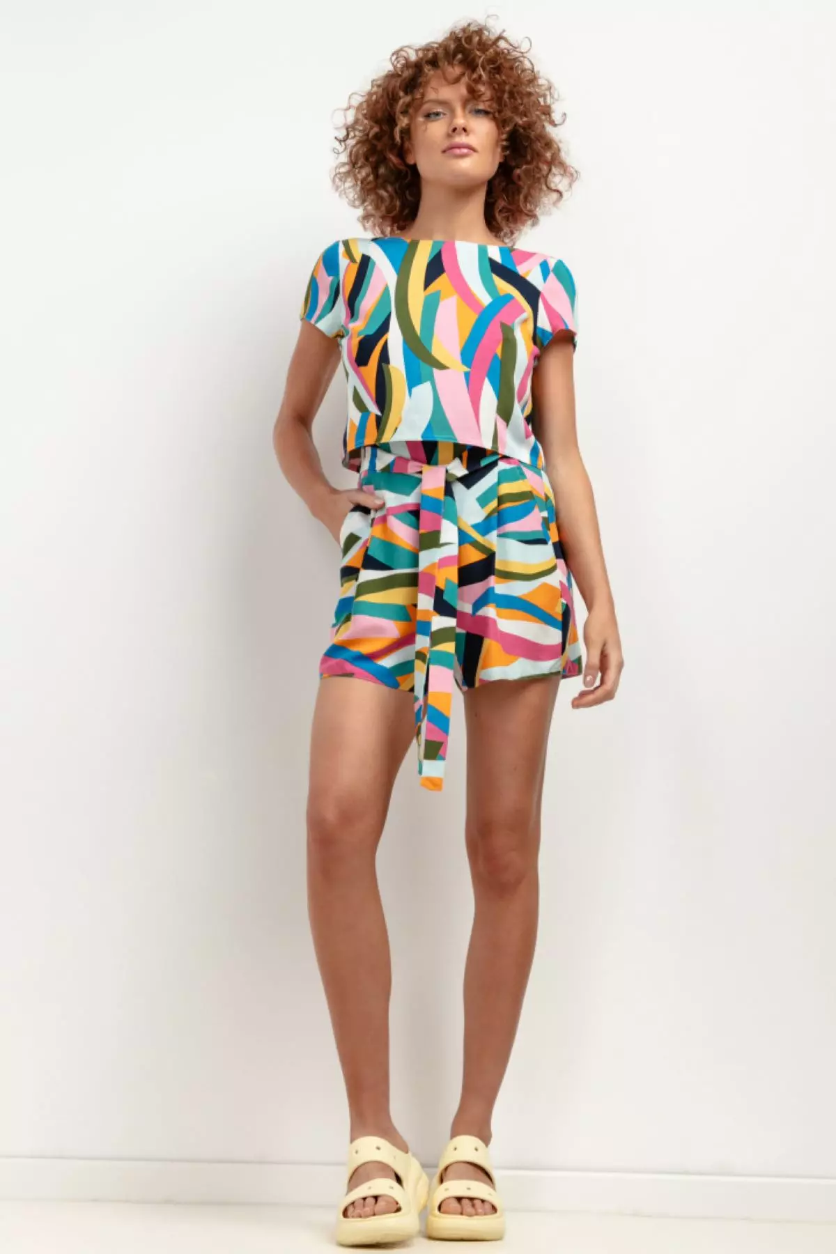 Unikalny zestaw bluzki i szortów to doskonała propozycja dla wielbicielek mody, które cenią sobie śmiałe wzory i wygodę noszenia. Stworzony z wysokogatunkowej wiskozy, gwarantuje niezwykłą miękkość i przewiewność, idealnie nadając się na gorące dni. Wielobarwny wzór łączy różnorodne, intensywne kolory, które dodają energii i wyróżniają w tłumie. Zestaw składa się z krótkiej bluzki oraz szortów z paskiem, tworząc spójną i modną stylizację. To opcja dla kobiet, które chcą wyrazić swoją indywidualność poprzez modę i nie boją się eksperymentować z kolorami.