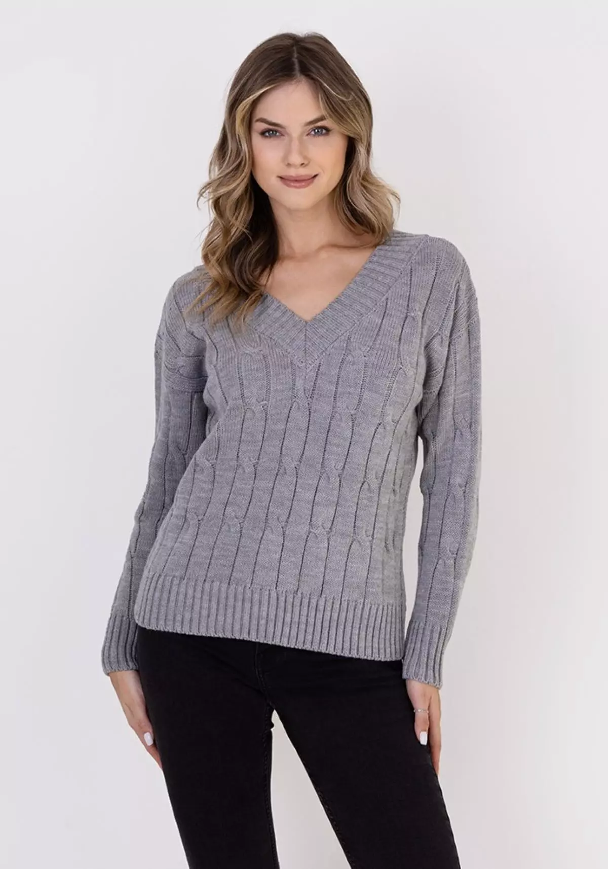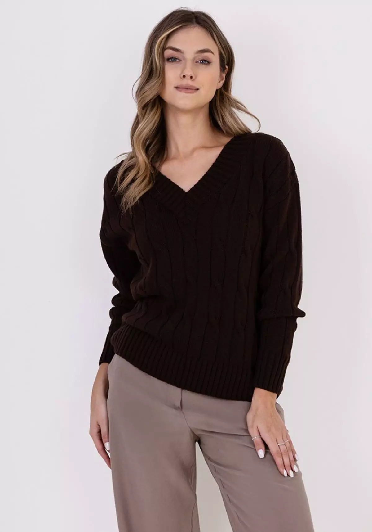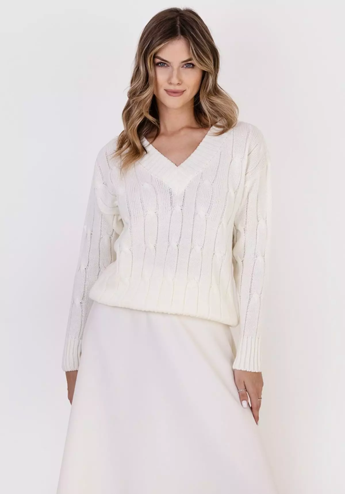 Zimowy sweter z warkoczowym splotem to doskonały przykład połączenia prostoty z dbałością o detale. Jego wyrafinowany dekolt w kształcie litery V subtelnie podkreśla linię szyi, nadając całości elegancji i klasy. Dekoracyjne ściągacze przy mankietach i na dole swetra tworzą harmonijną kompozycję z głównym wzorem warkocza. Ten sweter nie tylko doskonale sprawdza się w praktyce, ale również emanuje wyjątkową elegancją, idealnie dopasowując się do różnych sylwetek. Bez względu na okazję, zawsze poczujesz się w nim wyjątkowo.