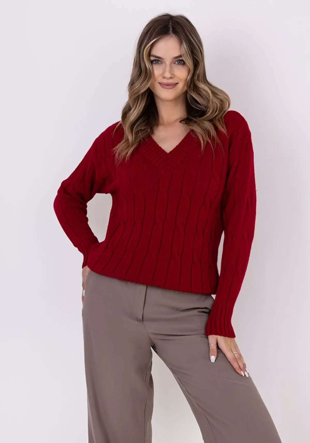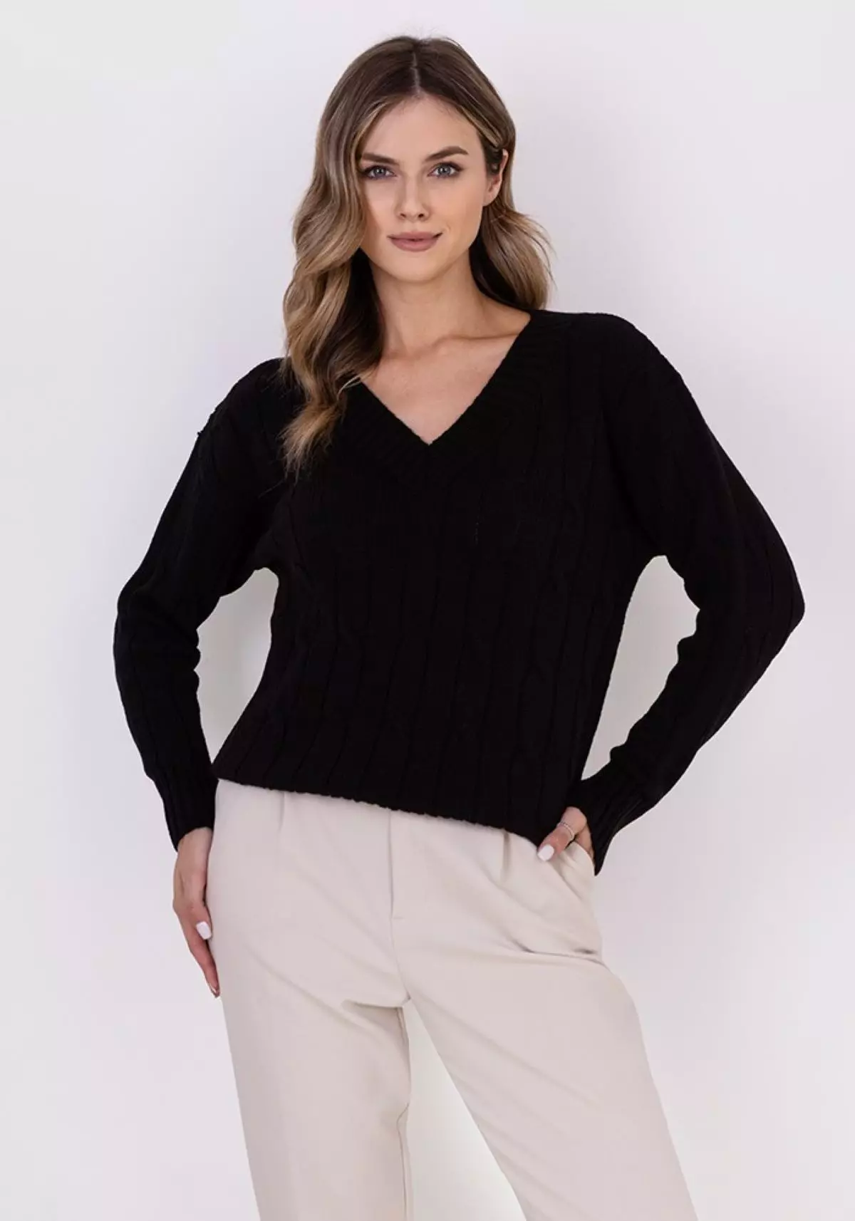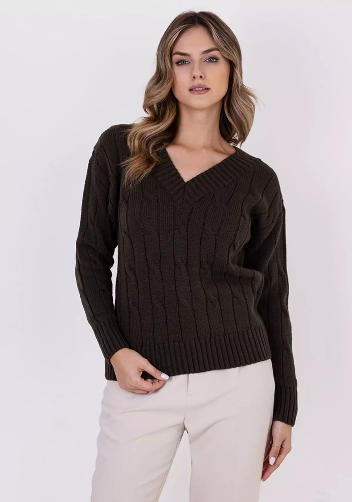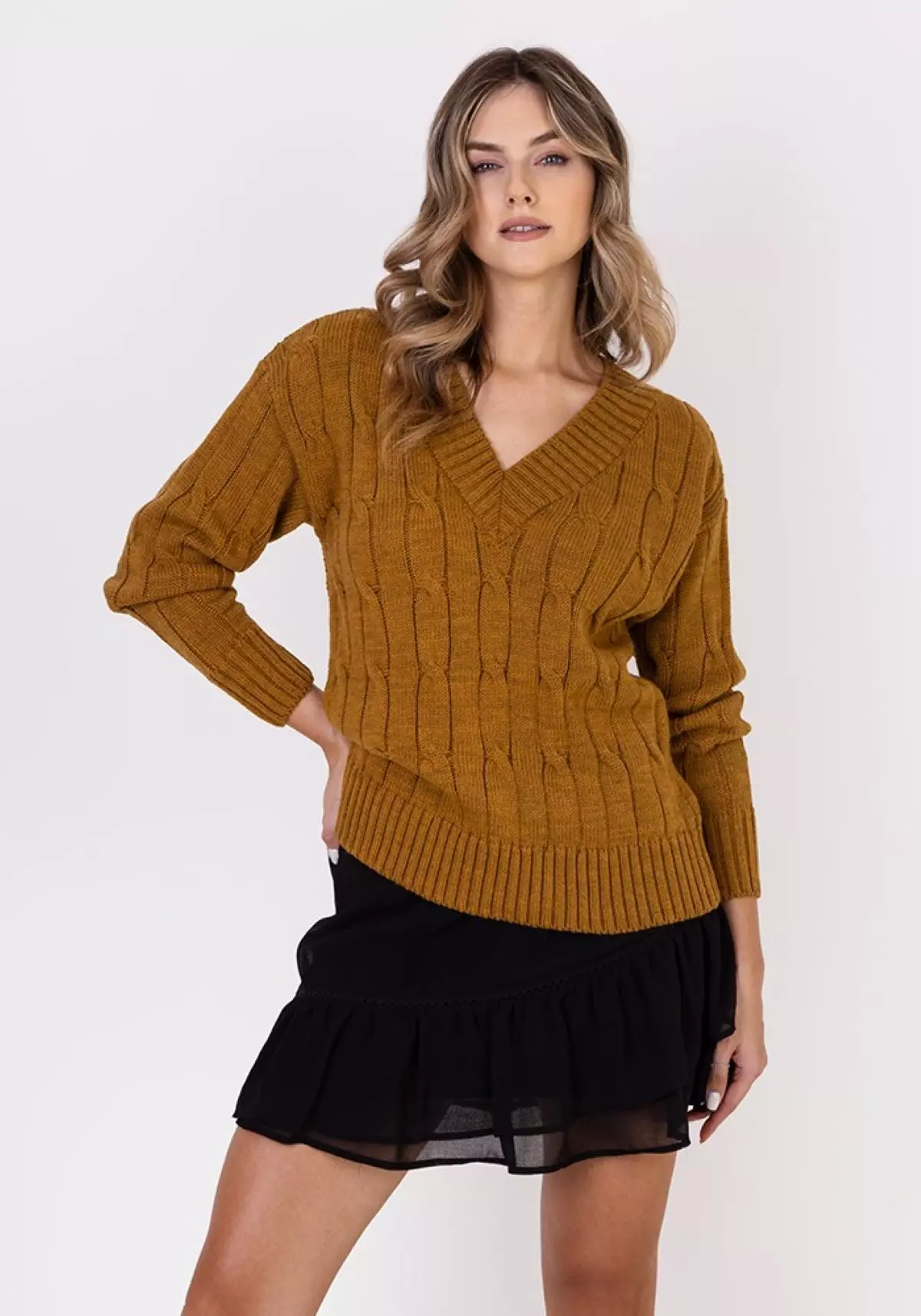 Zimowy sweter z warkoczowym splotem to doskonały przykład połączenia prostoty z dbałością o detale. Jego wyrafinowany dekolt w kształcie litery V subtelnie podkreśla linię szyi, nadając całości elegancji i klasy. Dekoracyjne ściągacze przy mankietach i na dole swetra tworzą harmonijną kompozycję z głównym wzorem warkocza. Ten sweter nie tylko doskonale sprawdza się w praktyce, ale również emanuje wyjątkową elegancją, idealnie dopasowując się do różnych sylwetek. Bez względu na okazję, zawsze poczujesz się w nim wyjątkowo.