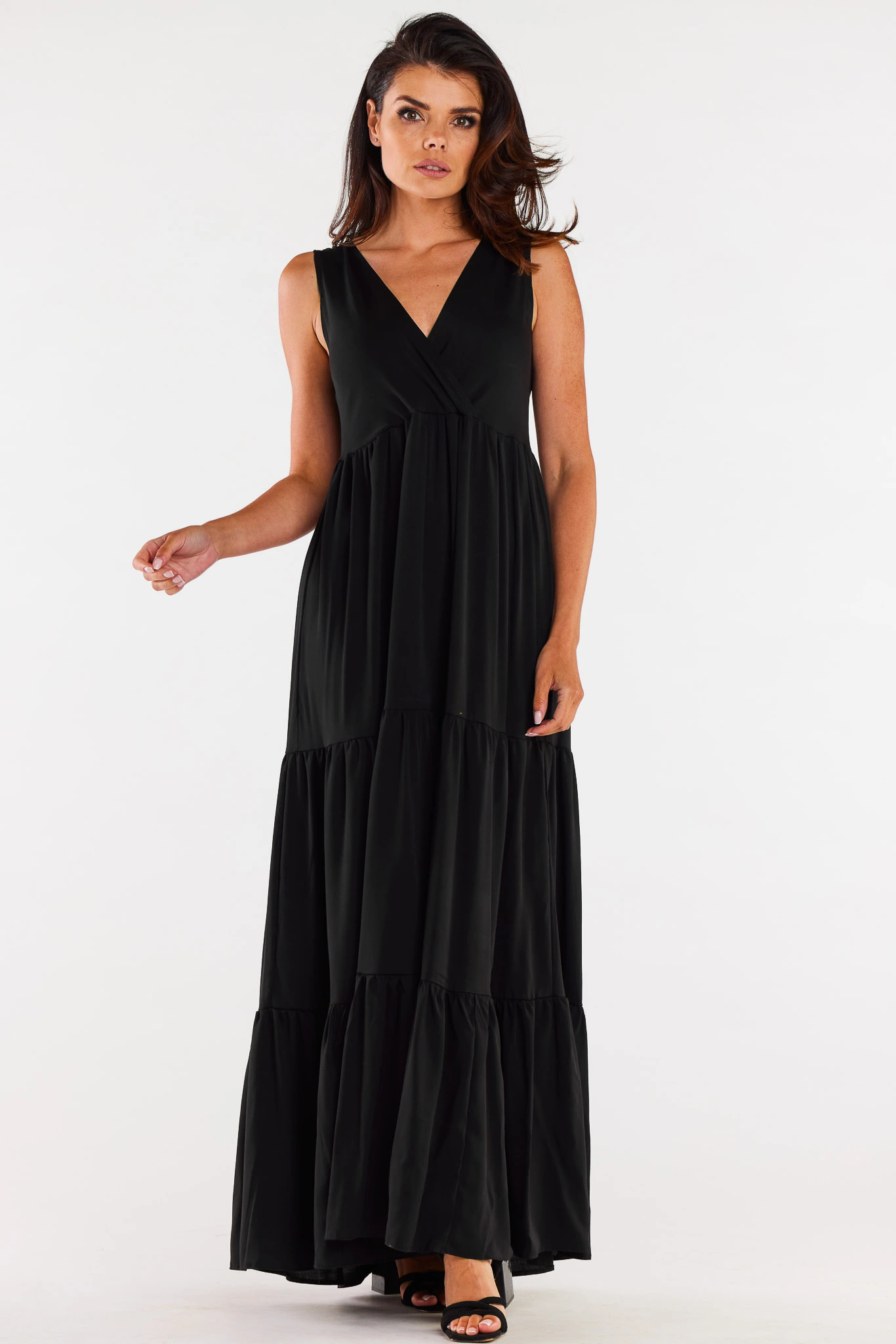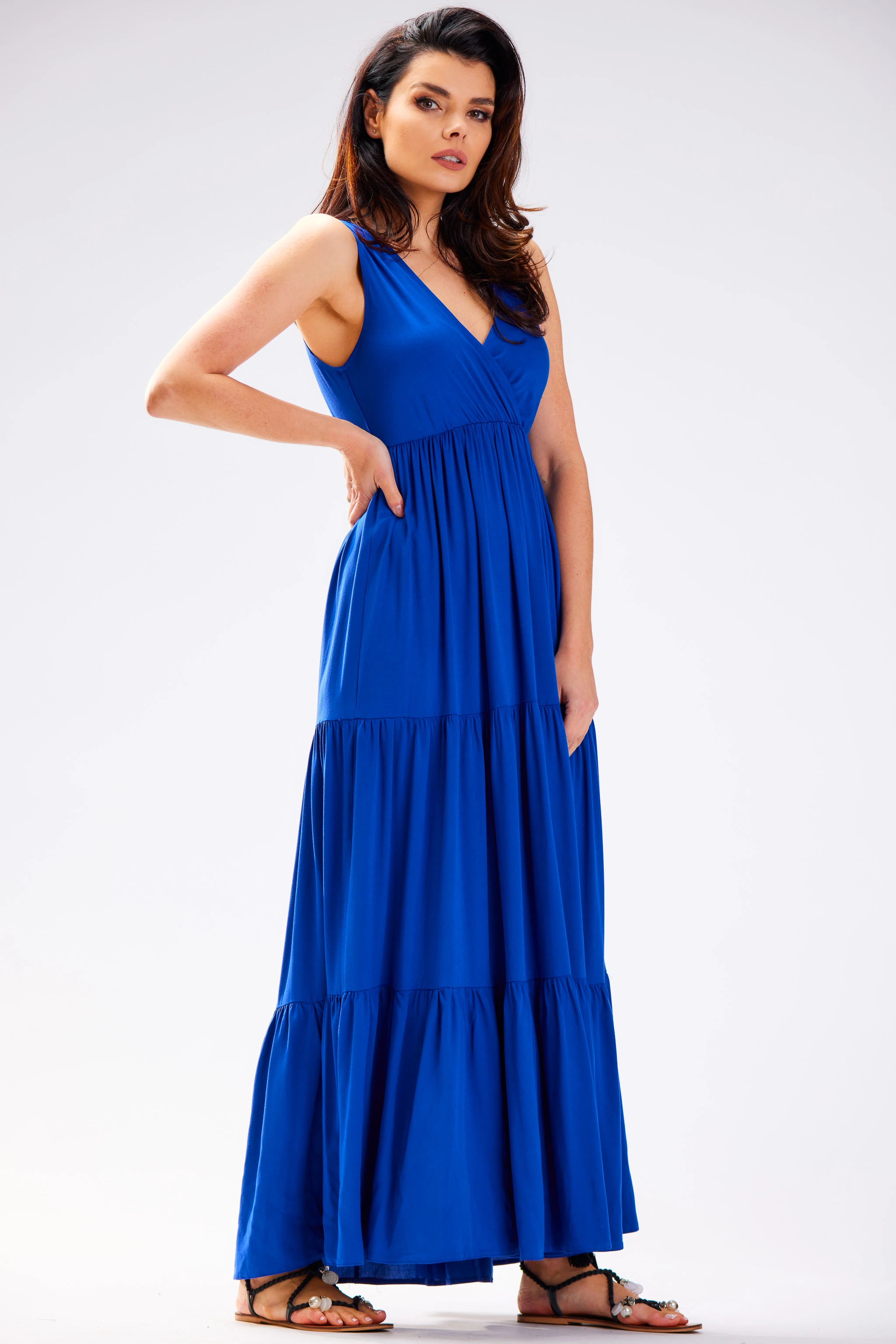 Zwiewna sukienka maxi z kopertowym dekoltem i falbanami to propozycja dla kobiet, które cenią wygodę, lekkość i efektowny wygląd w jednej stylizacji. Model ma długość maxi i miękko układa się w ruchu, dzięki czemu świetnie prezentuje się zarówno na co dzień, jak i na większe wyjścia. Kopertowa góra z dekoltem w kształcie litery V subtelnie podkreśla linię szyi i optycznie wysmukla sylwetkę. Talia jest delikatnie zaznaczona poprzez odcięcie pod biustem, co sprzyja proporcjom i zapewnia komfort noszenia. Dół składa się z warstwowych paneli z marszczeniem, które dodają sukience objętości i romantycznego charakteru. To uniwersalna sukienka damska, którą łatwo zestawisz z sandałami, espadrylami lub delikatnymi szpilkami.
